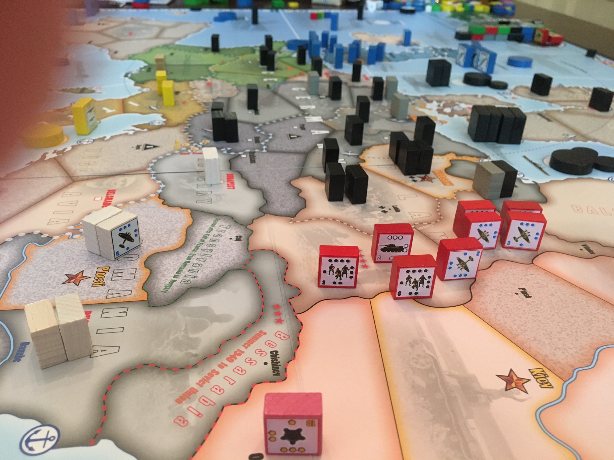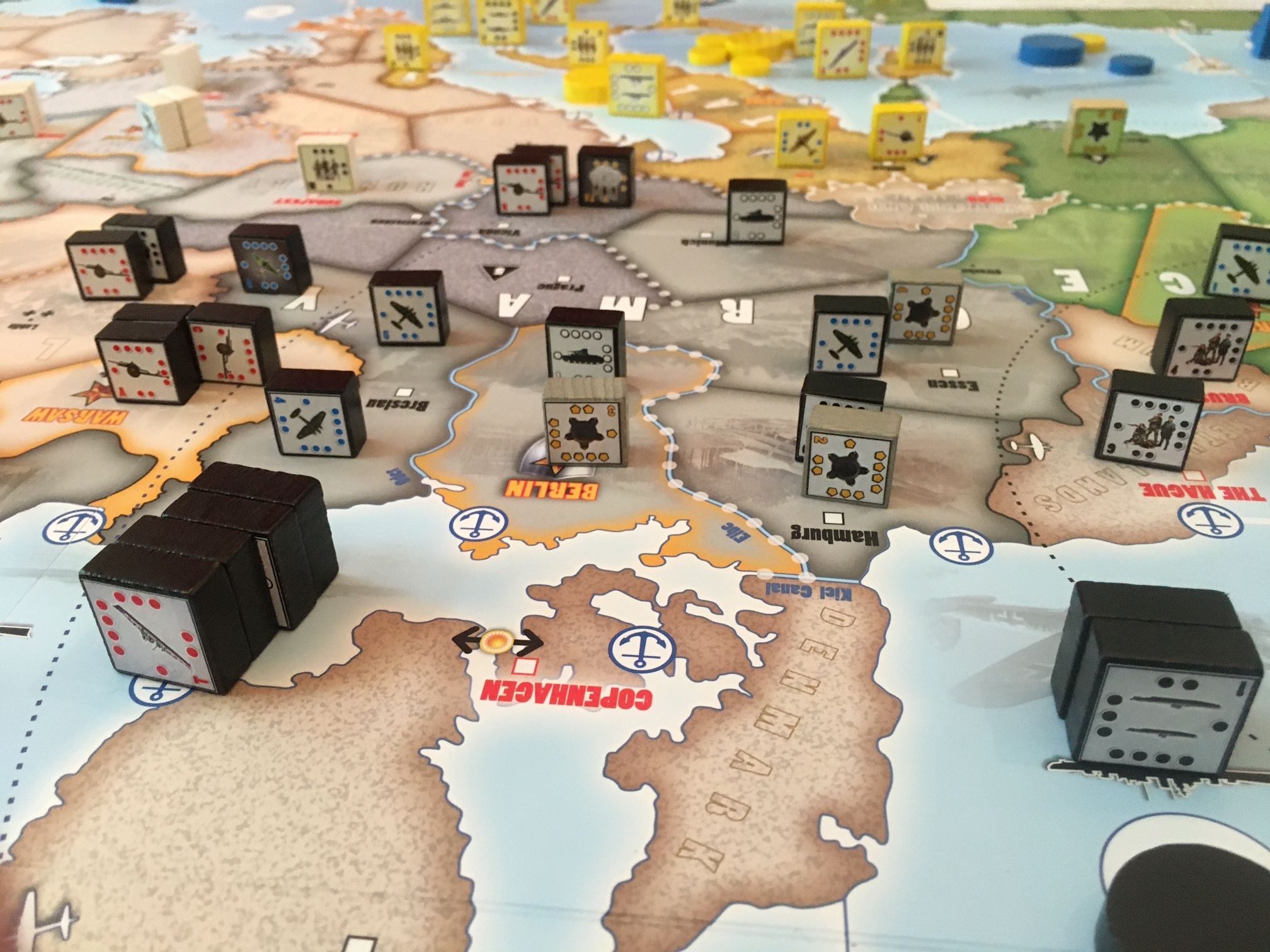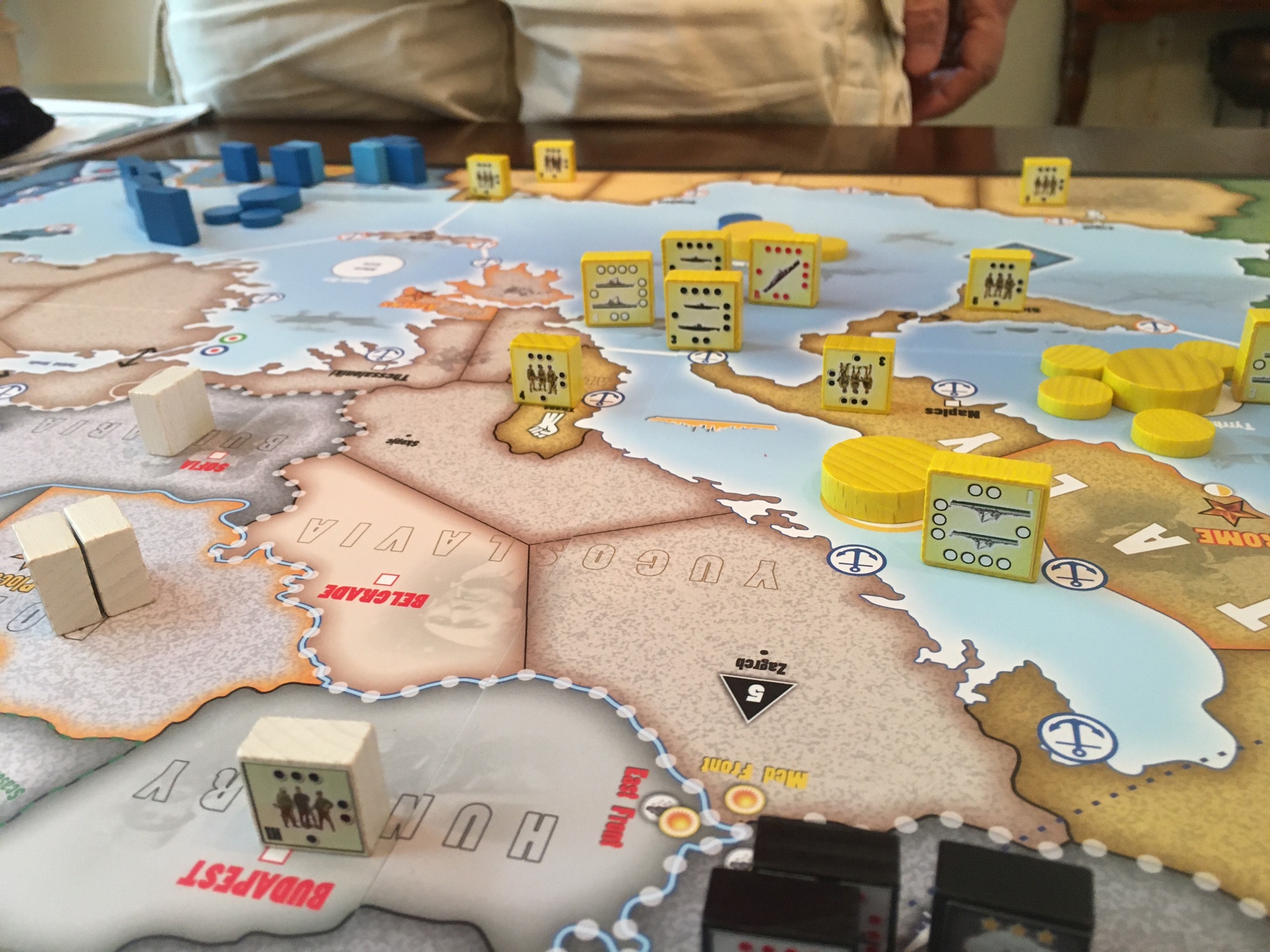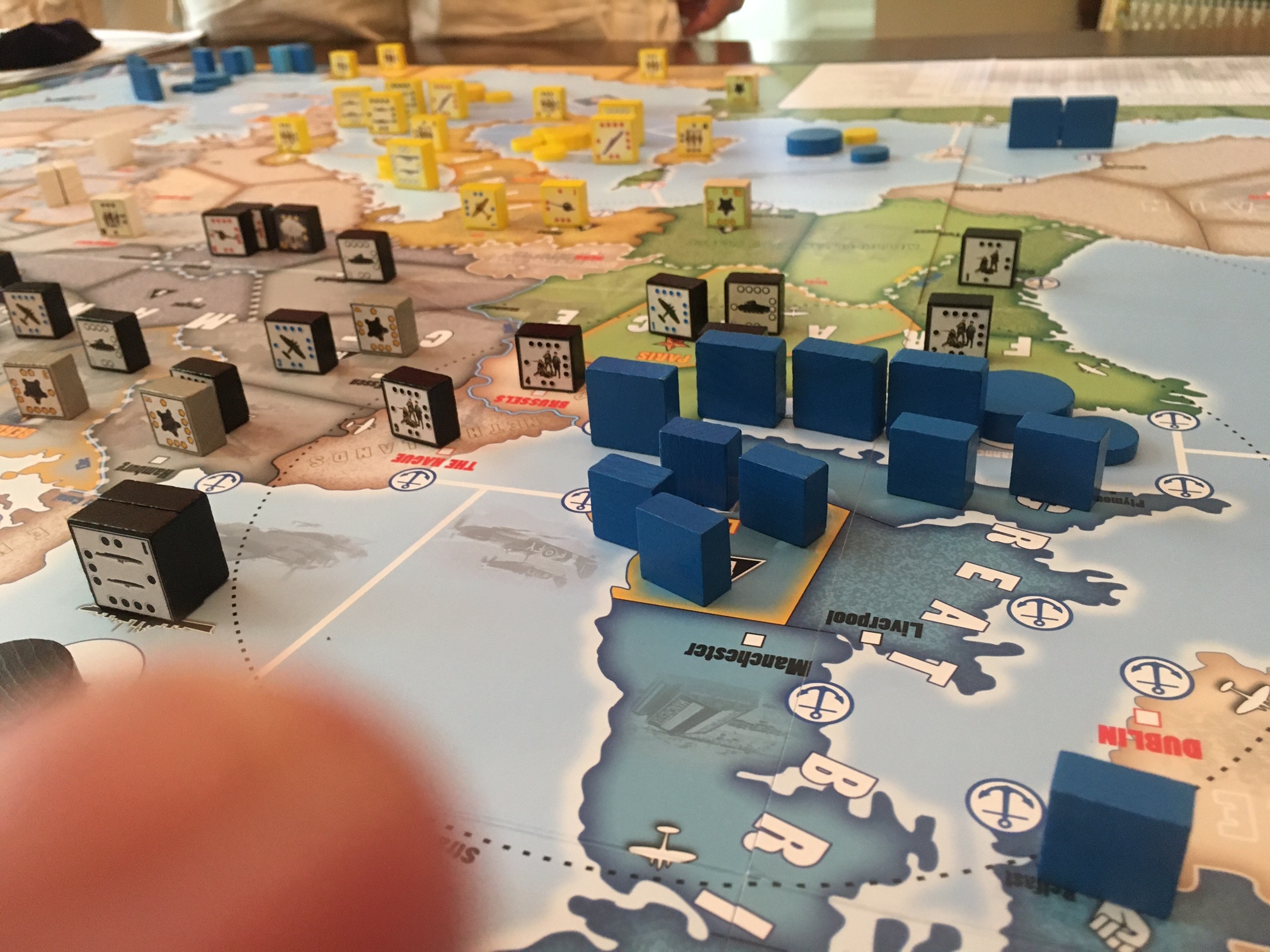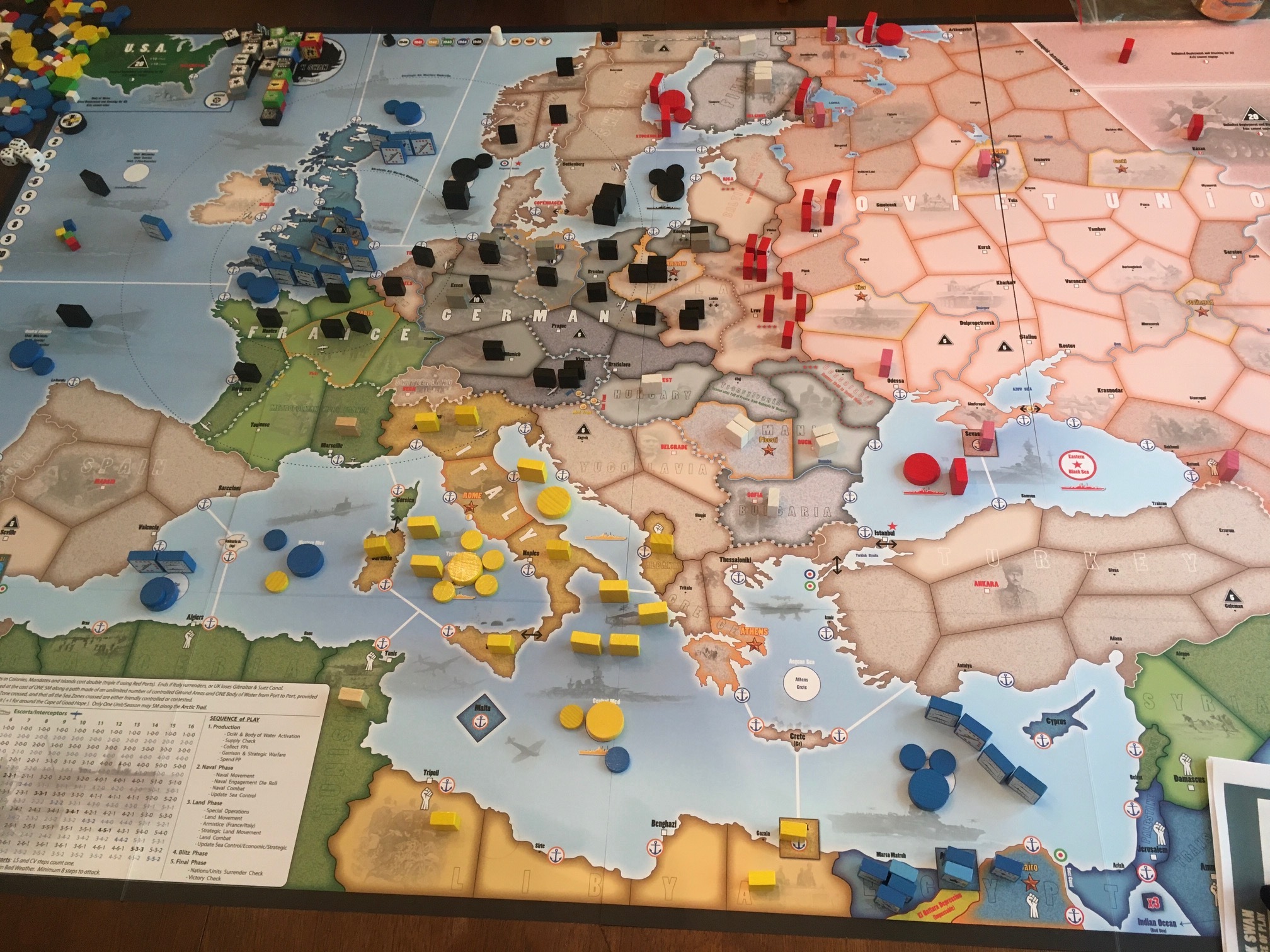The Germans declared war on Russia and blitzed.. the Atlantic wall was built.. Russia was being beaten back but countering many attacks… both the Germans and Russians were suffering heavy losses… the British tried an invasion of Belgium but were repulsed… the British then brought up some serious fire power with a fleet of four heavy naval battle groups and blitzed Belgium again… this time they had a foothold in Denmark and on the blitz rolled into Paris and brought more reinforcements into Belgium… the Axis then conceded the game and Jim committed Hari Kari … we left him in the trash… just kidding.. rolled him into a ditch..