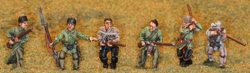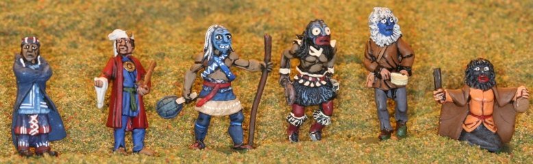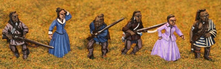 These figures are primarily 28mm from Conquest Miniatures, which have been acquired by Warlord. Below are some larger figures (I believe Blue Moon) that I bought for the British Regulars, which Conquest did not have at the time I originally did this project. These figures were all Dullcote, but have been played with, and as a result a few need a little touch up as shown. One figure needs a base, and all need flocking of their bases, etc.