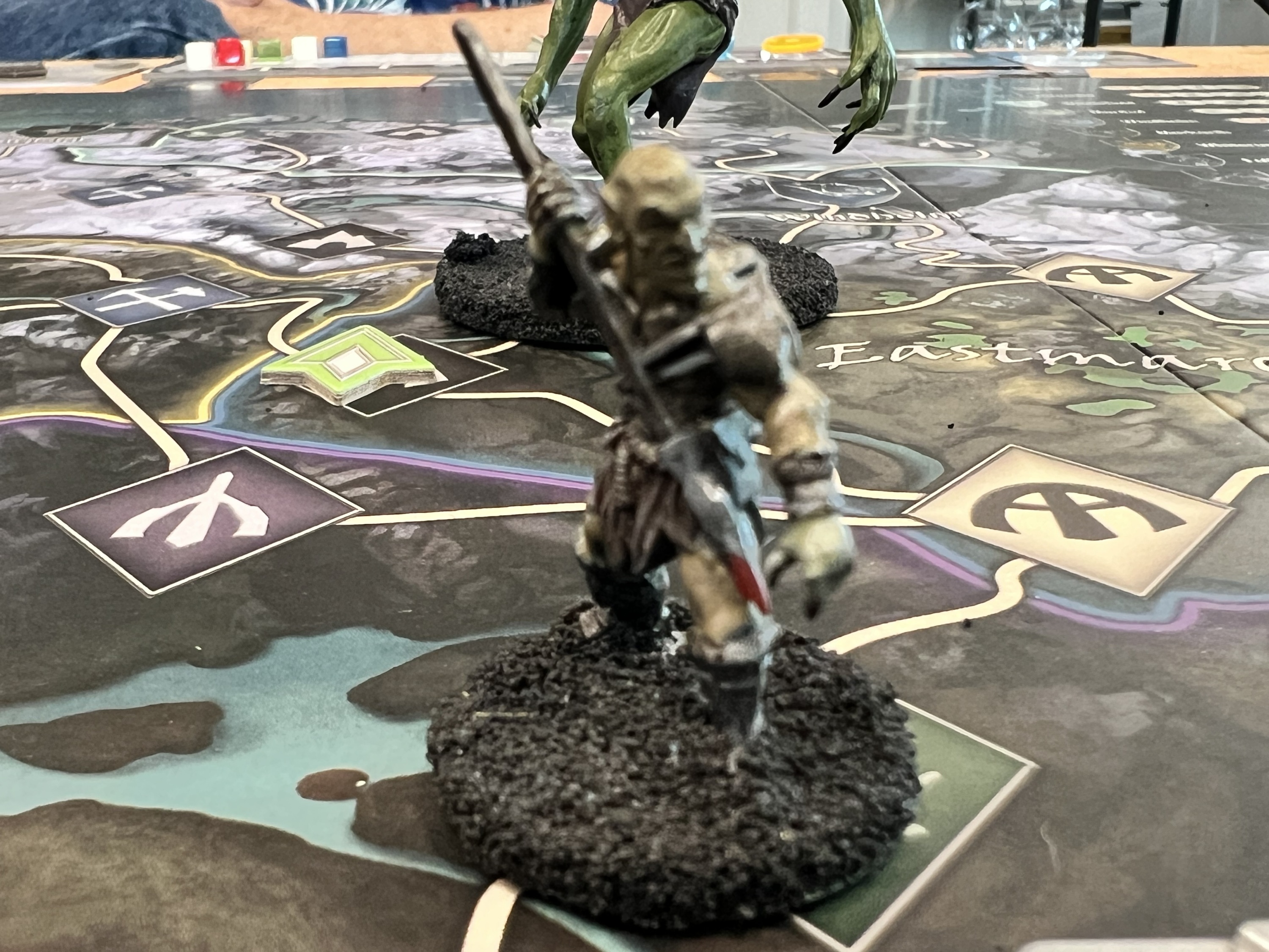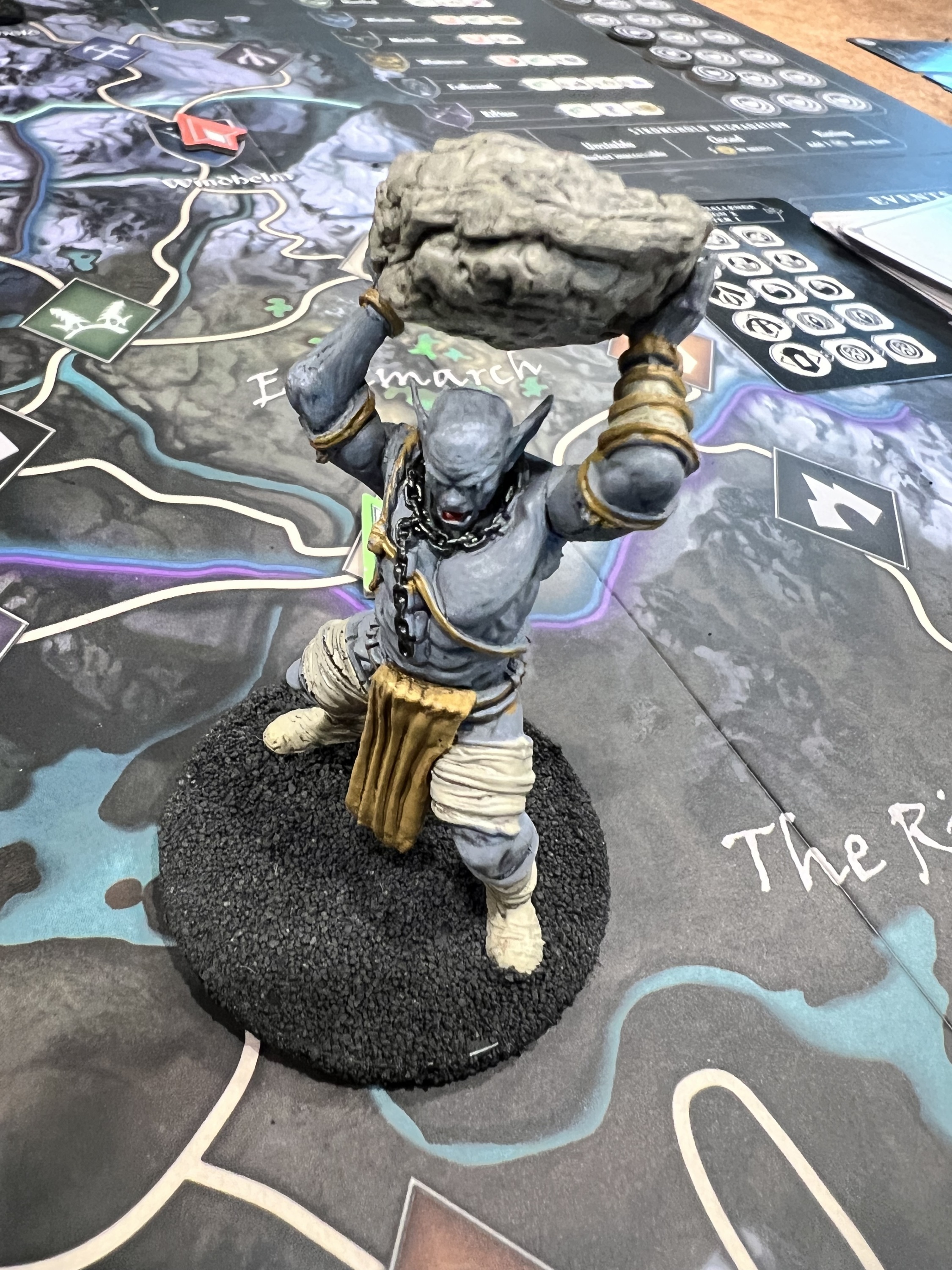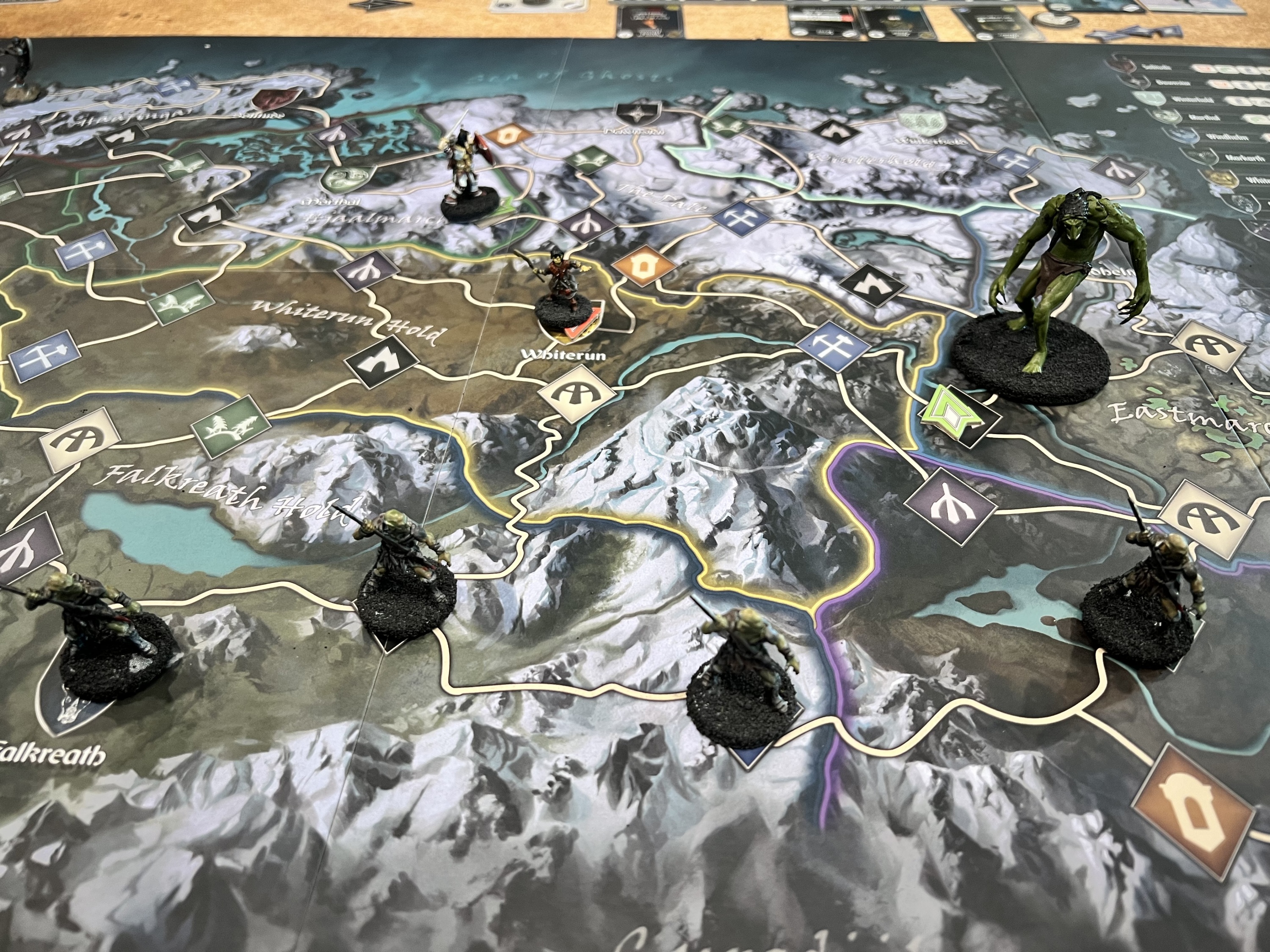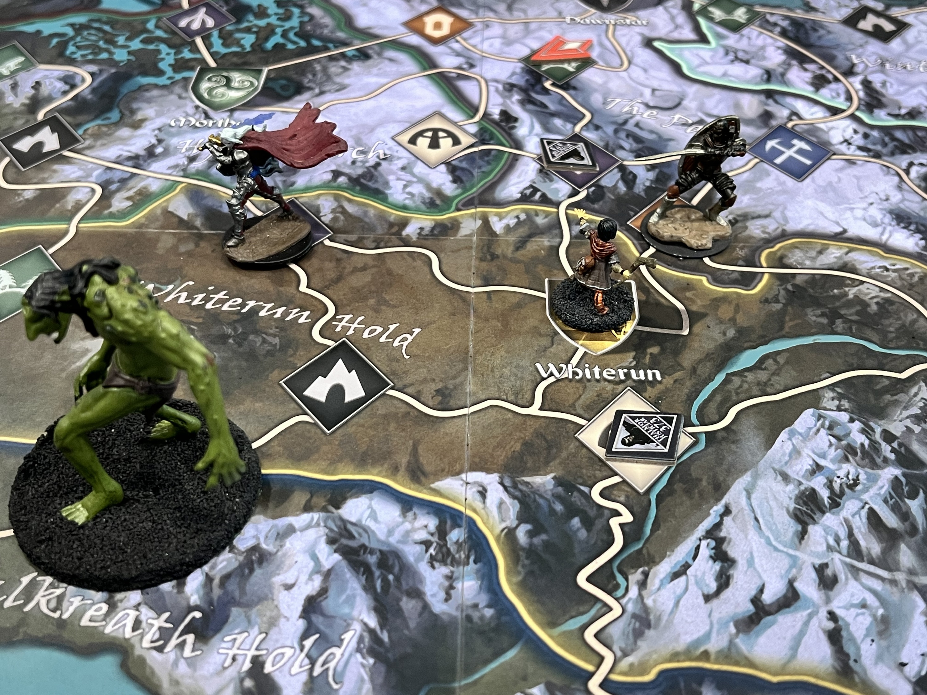 The game board represents the province of Skyrim. Players move their characters — represented by 32mm scale plastic miniatures — across the region, visiting Strongholds, exploring dungeons and meeting interesting characters as the story unfolds. But they are not the only ones there; roaming monsters appear, blocking roads and threatening the peace in Skyrim. Several game effects could lead to the fall of a Stronghold so players need to keep an eye on the state of unrest and the active dangers across the board.