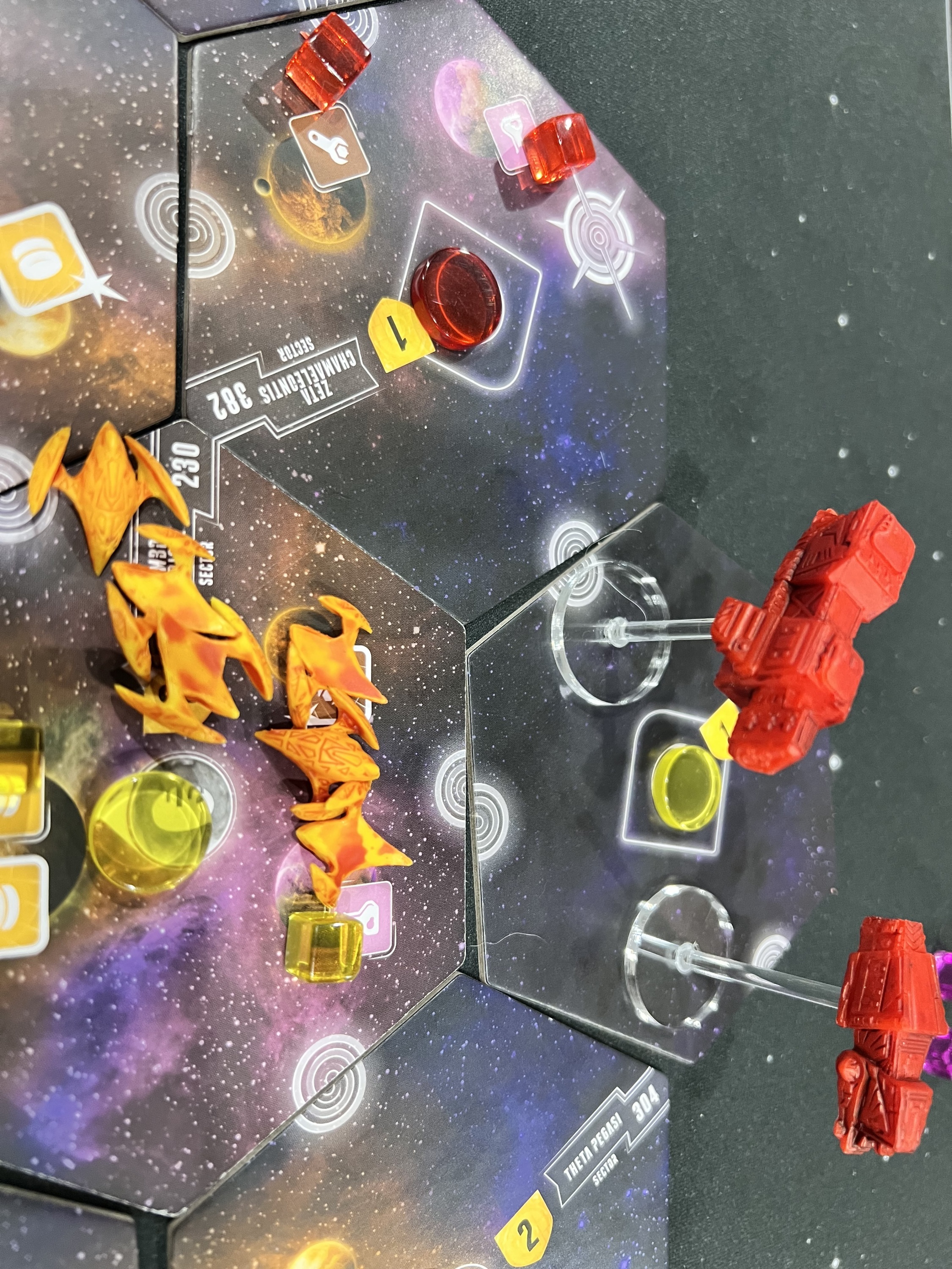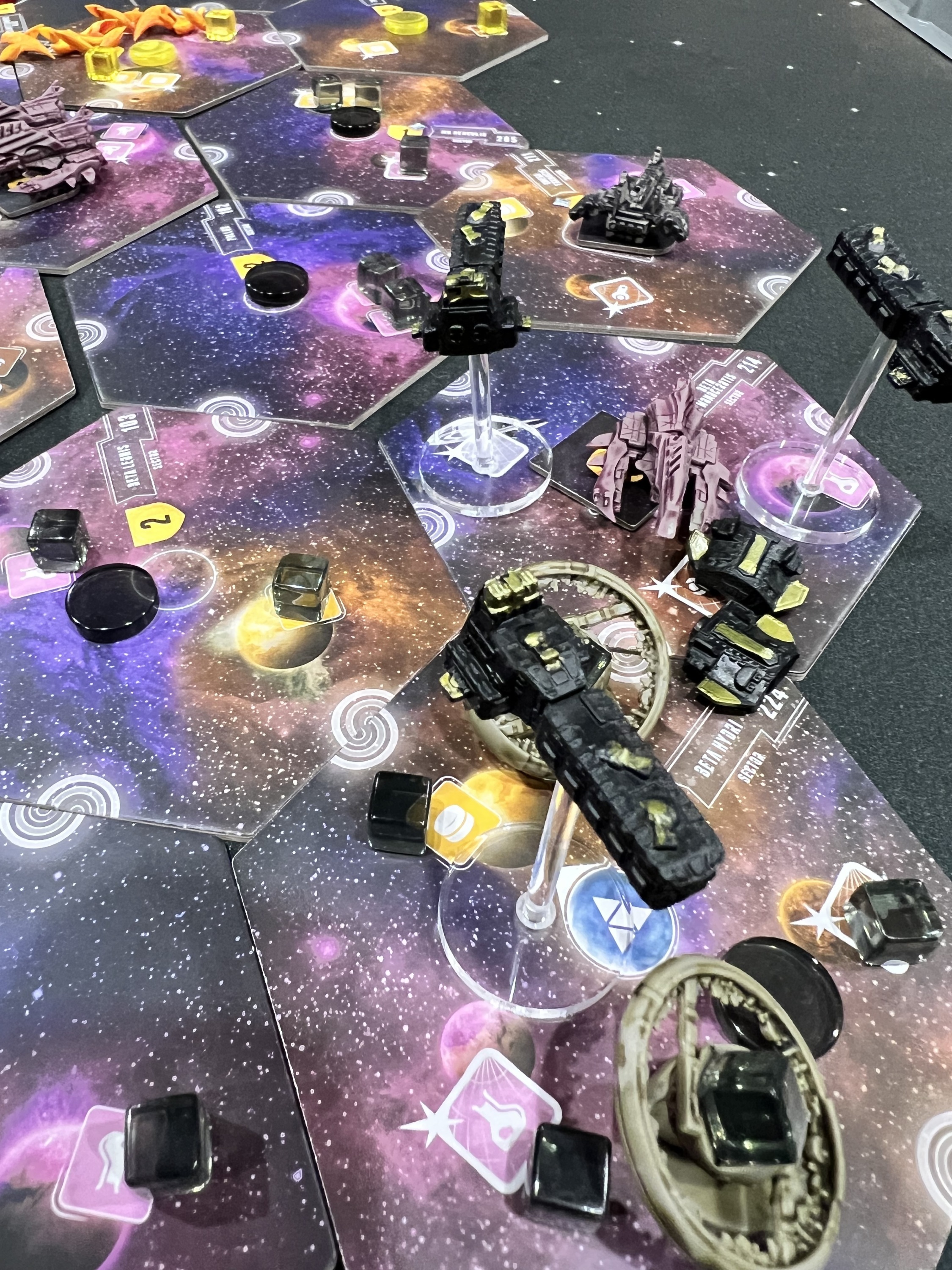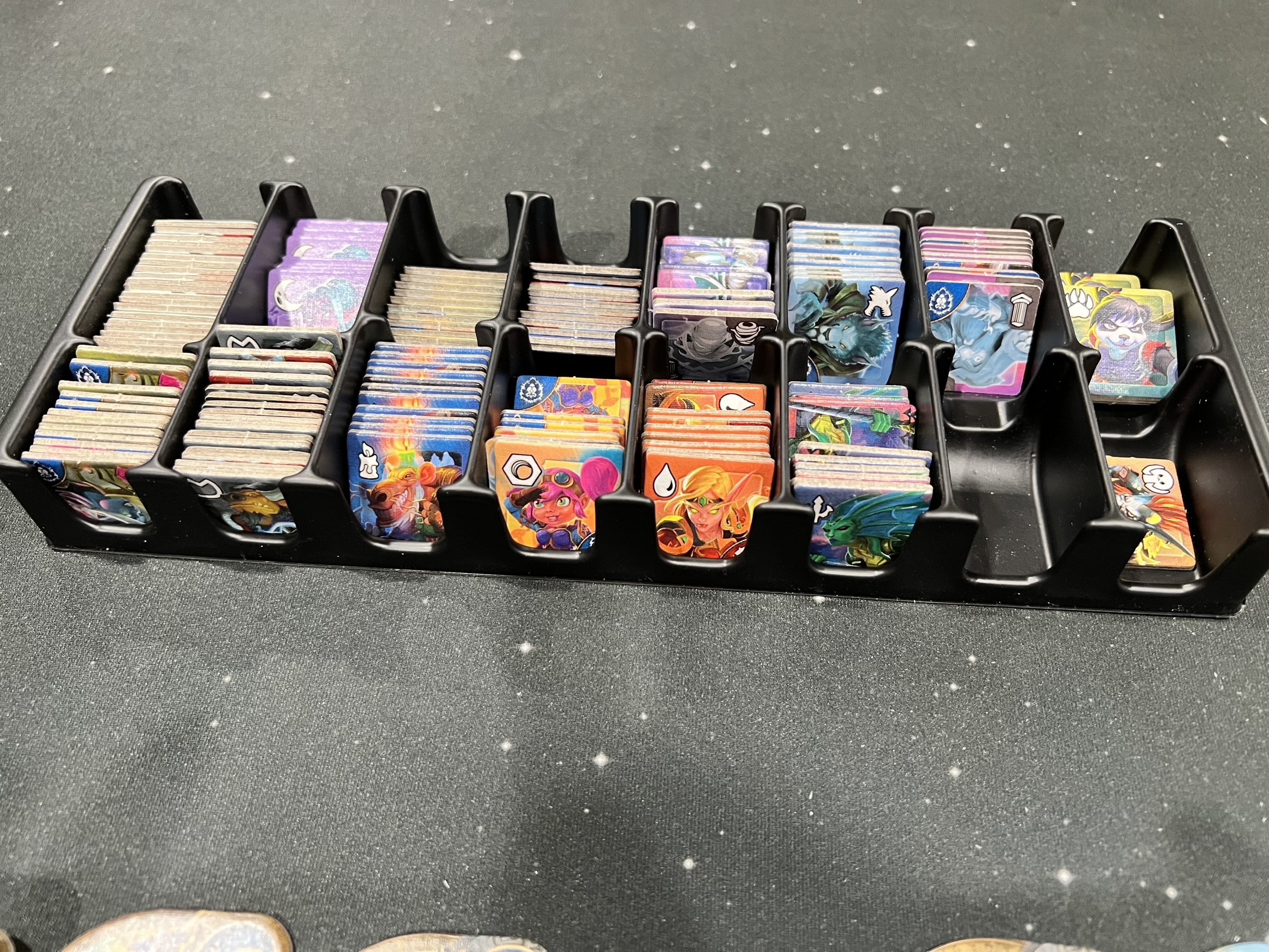 In more detail, on each turn either you use the multiple tiles of your chosen fantasy race to (normally) occupy adjacent territories, possibly defeating weaker enemy races along the way, or you give up on your race and let it go into decline. A race in decline is designated by flipping the tiles over to their black-and-white side. At the start of the game or after you go into decline, you choose a new race/power combination at the start of your turn, with the 16 races and 20 powers being paired randomly each game.