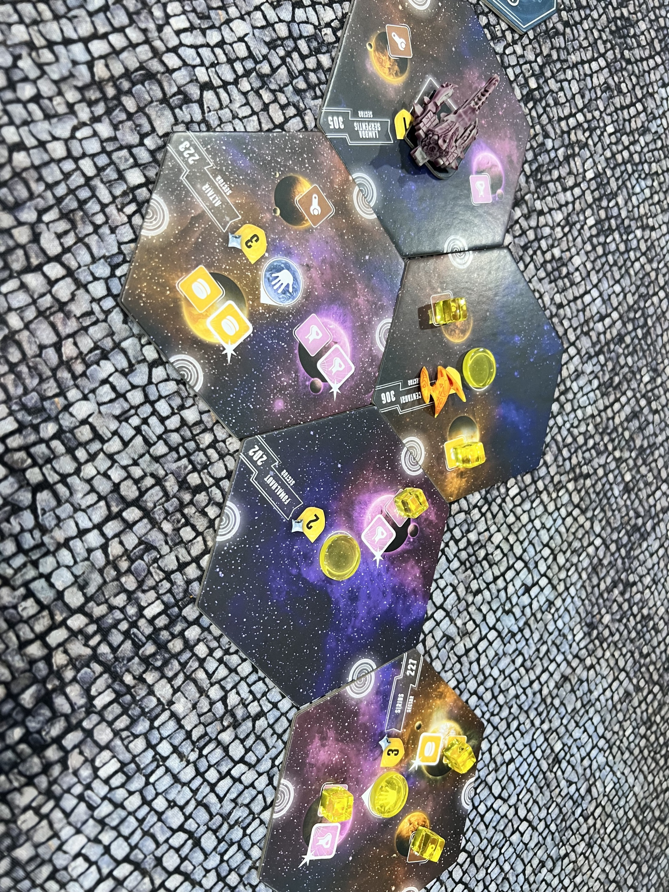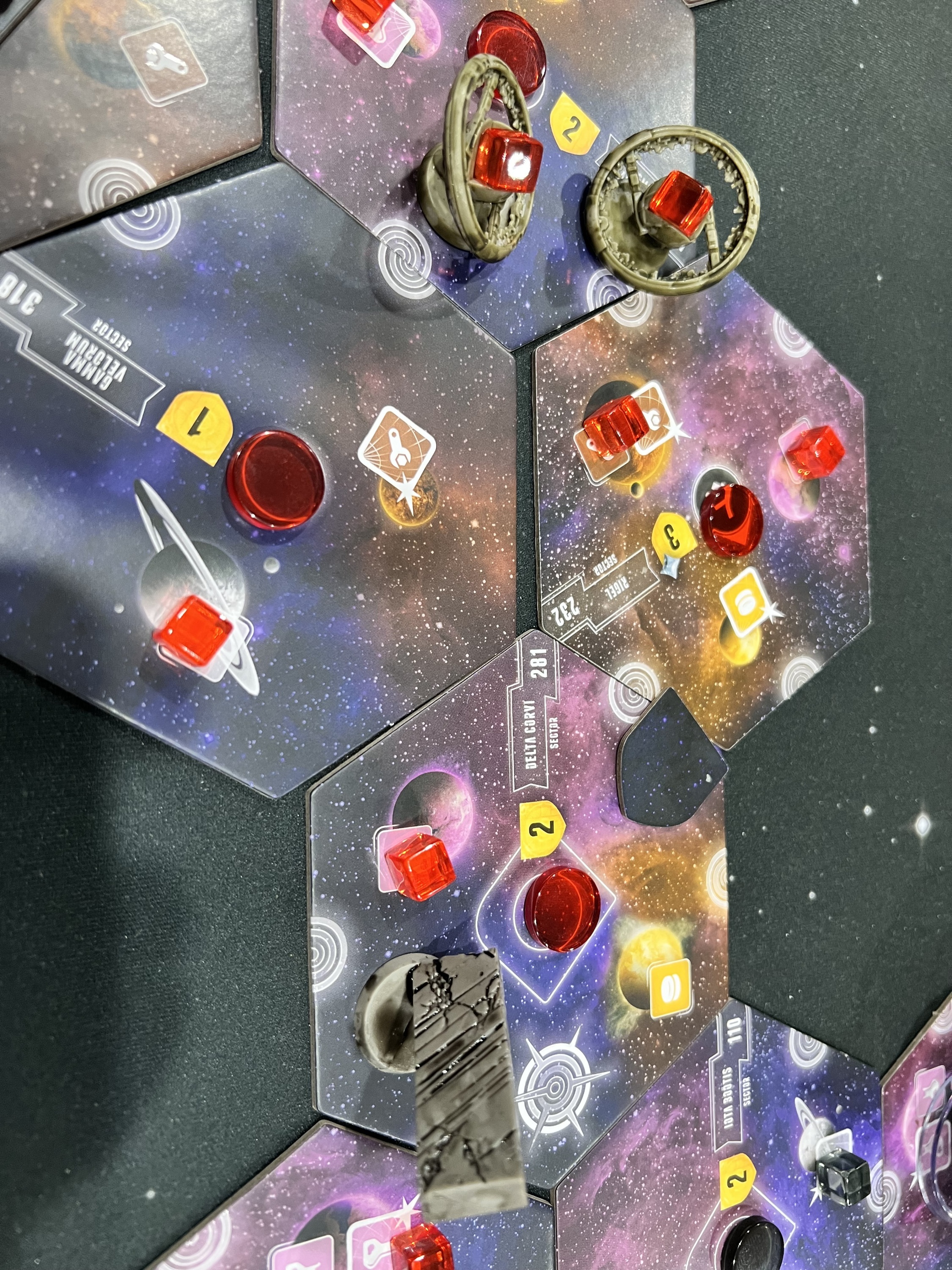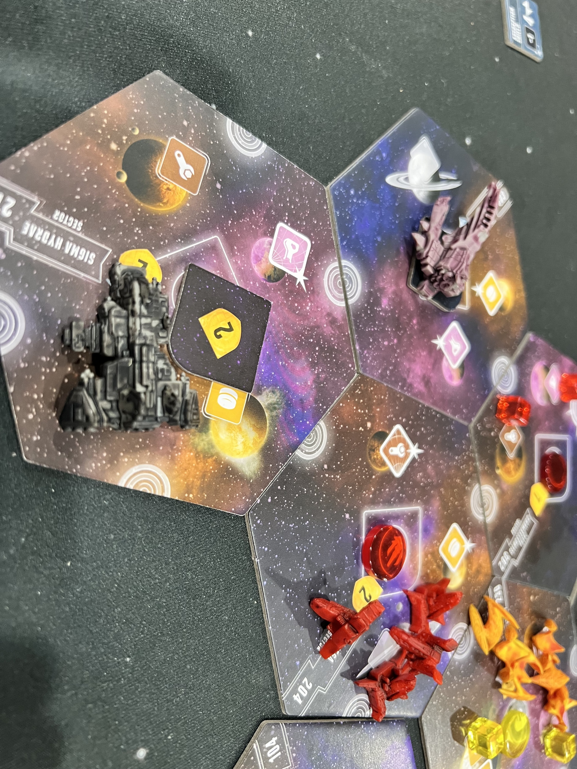 In more detail, on each turn either you use the multiple tiles of your chosen fantasy race to (normally) occupy adjacent territories, possibly defeating weaker enemy races along the way, or you give up on your race and let it go into decline. A race in decline is designated by flipping the tiles over to their black-and-white side. At the start of the game or after you go into decline, you choose a new race/power combination at the start of your turn, with the 16 races and 20 powers being paired randomly each game.