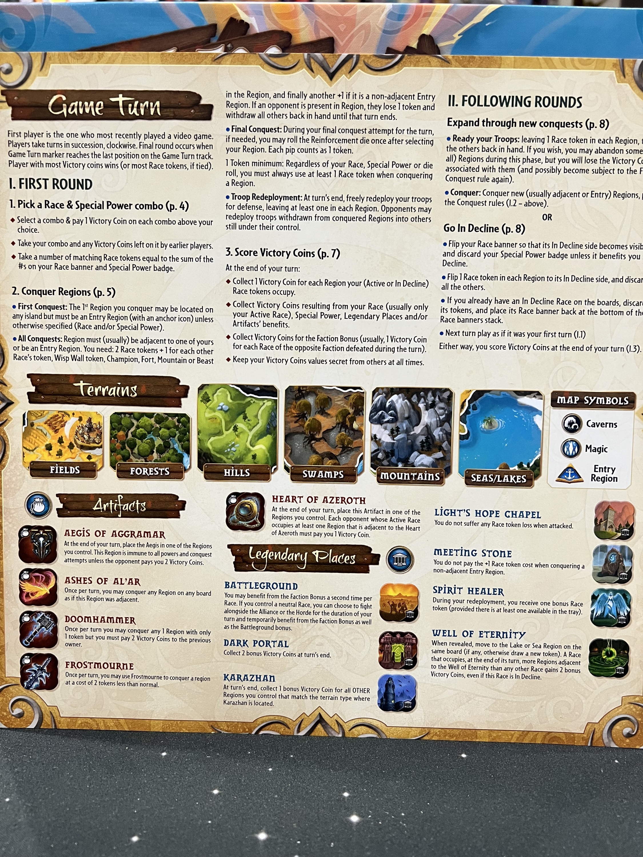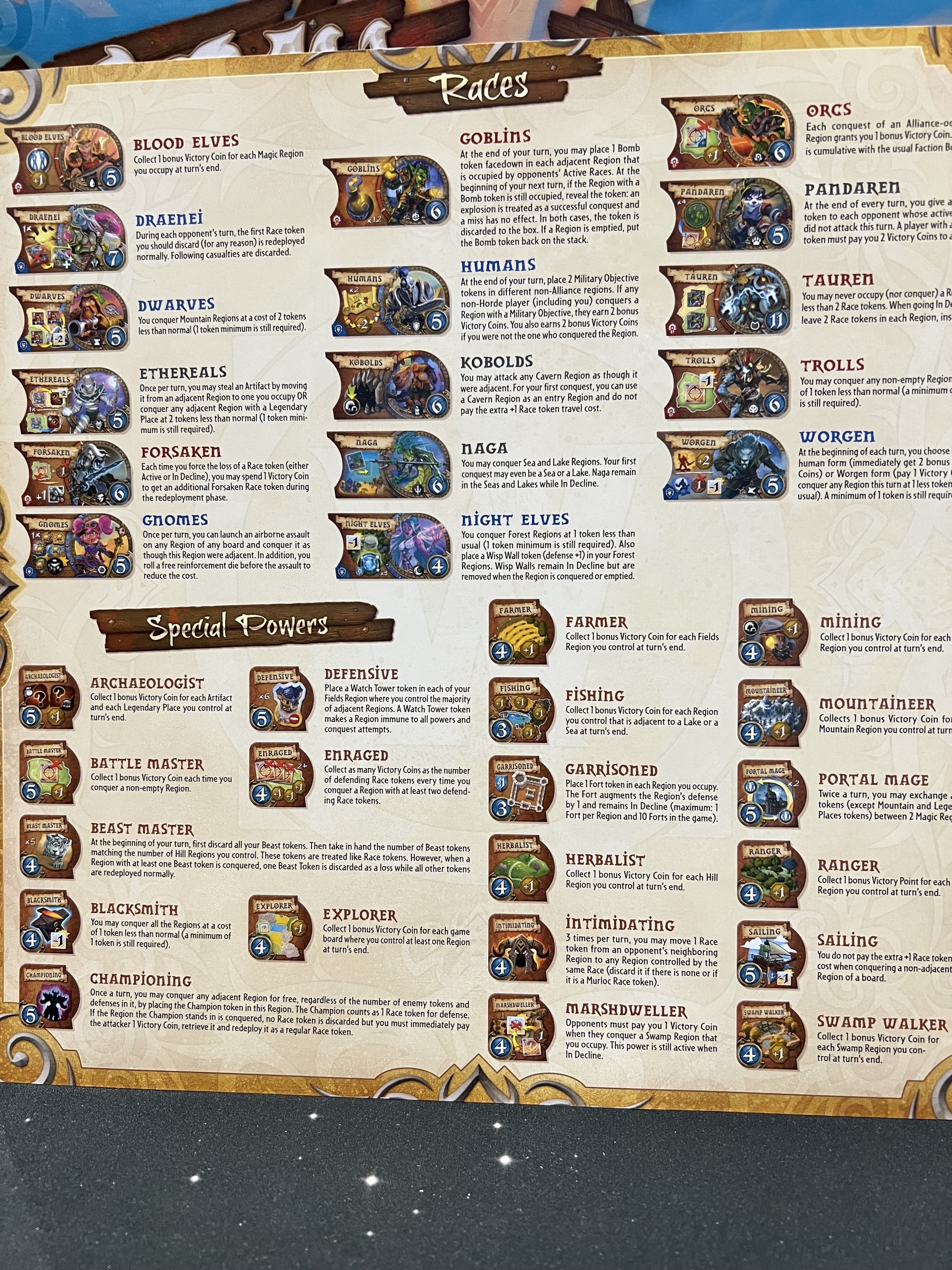 Small World of Warcraft is set on the fantasy world of Azeroth, where the races of the Alliance and the Horde — including Orcs, Dwarves, Trolls, and Worgen — clash in a world-consuming conflict. In the game, players choose combinations of special powers and races from the Warcraft universe, such as Portal Mage Pandarens or Herbalist Goblins, and vie for control of Azeroth. To help them achieve dominance, players will occupy legendary terrains and seek control of powerful artifacts. However, all empires must eventually fall, so players need to be ready to put an overextended race into a state of “decline” and lead a new one to rule Azeroth.