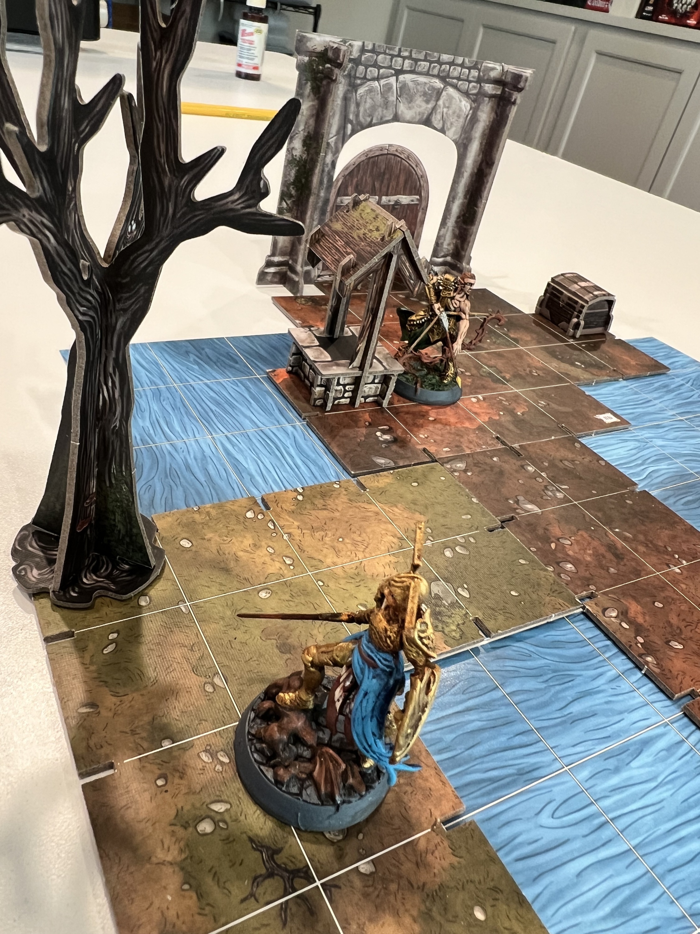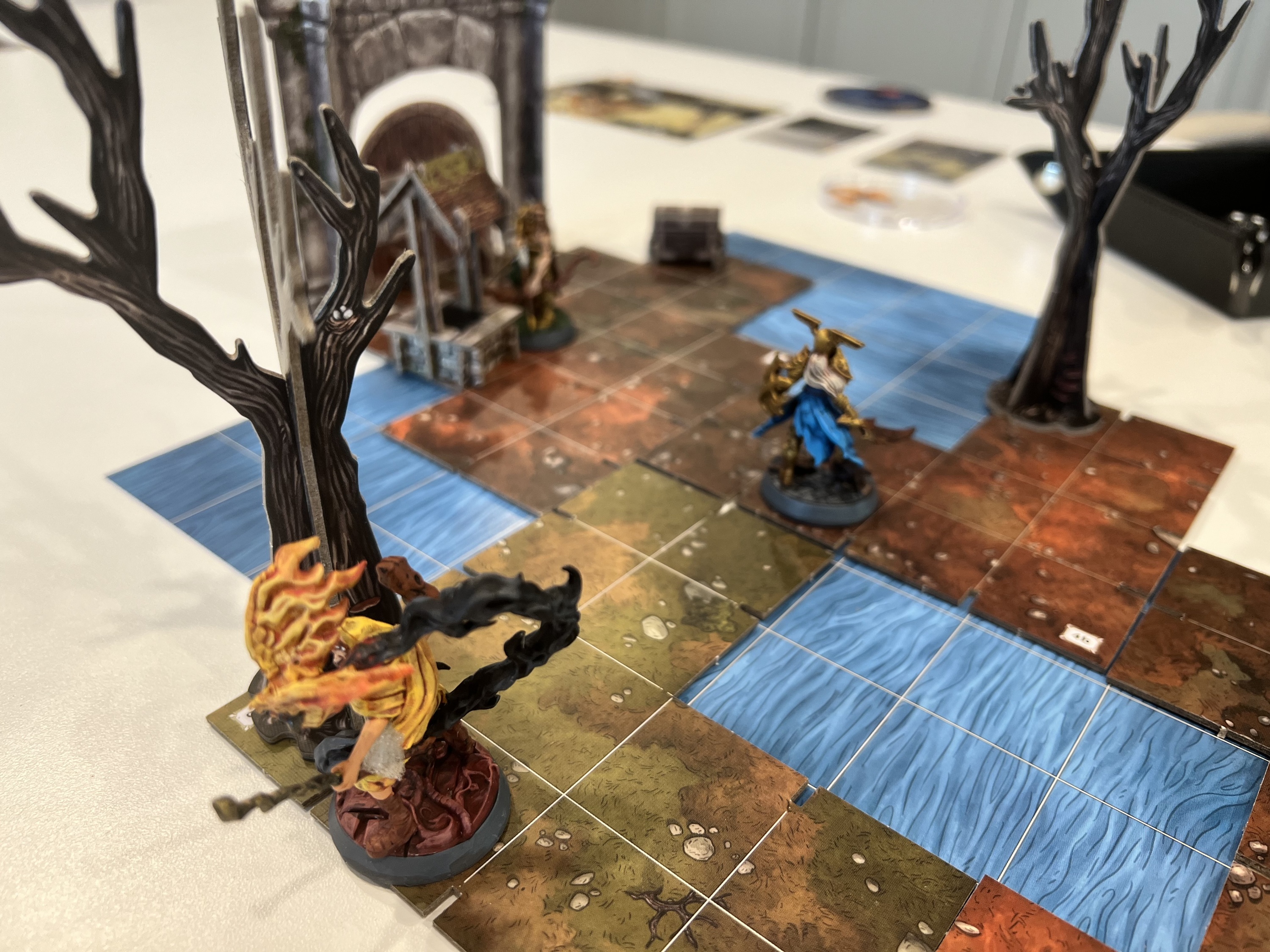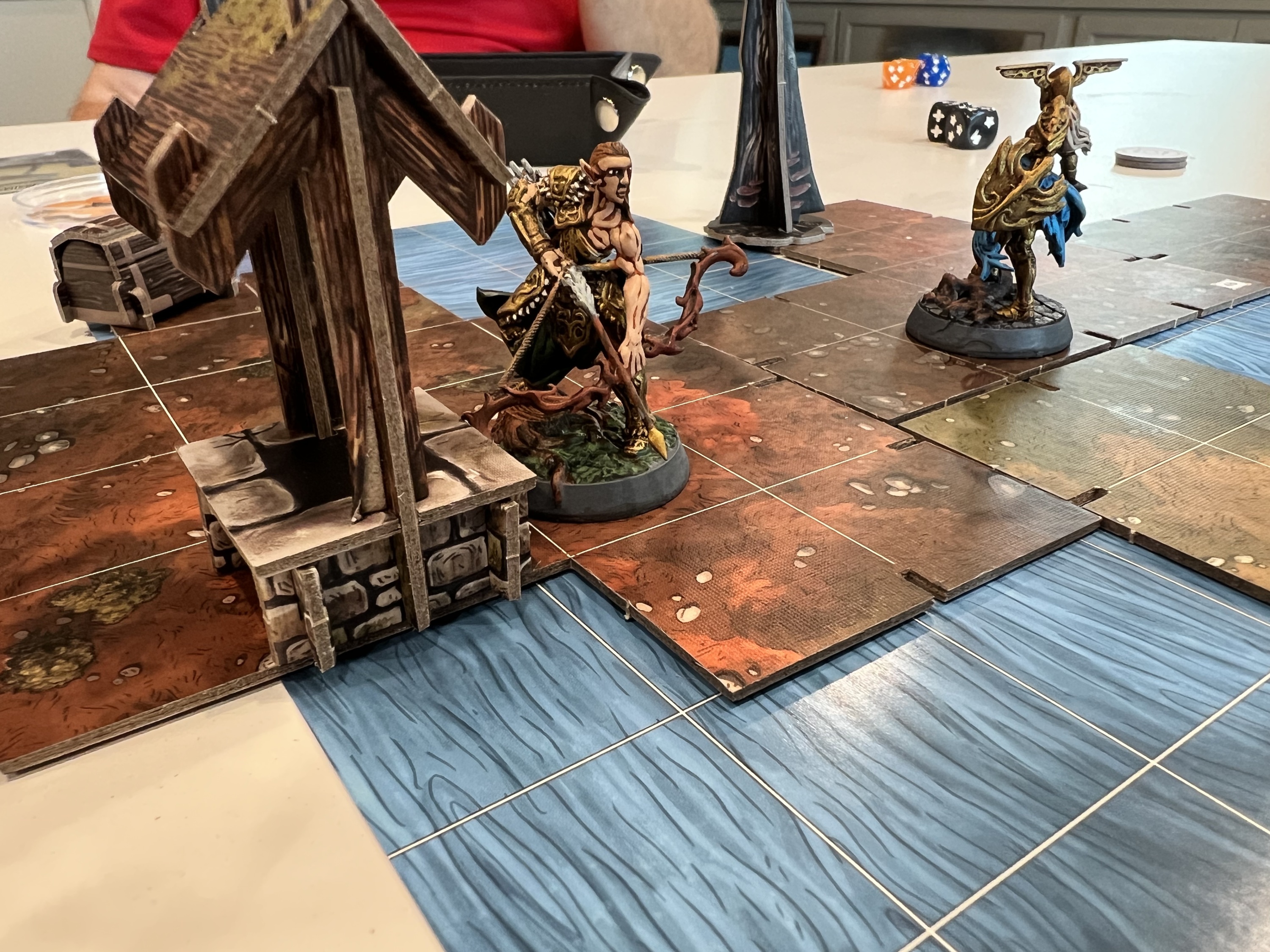 Lee and I played the first scenario. Brinn (warrior – Lee), Galaden (huntsman – Richard) and Syrus (human prodigy – Richard). The objective for this portion was to kill enemies. First foe was a wolf. Galaden and Syrus took it out at long range. A berserker attacked next. Long range weapons reduce it and Brinn finished it off. A bandit appeared and Brinn took care of it.d There was a tree which Syrus obtained some fruit and ingredients. A chest which Brinn obtained some supplies and a well which give Galaden heal.