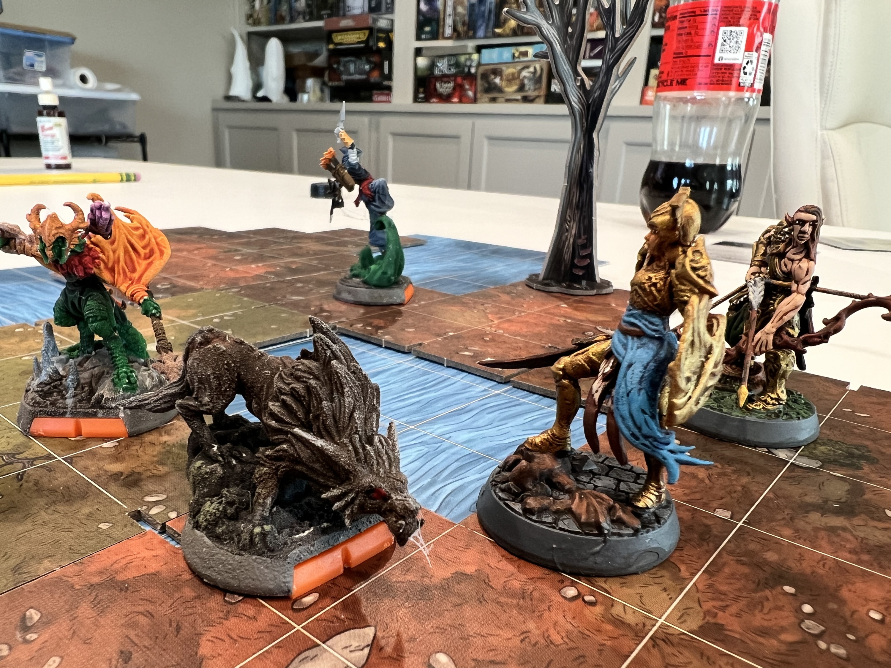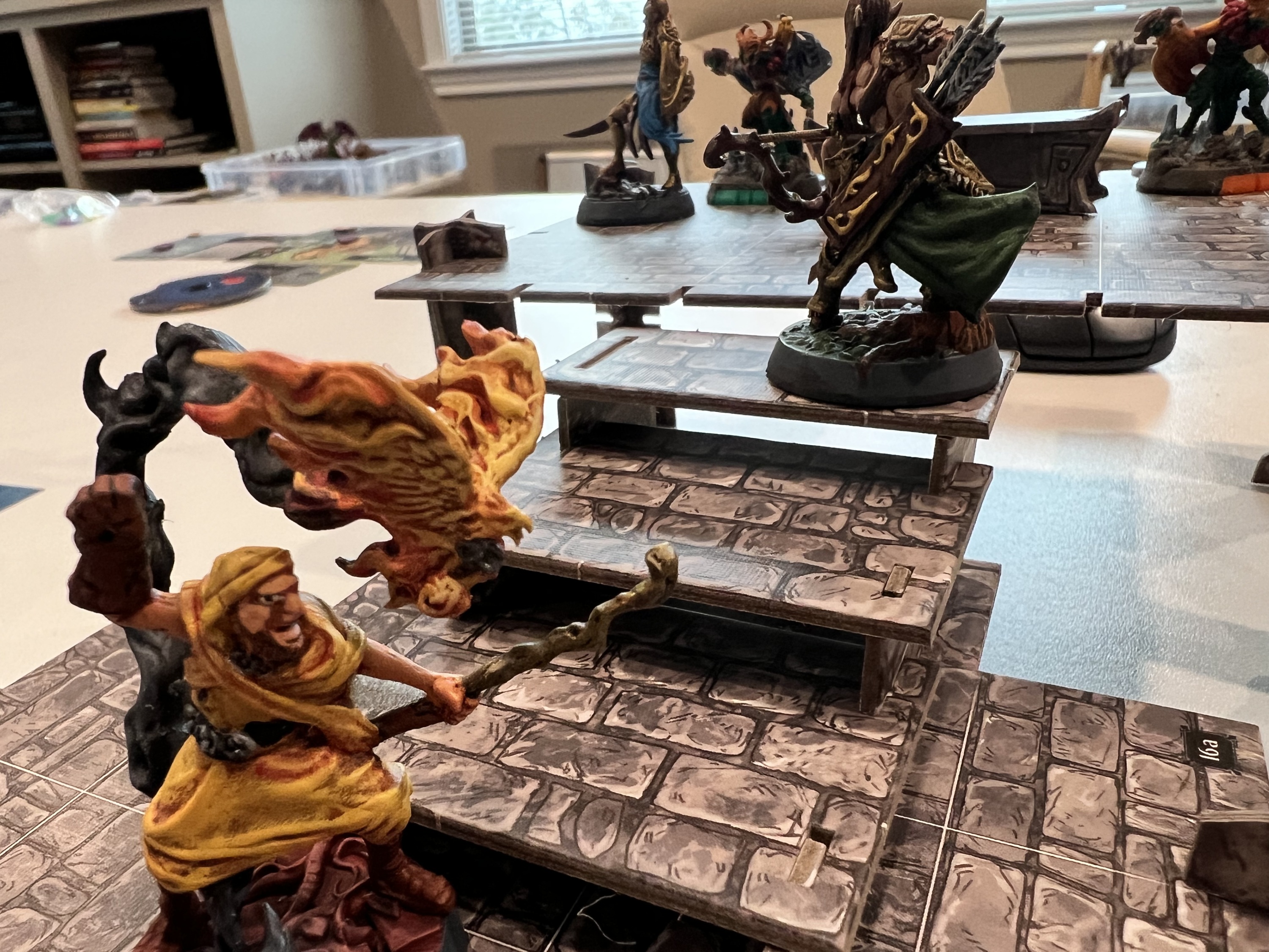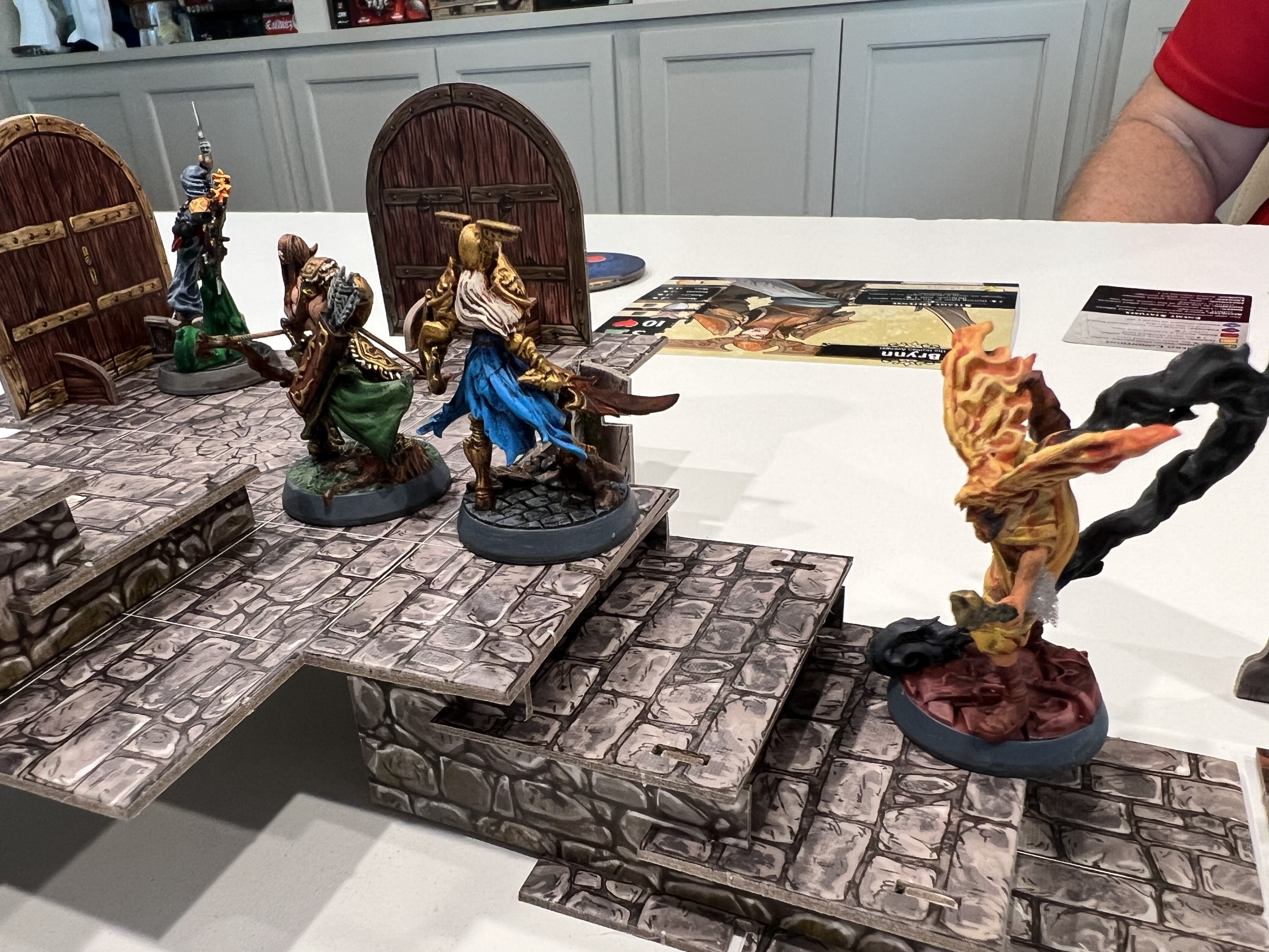 Lee and I played the first scenario. Brinn (warrior – Lee), Galaden (huntsman – Richard) and Syrus (human prodigy – Richard). The objective for this portion was to kill enemies. First foe was a wolf. Galaden and Syrus took it out at long range. A berserker attacked next. Long range weapons reduce it and Brinn finished it off. A bandit appeared and Brinn took care of it.d There was a tree which Syrus obtained some fruit and ingredients. A chest which Brinn obtained some supplies and a well which give Galaden heal.