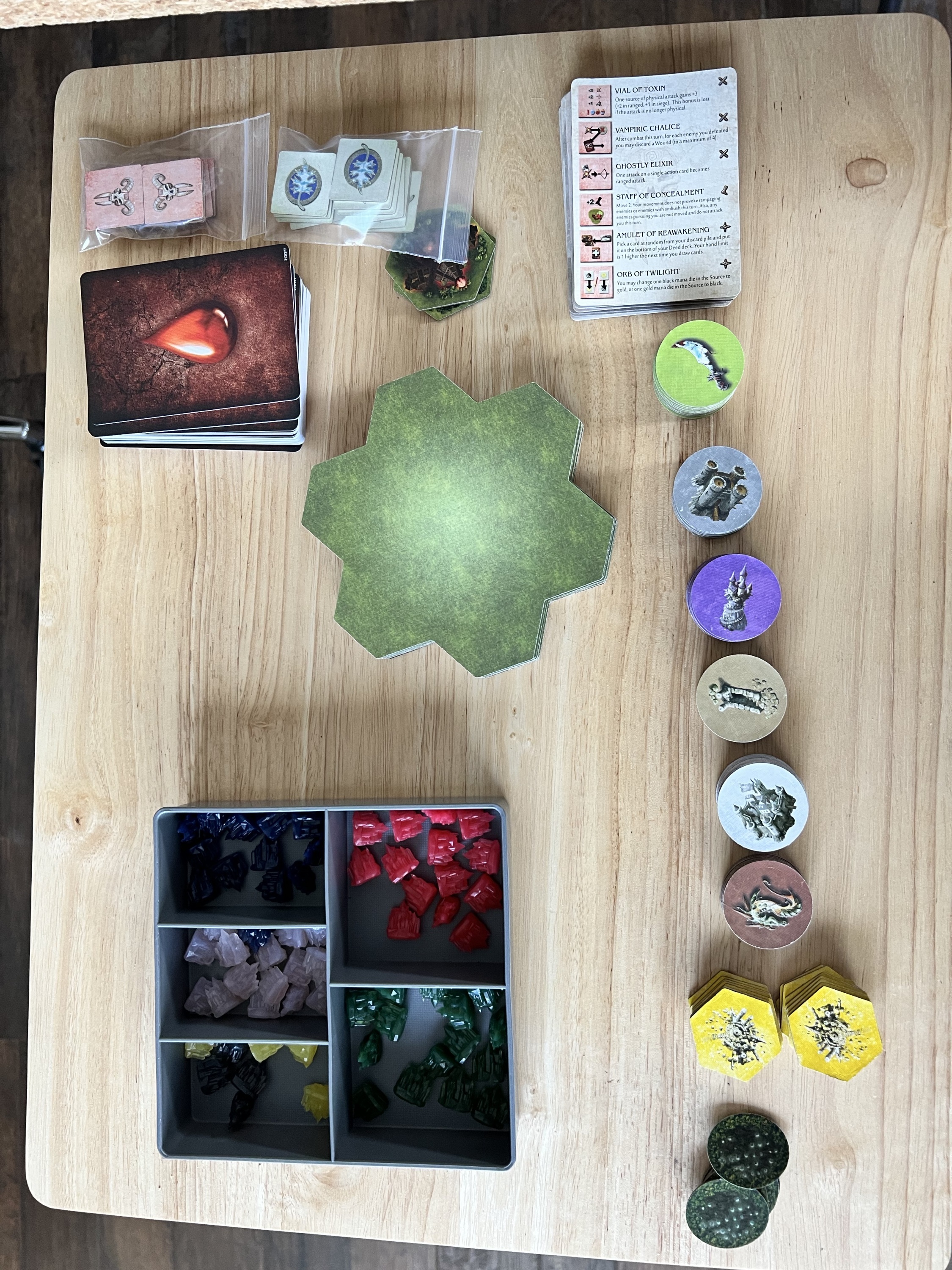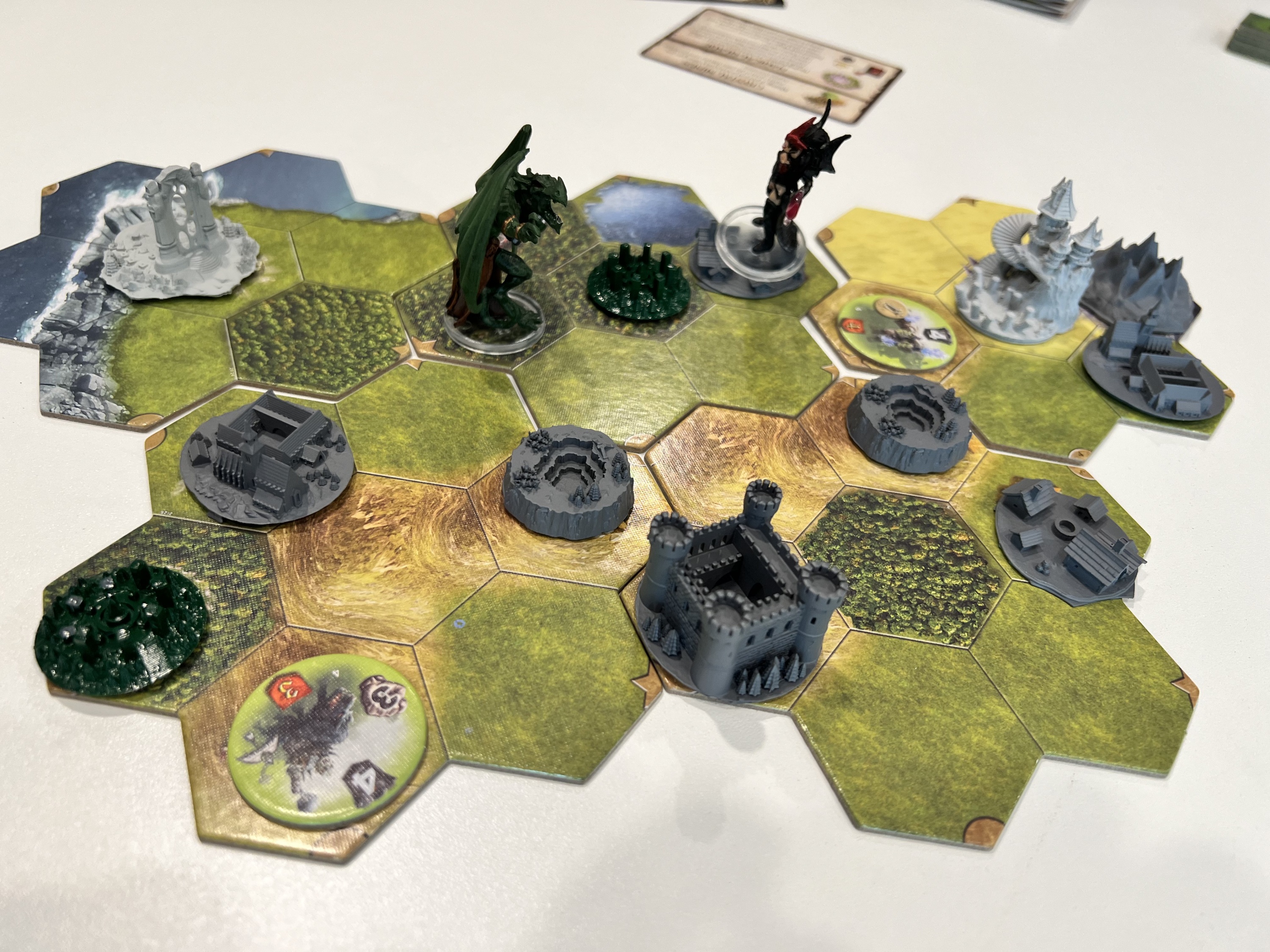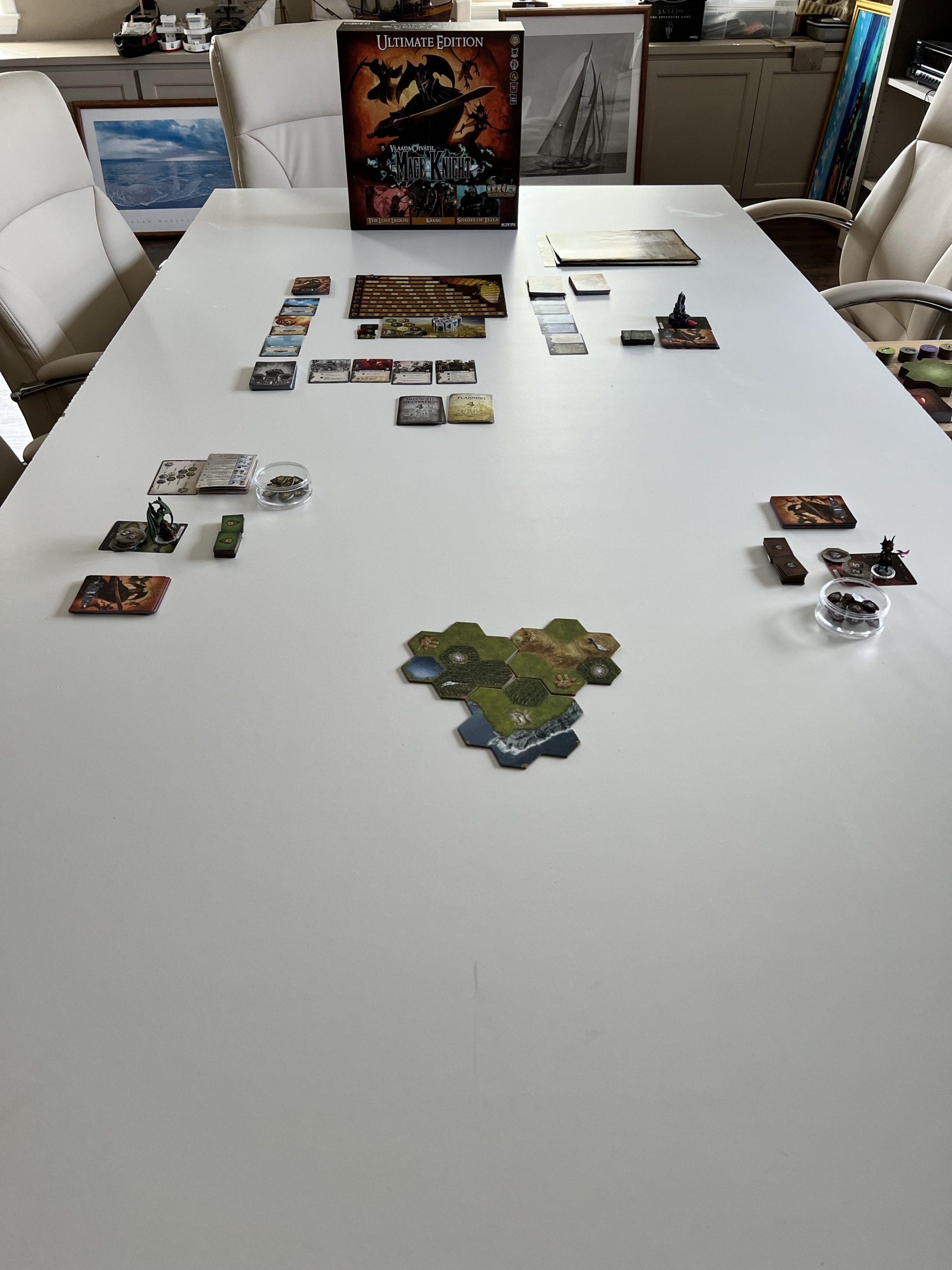 Lee (Goldyx) and Richard (Arythea) did the first scenario for learning the game. We won the game, but individually the score (fame) for Richard was twice that of Lee. There were numerous rules and procedures we did not follow but will in the next run through tomorrow. Richard also 3D resin printed most of the terrain for the game that added bling.