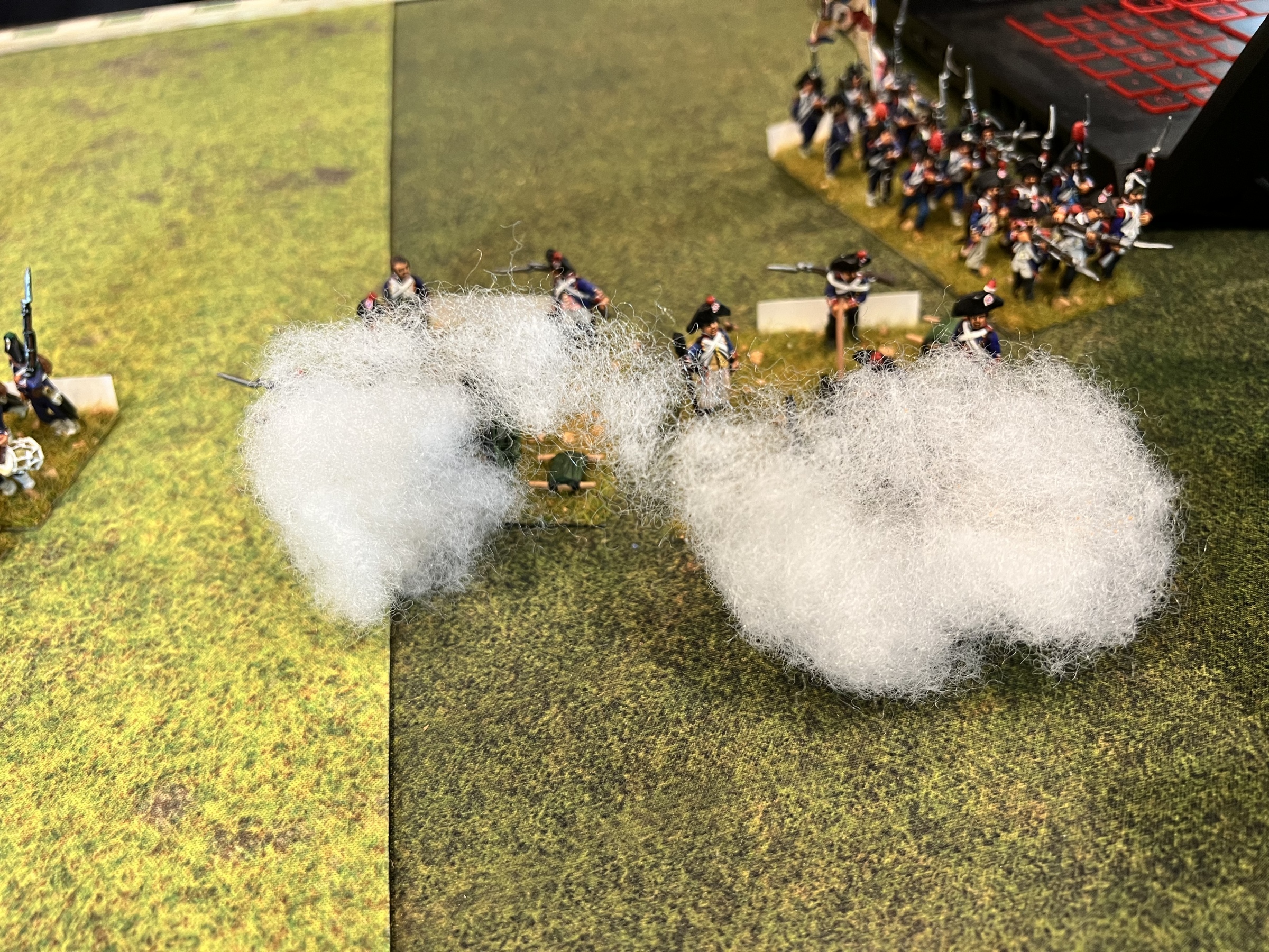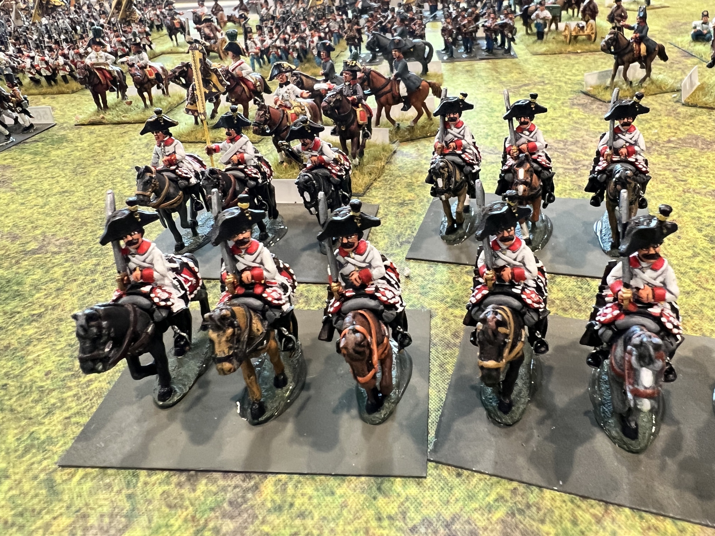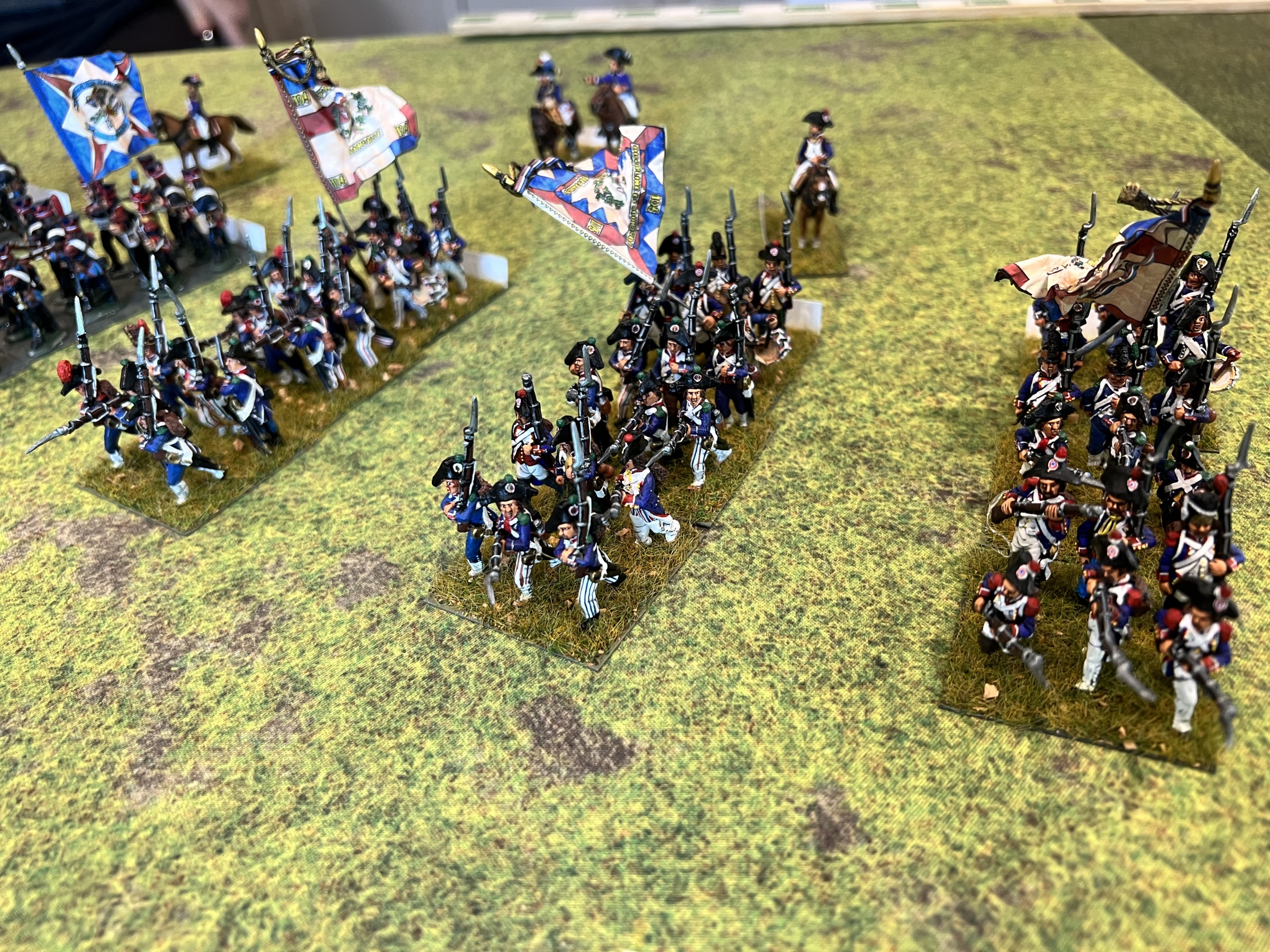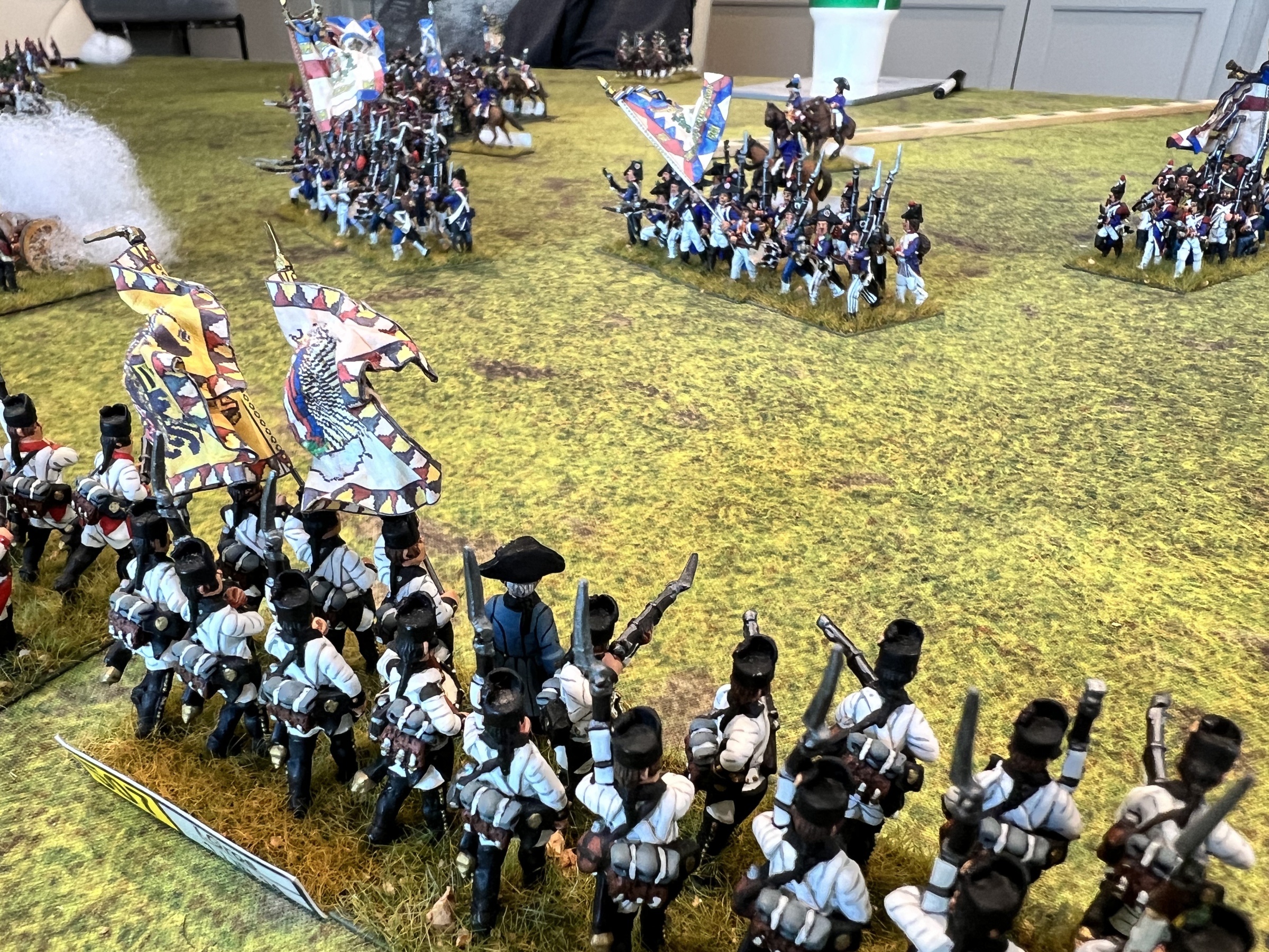 Messina’s flank was in disarray due to a regiment of Russian dragoons behind his left flank after an ill advised charge by the French cavalry against a larger Russian cavalry unit that countercharged and forced the French back. But in keeping in with napoleonic cavalry, the Russian cavalry ran off the board charging a smaller regiment. The second French cavalry unit charged the guns and a unit in square and was thrown back with devastating losses. The refusal of the Russian cavalry in the middle to charge, gave the French the chance to stay in attack column instead of square and charge the Russian mass which crumbled under the assault.