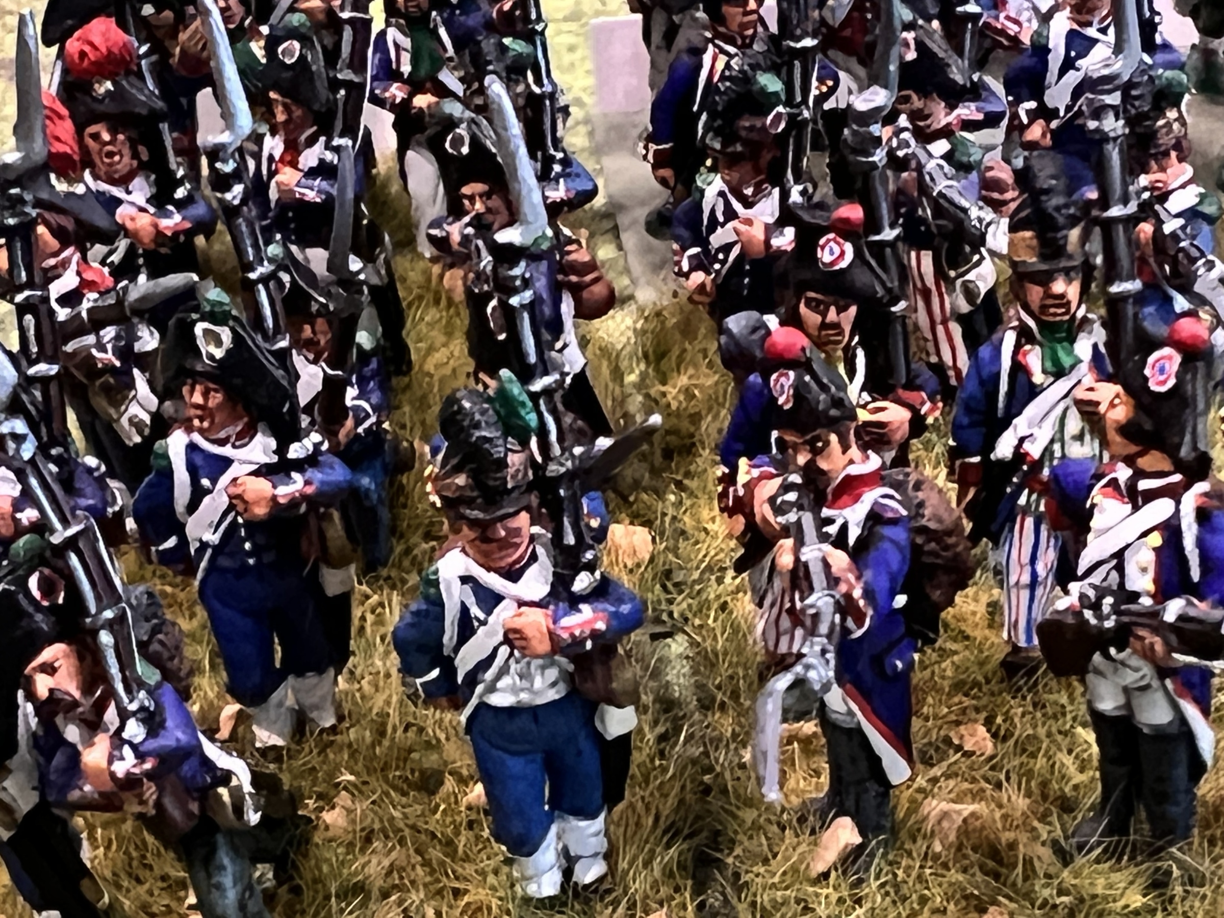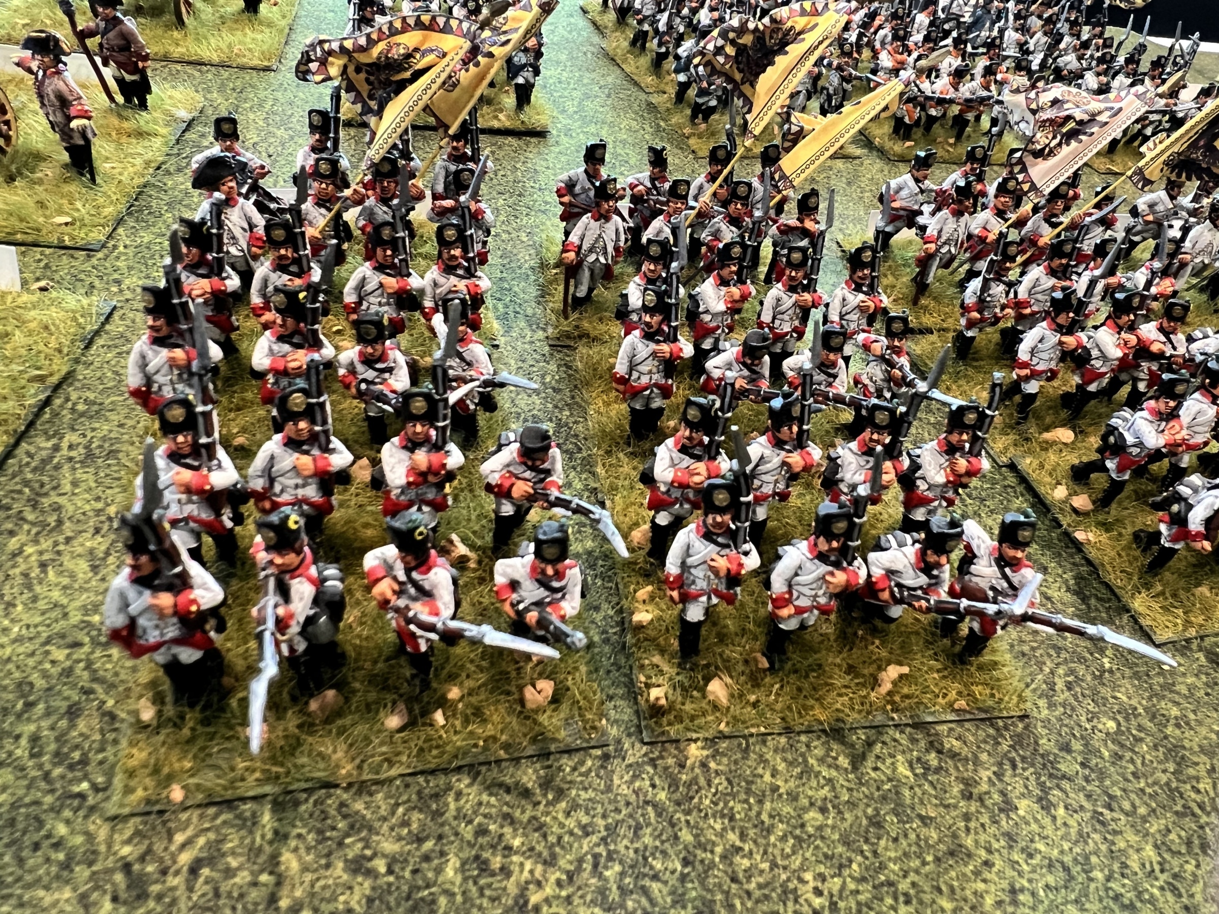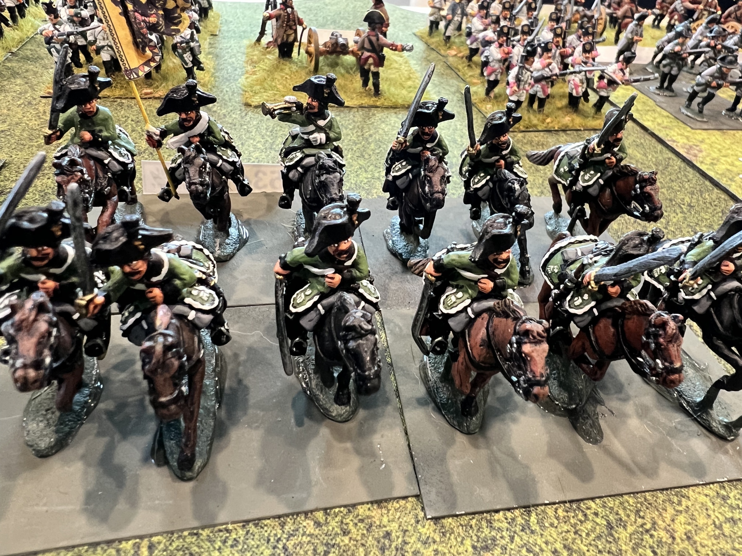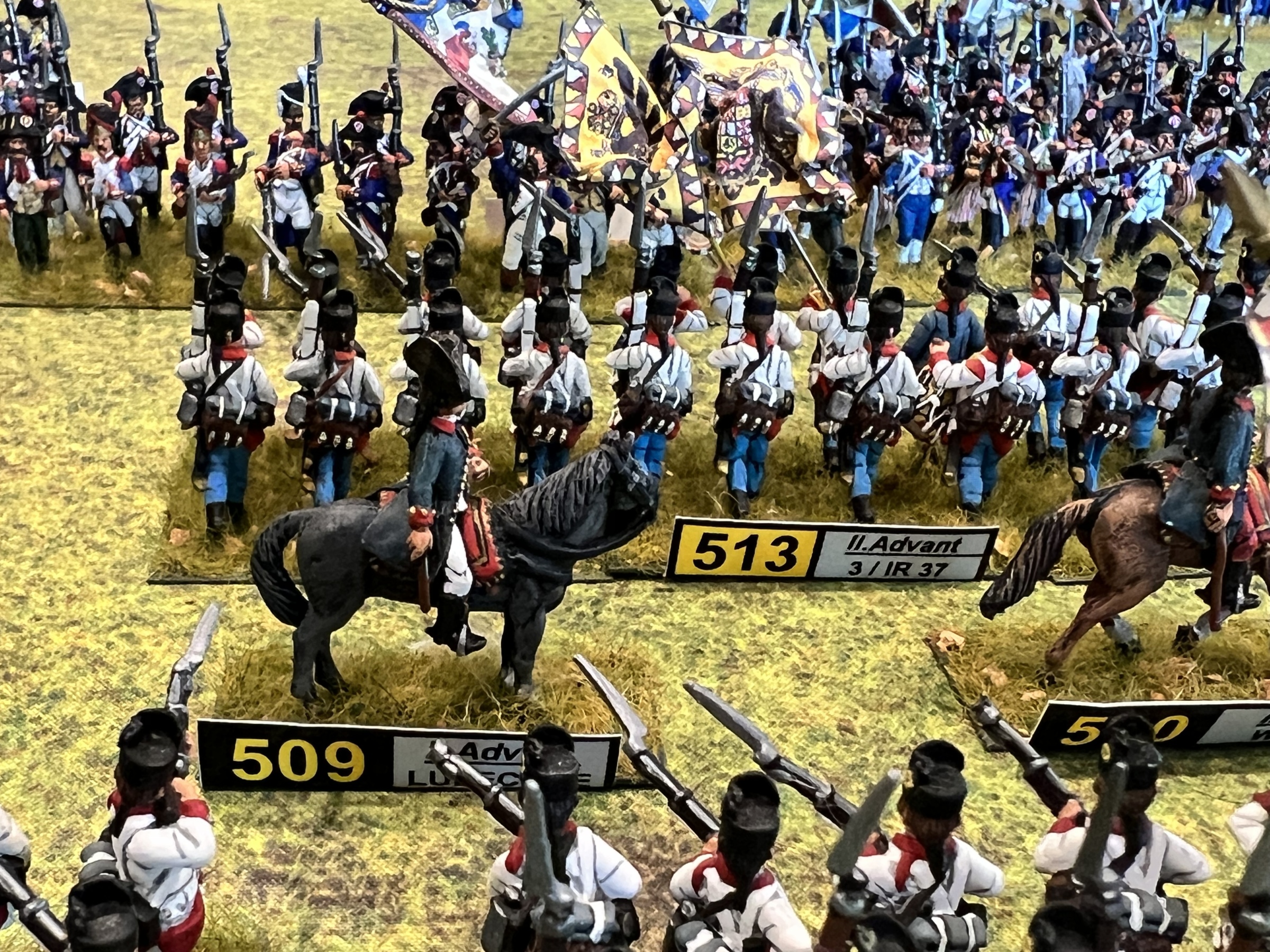Messina’s flank was in disarray due to a regiment of Russian dragoons behind his left flank after an ill advised charge by the French cavalry against a larger Russian cavalry unit that countercharged and forced the French back. But in keeping in with napoleonic cavalry, the Russian cavalry ran off the board charging a smaller regiment. The second French cavalry unit charged the guns and a unit in square and was thrown back with devastating losses. The refusal of the Russian cavalry in the middle to charge, gave the French the chance to stay in attack column instead of square and charge the Russian mass which crumbled under the assault.