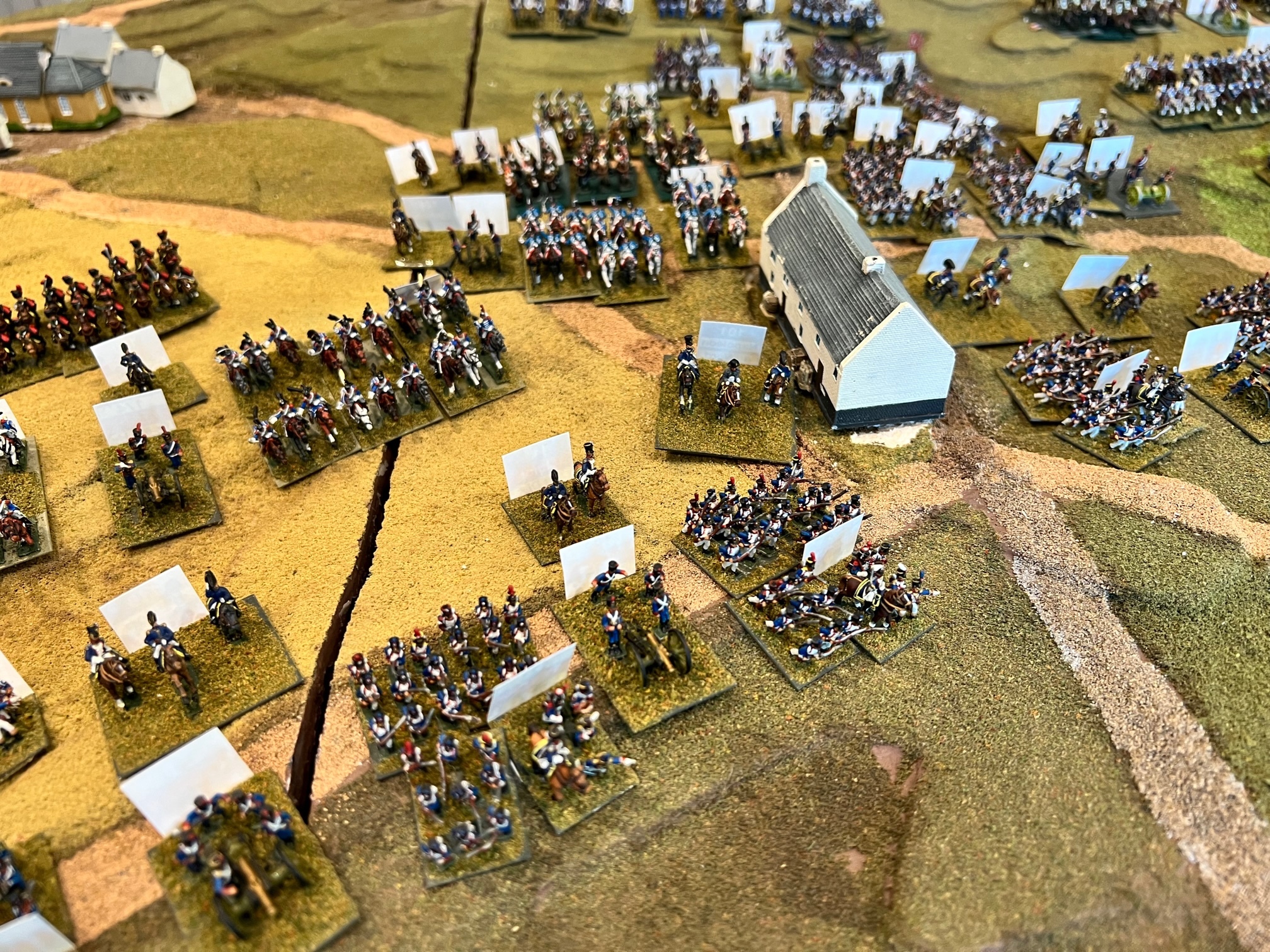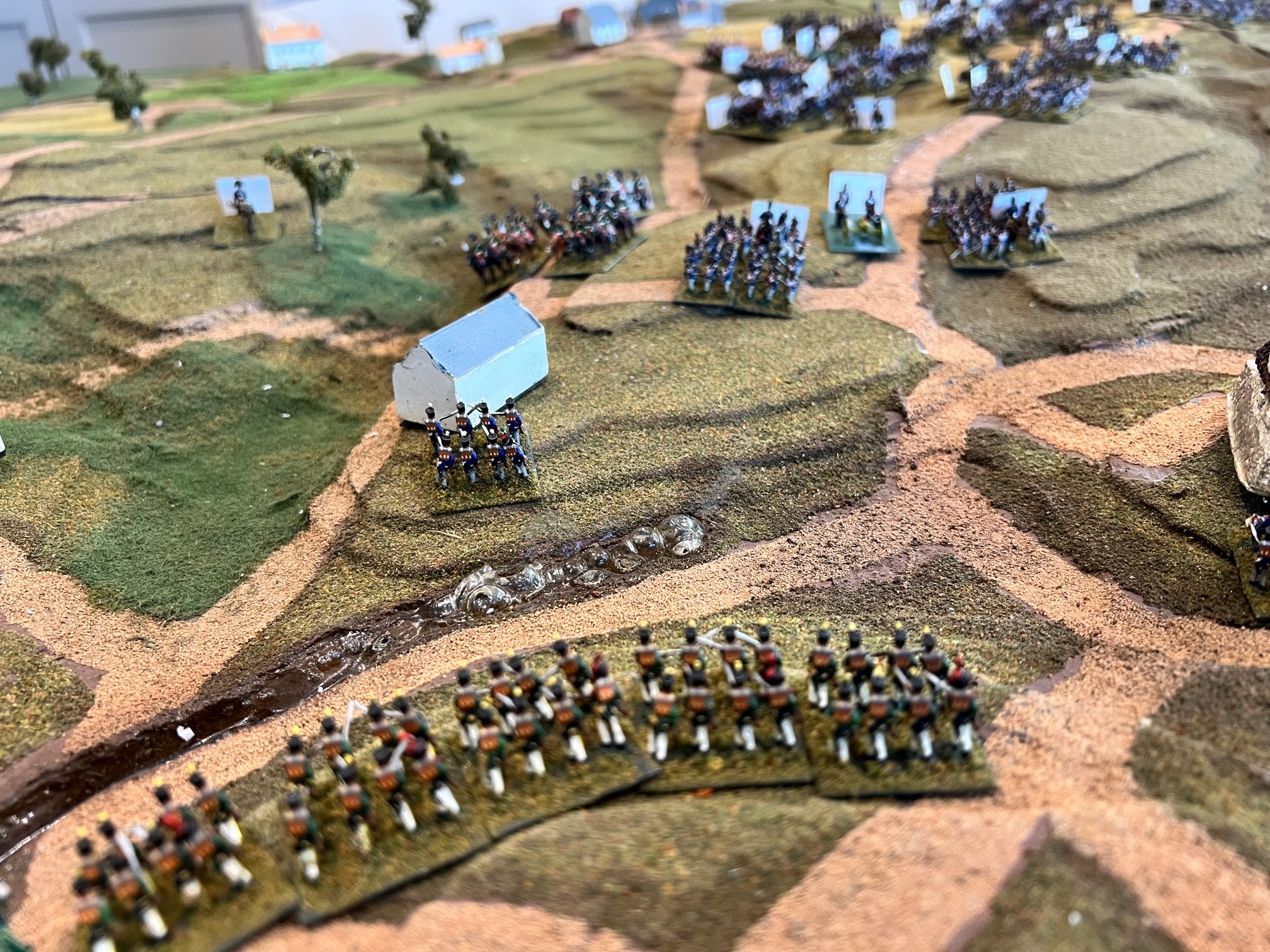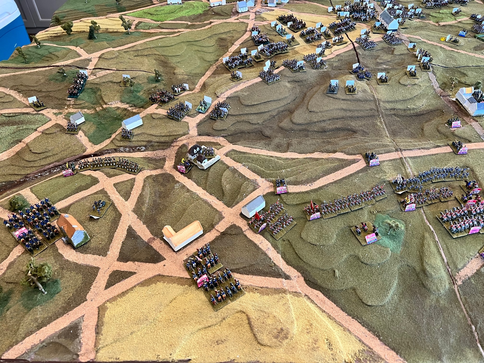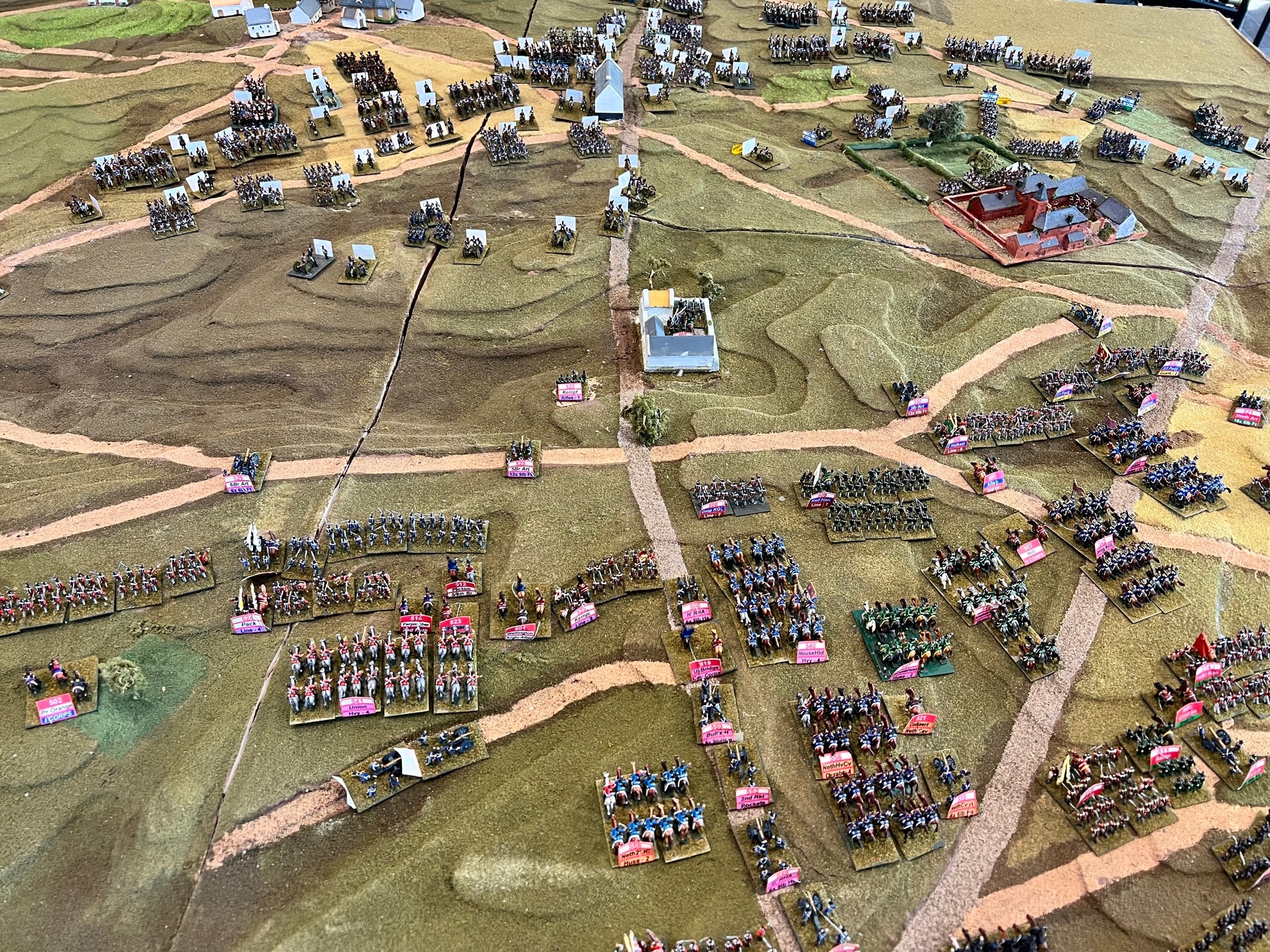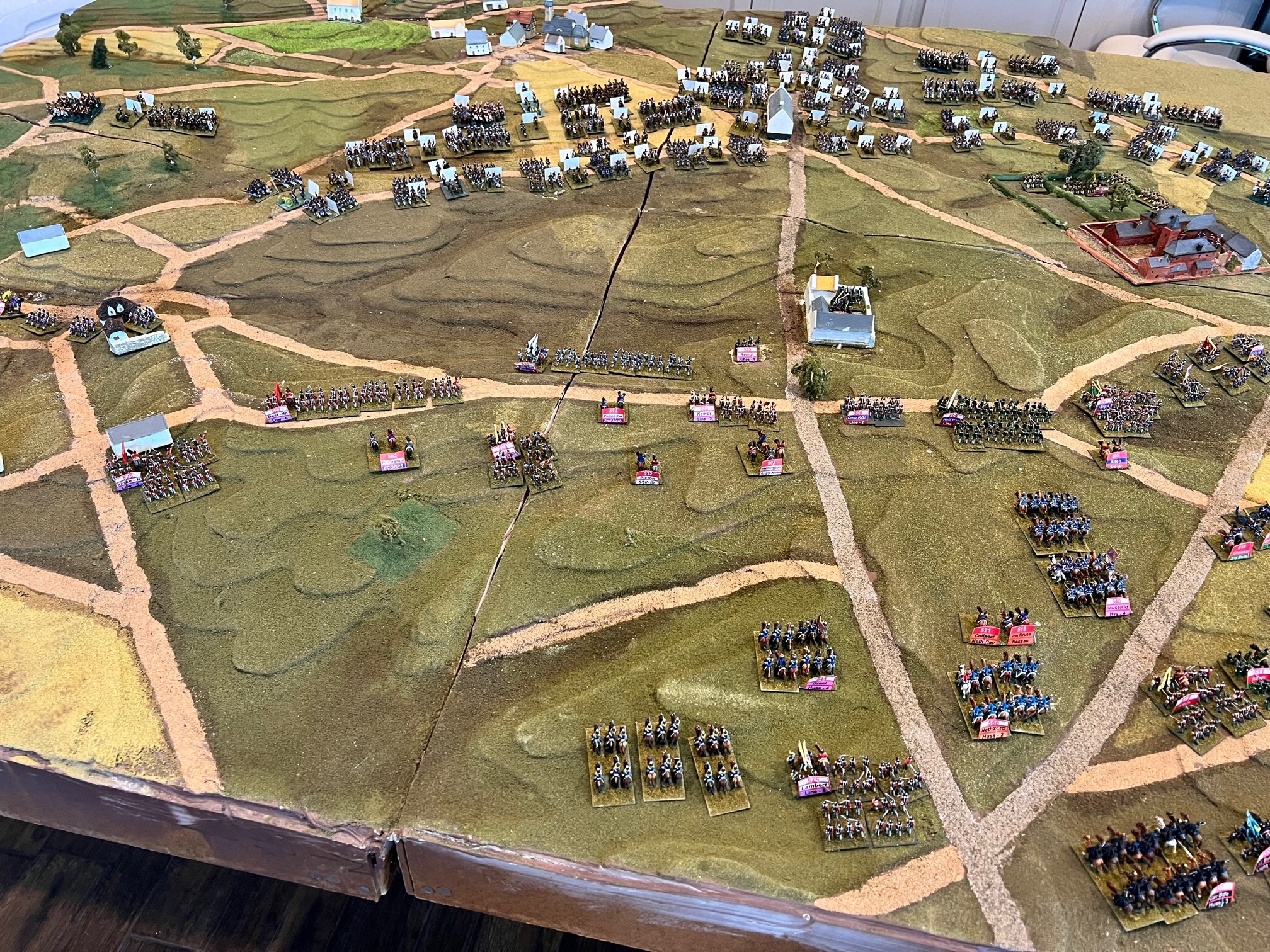 Waterloo campaign up to 12:00 PM. Jerry is the British and Jim (left wing) and Richard (right wing). Awaiting Lee with his Prussians and Brian with the reserve to enter the arena. At this point, no advantage to either side. Carnage and Glory Rules (May 28, 2022)