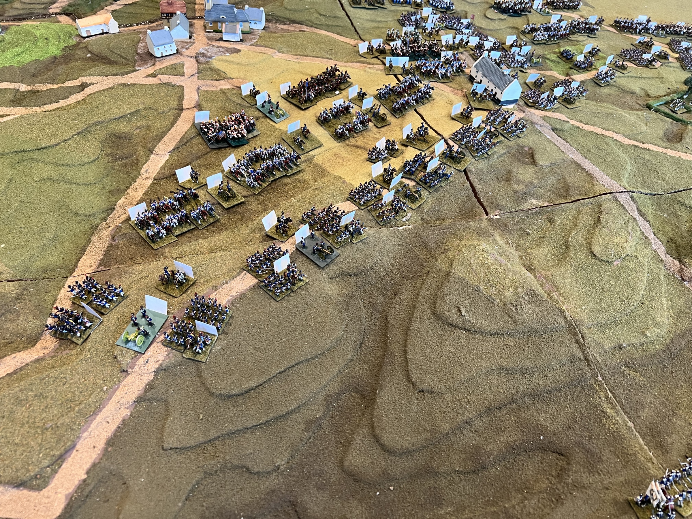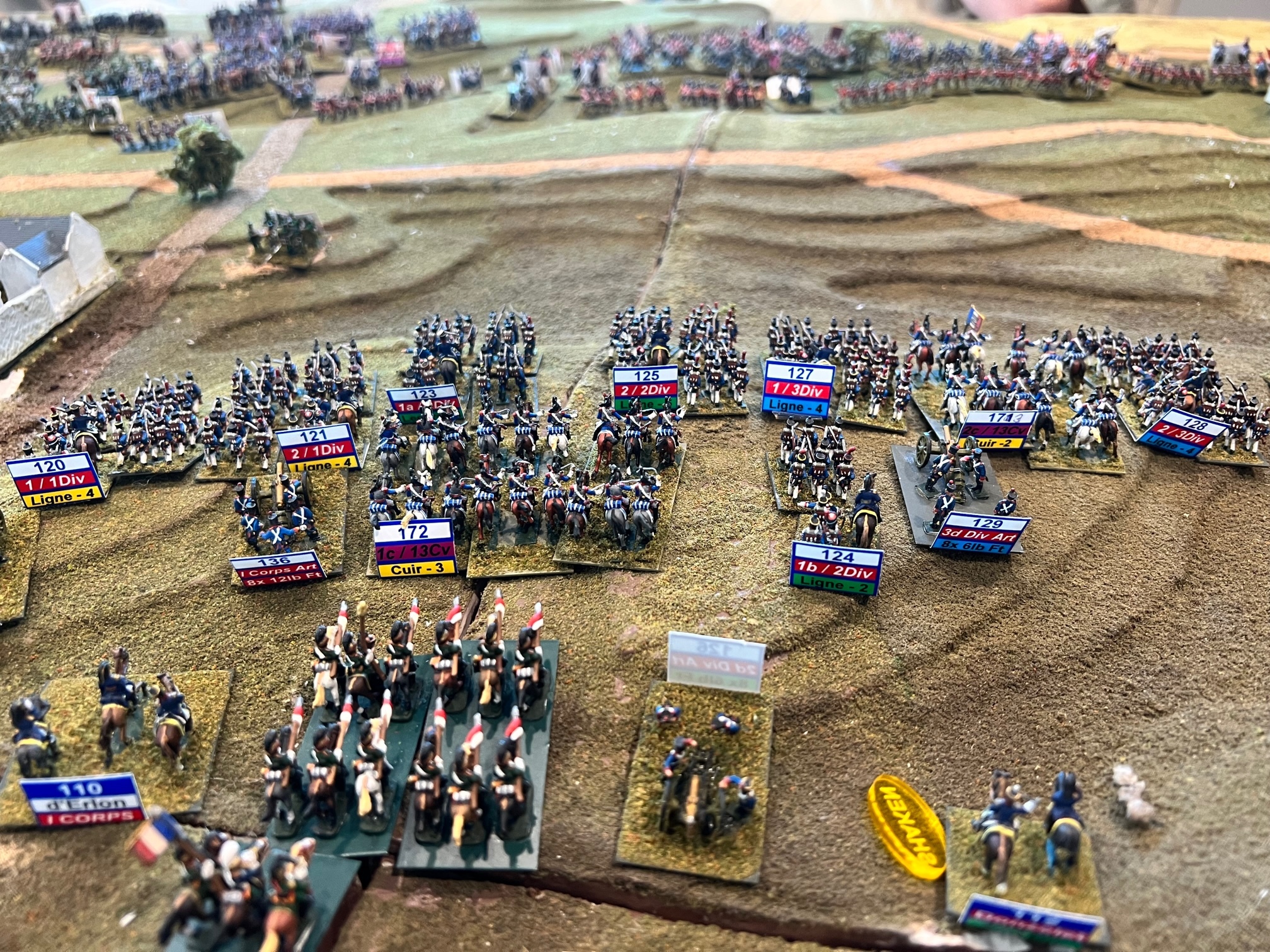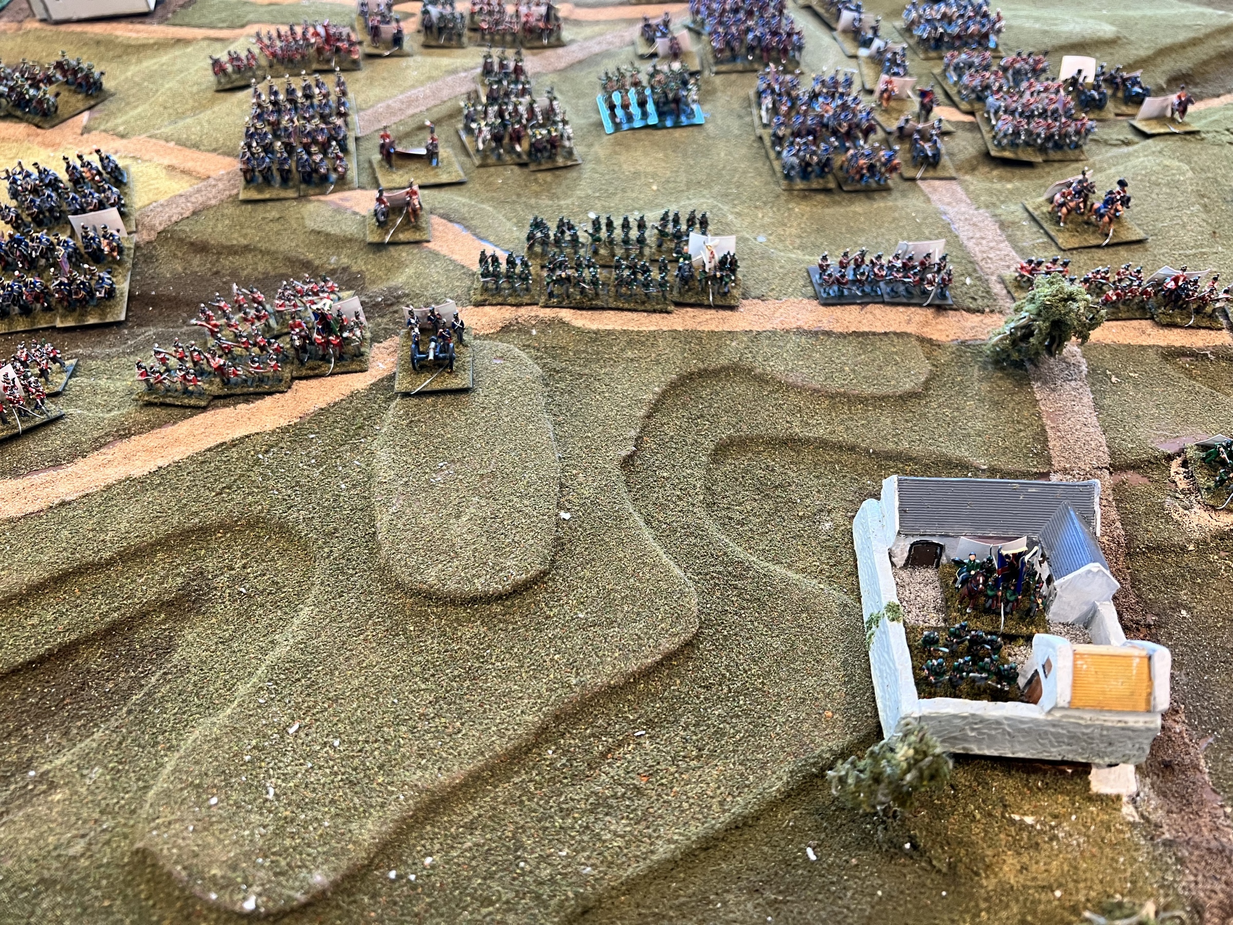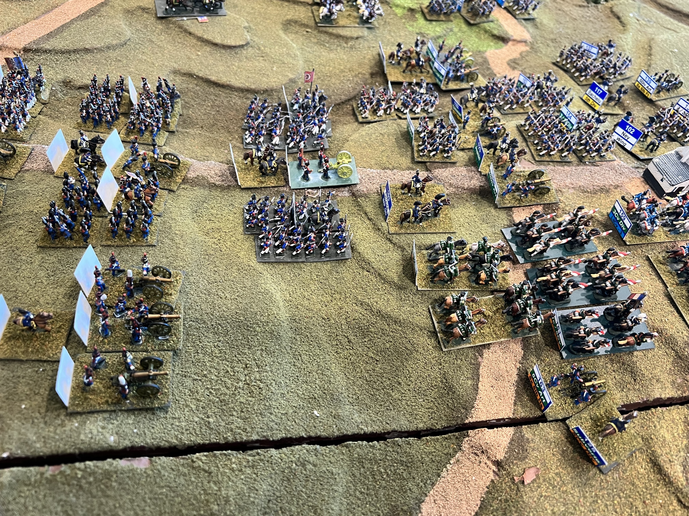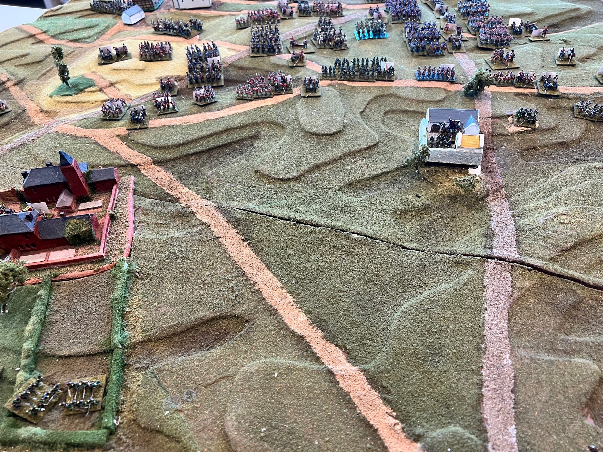 Waterloo campaign up to 12:00 PM. Jerry is the British and Jim (left wing) and Richard (right wing). Awaiting Lee with his Prussians and Brian with the reserve to enter the arena. At this point, no advantage to either side. Carnage and Glory Rules (May 28, 2022)