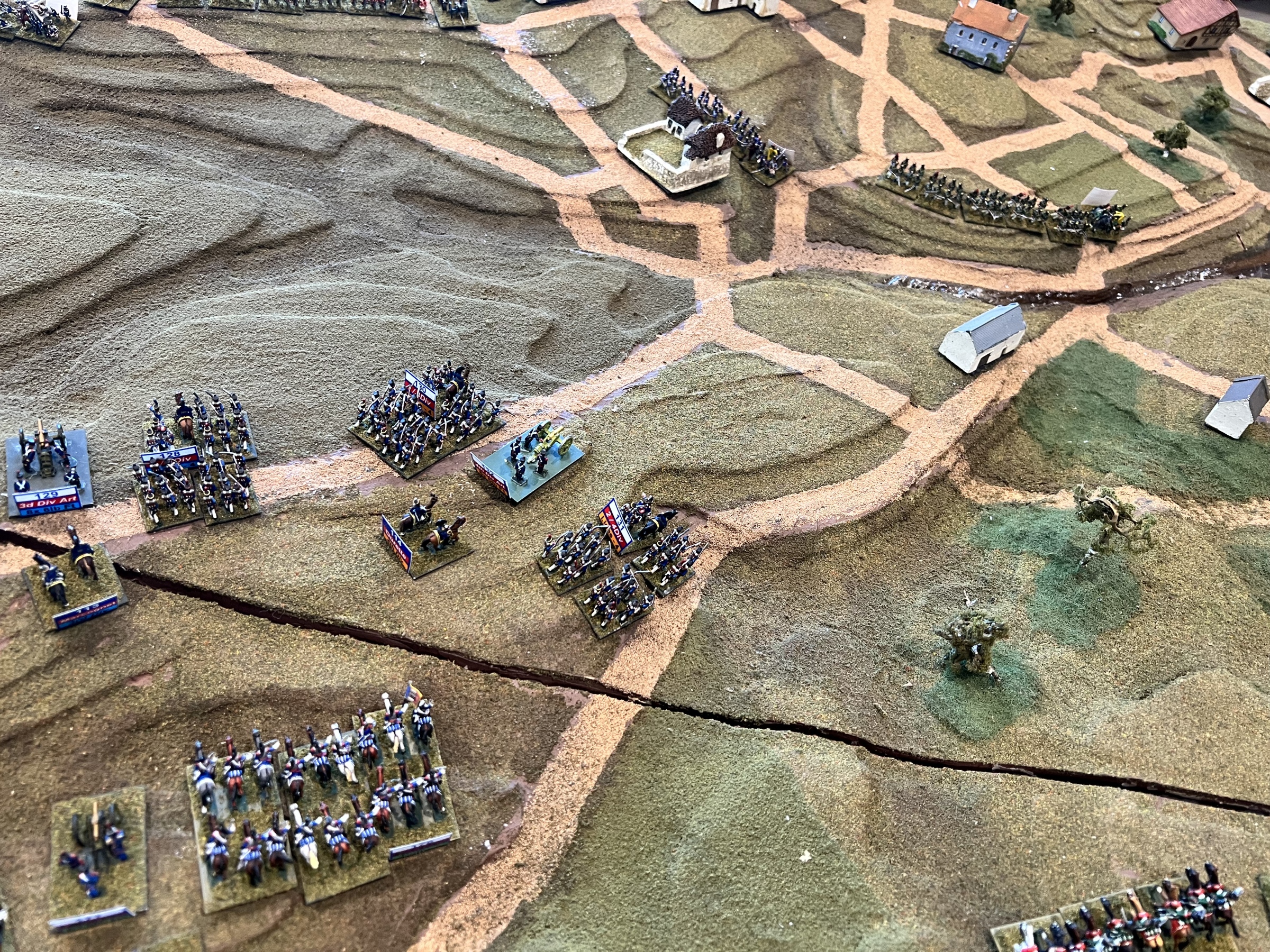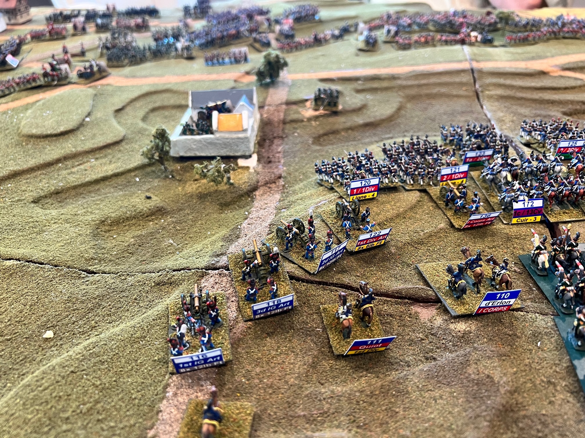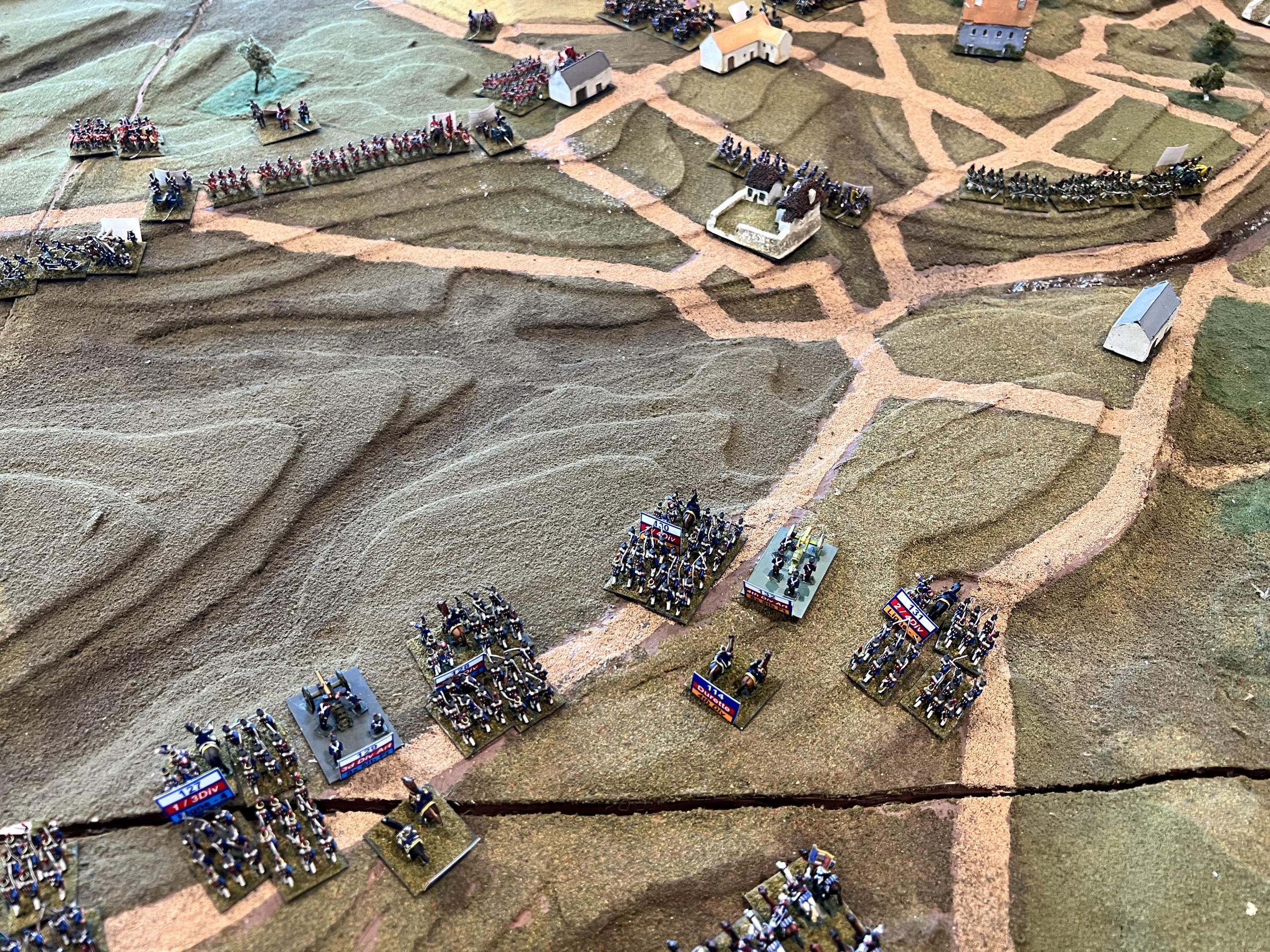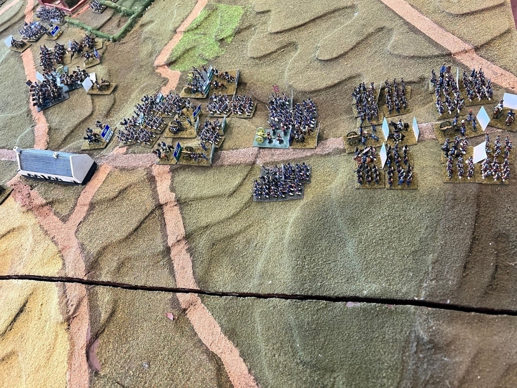 Waterloo campaign up to 12:00 PM. Jerry is the British and Jim (left wing) and Richard (right wing). Awaiting Lee with his Prussians and Brian with the reserve to enter the arena. At this point, no advantage to either side. Carnage and Glory Rules (May 28, 2022)