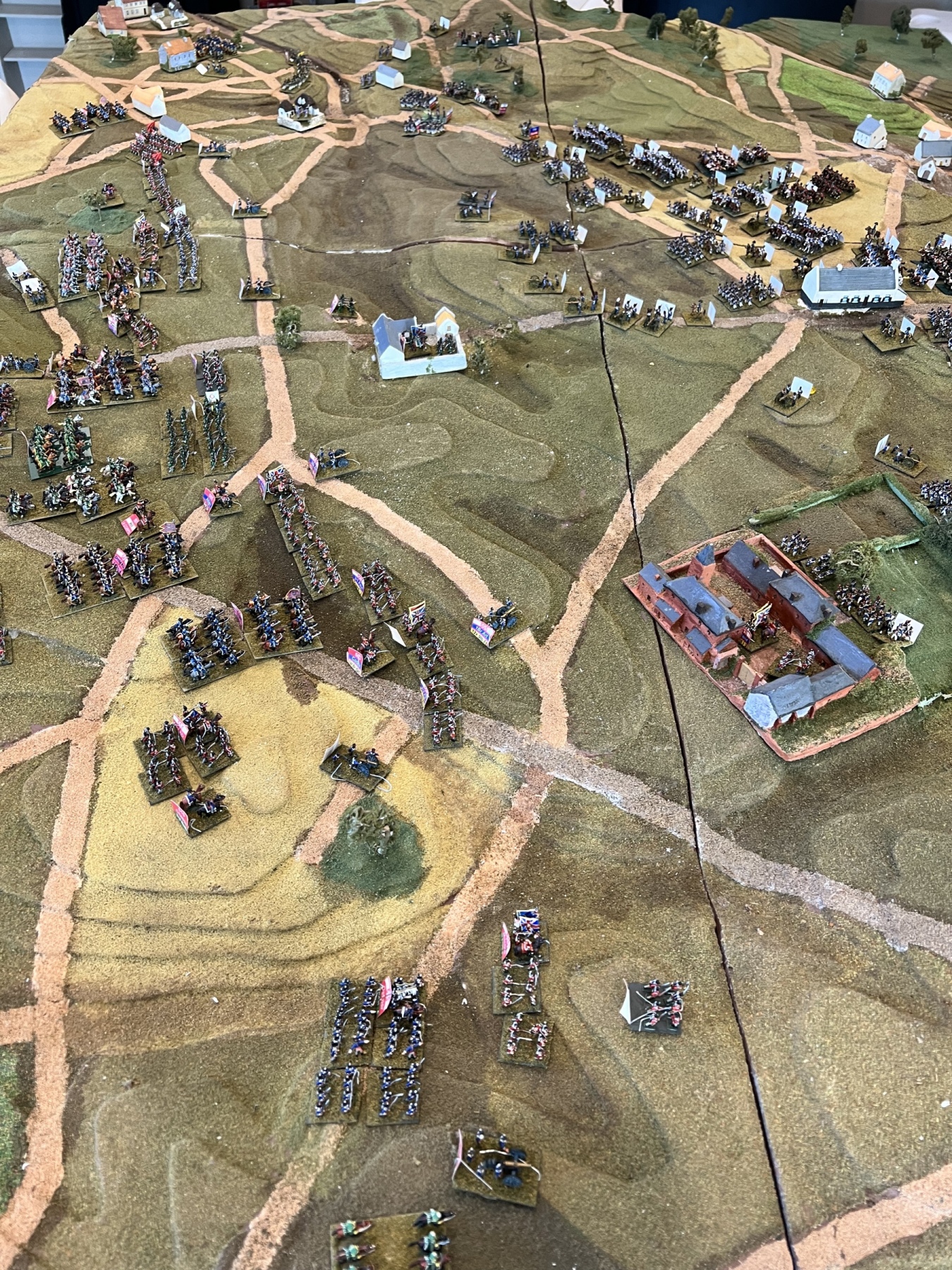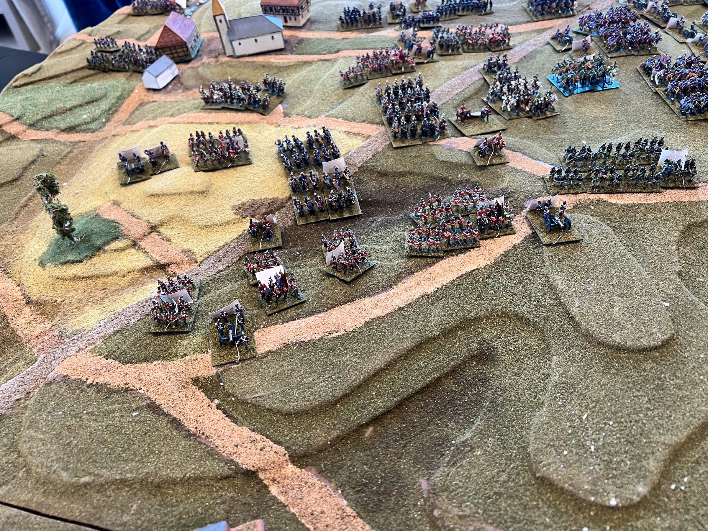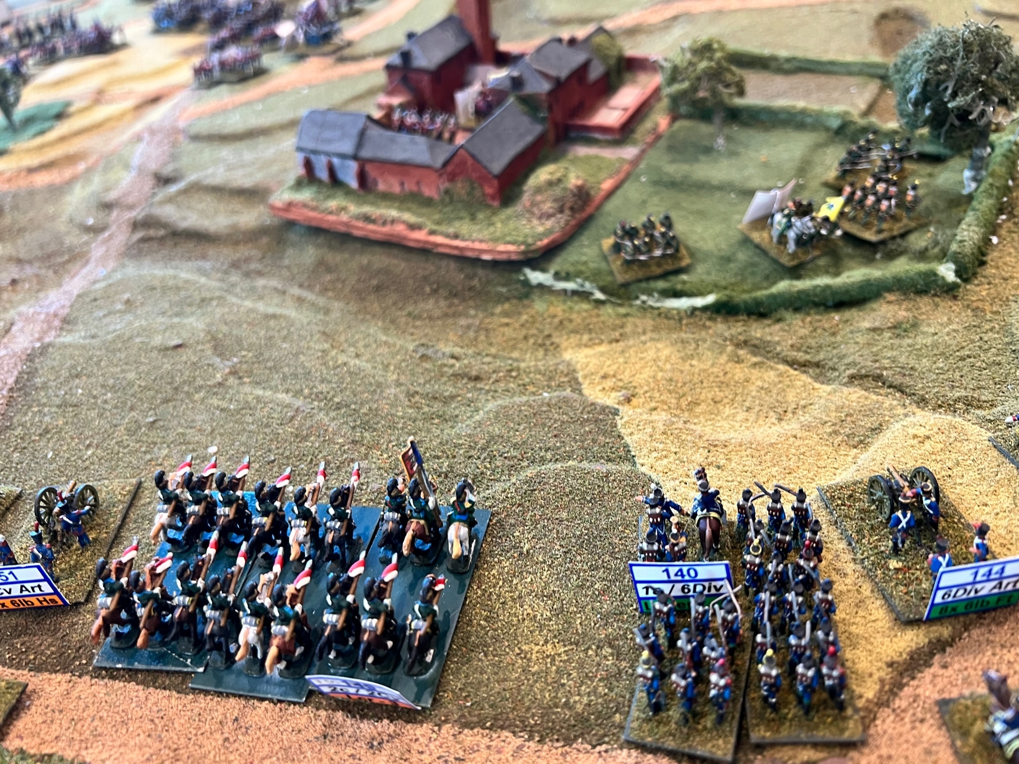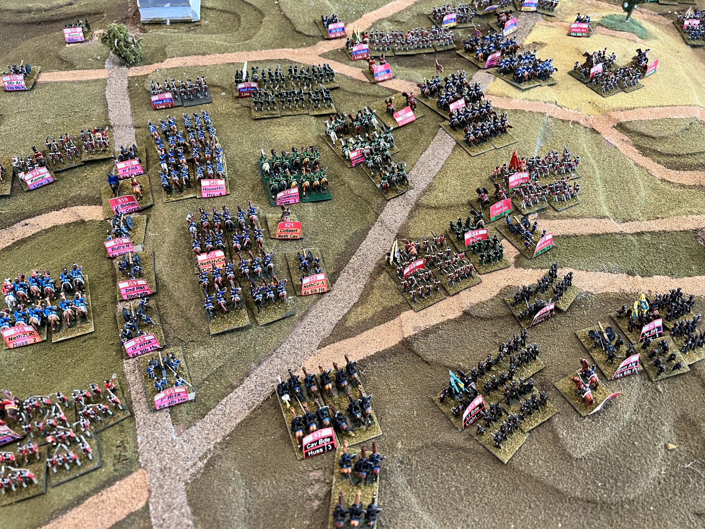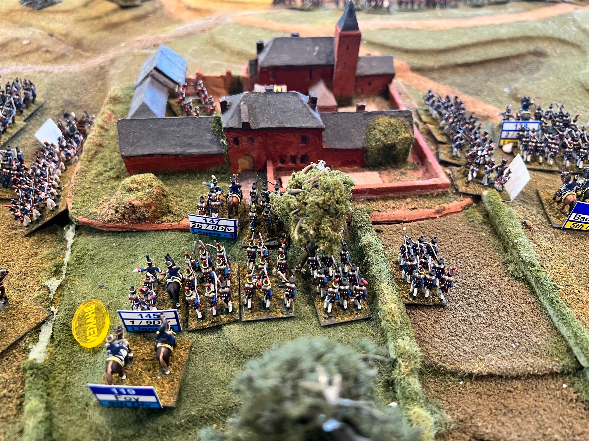 Waterloo campaign up to 12:00 PM. Jerry is the British and Jim (left wing) and Richard (right wing). Awaiting Lee with his Prussians and Brian with the reserve to enter the arena. At this point, no advantage to either side. Carnage and Glory Rules (May 28, 2022)