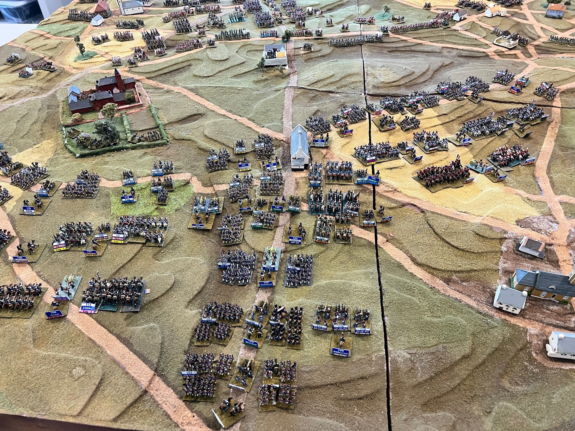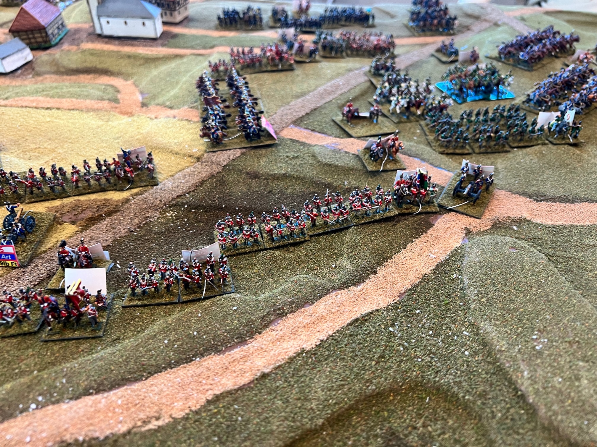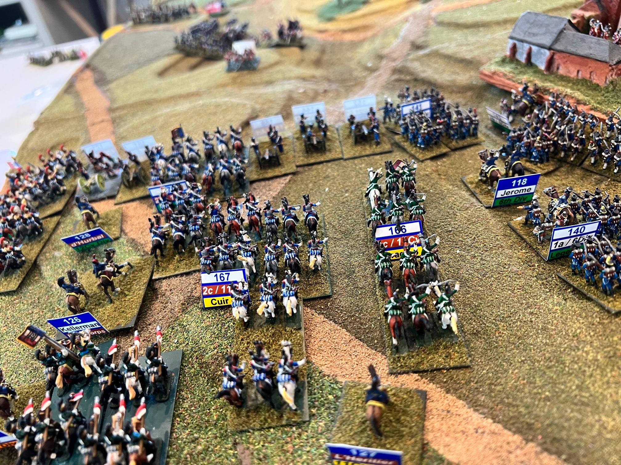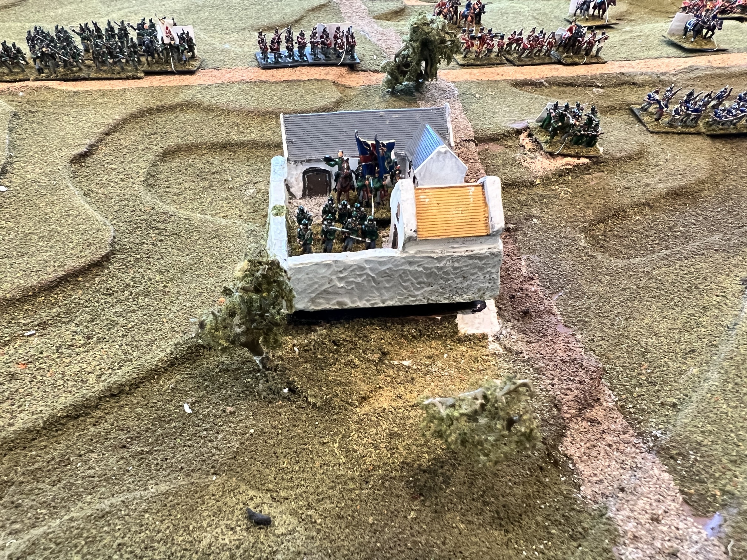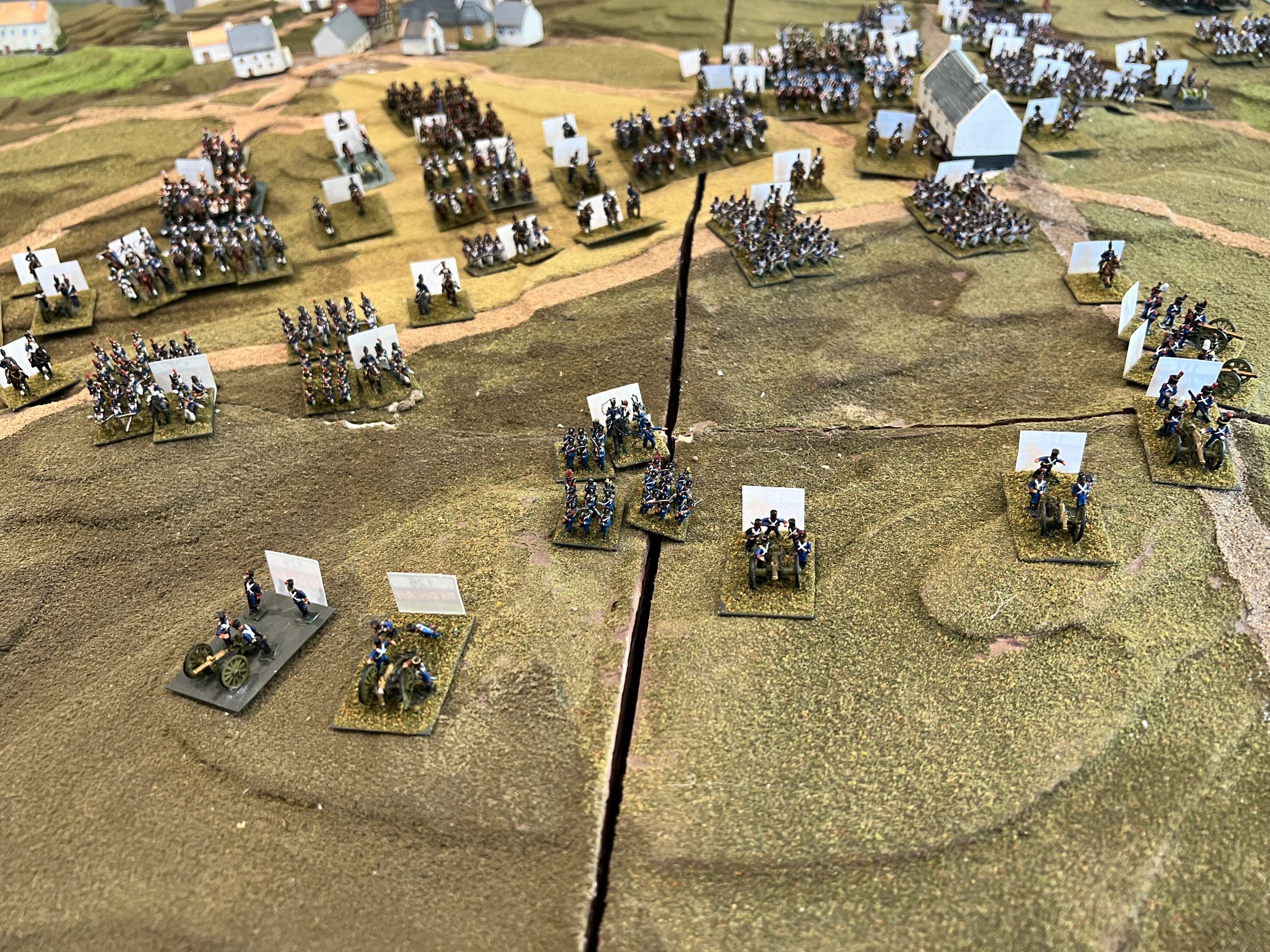 Waterloo campaign up to 12:00 PM. Jerry is the British and Jim (left wing) and Richard (right wing). Awaiting Lee with his Prussians and Brian with the reserve to enter the arena. At this point, no advantage to either side. Carnage and Glory Rules (May 28, 2022)