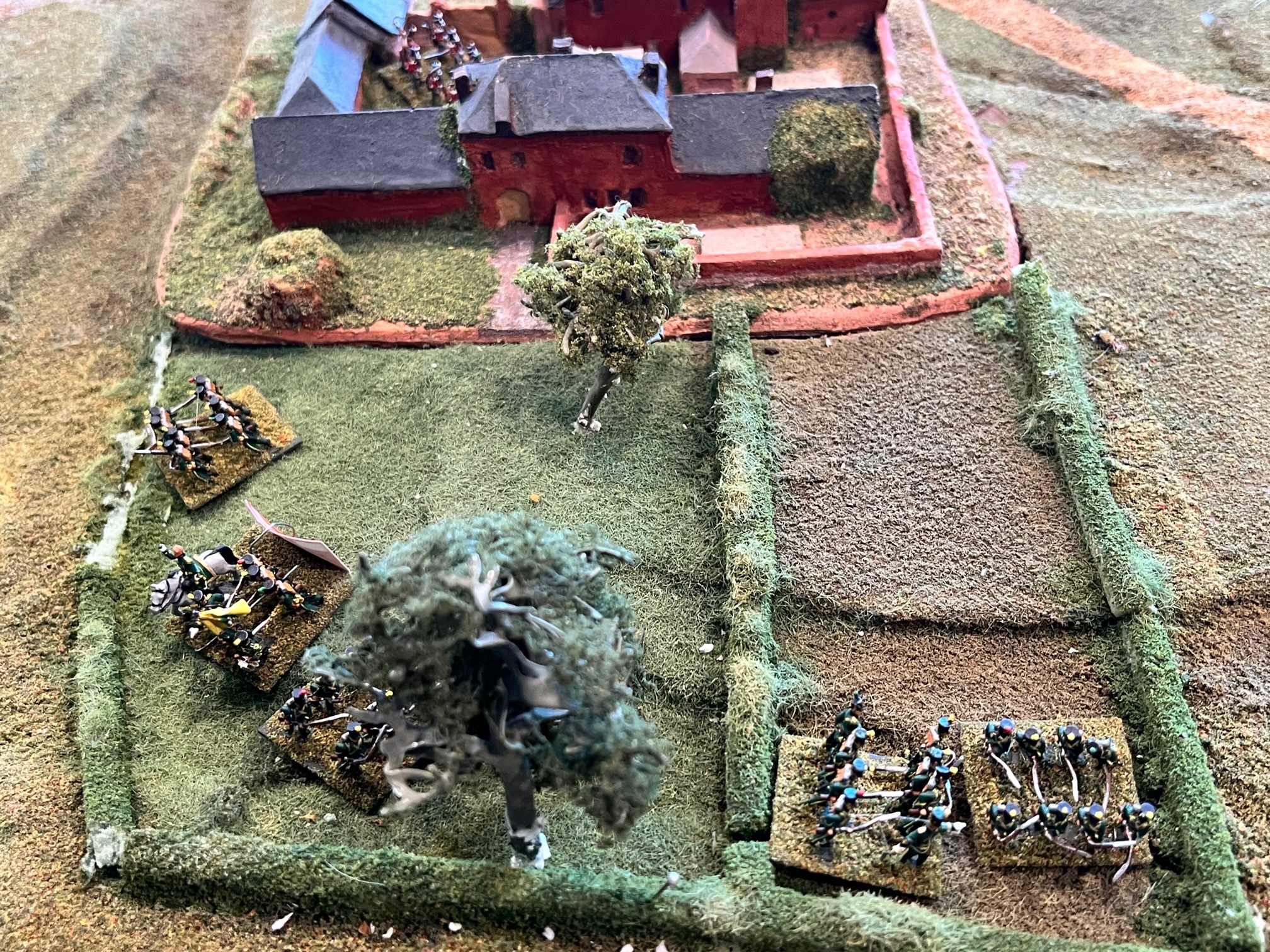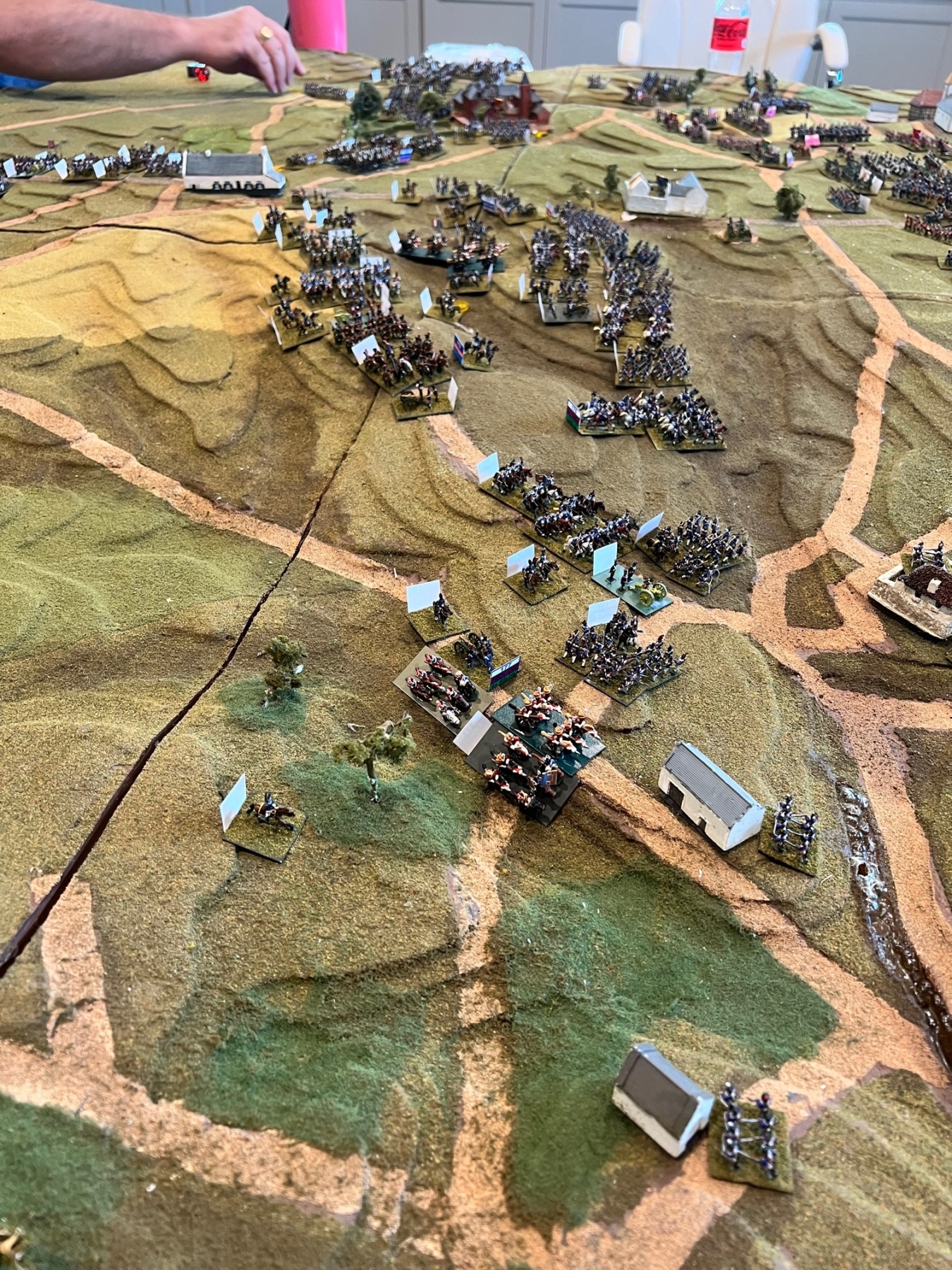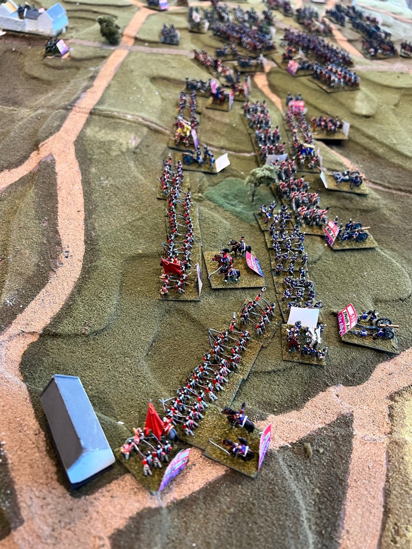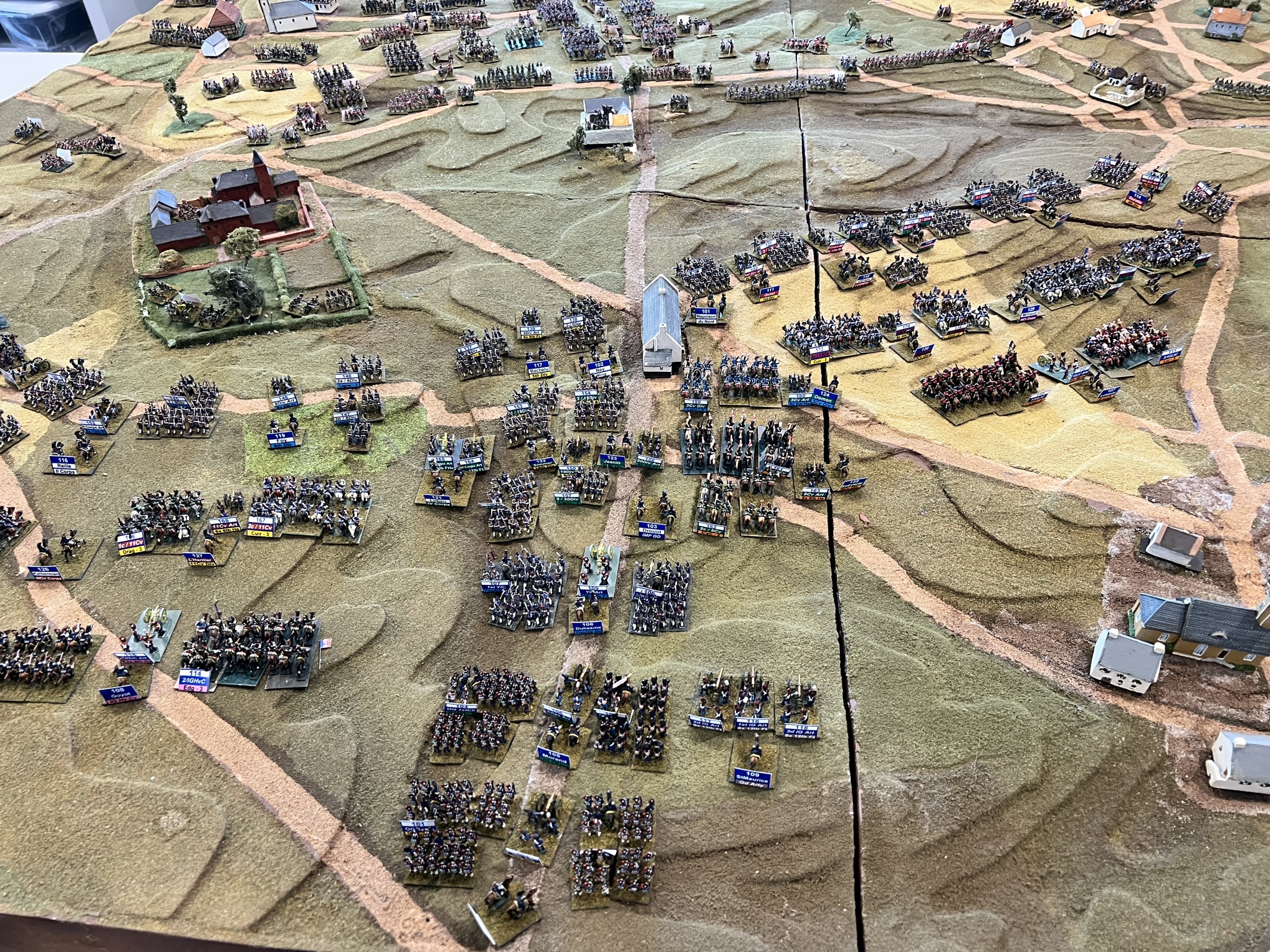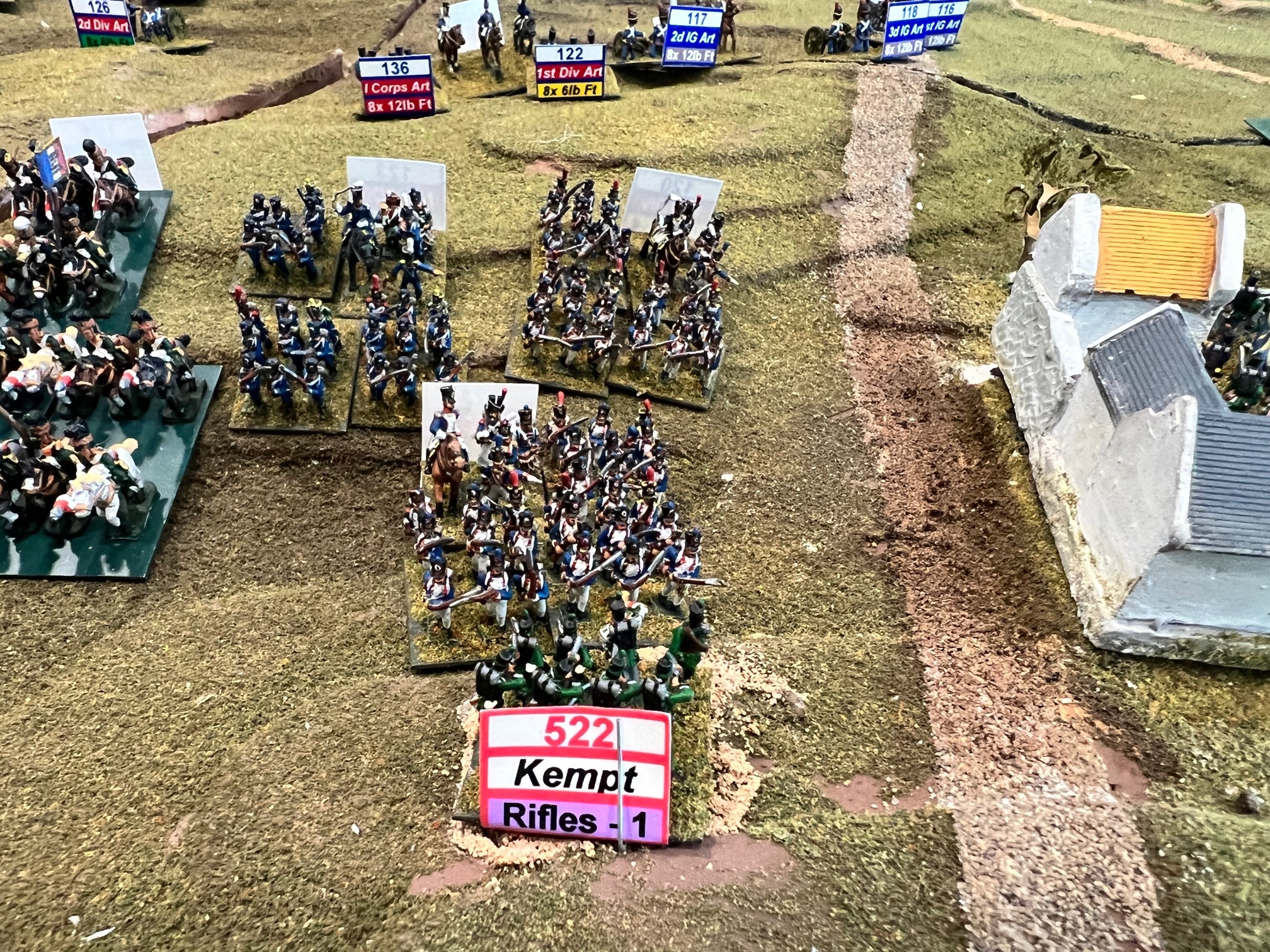 Waterloo campaign up to 12:00 PM. Jerry is the British and Jim (left wing) and Richard (right wing). Awaiting Lee with his Prussians and Brian with the reserve to enter the arena. At this point, no advantage to either side. Carnage and Glory Rules (May 28, 2022)