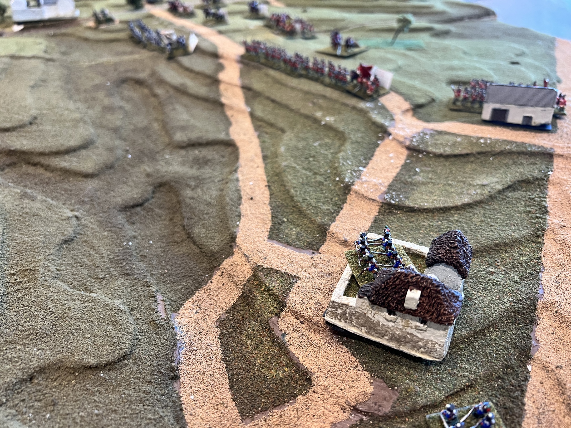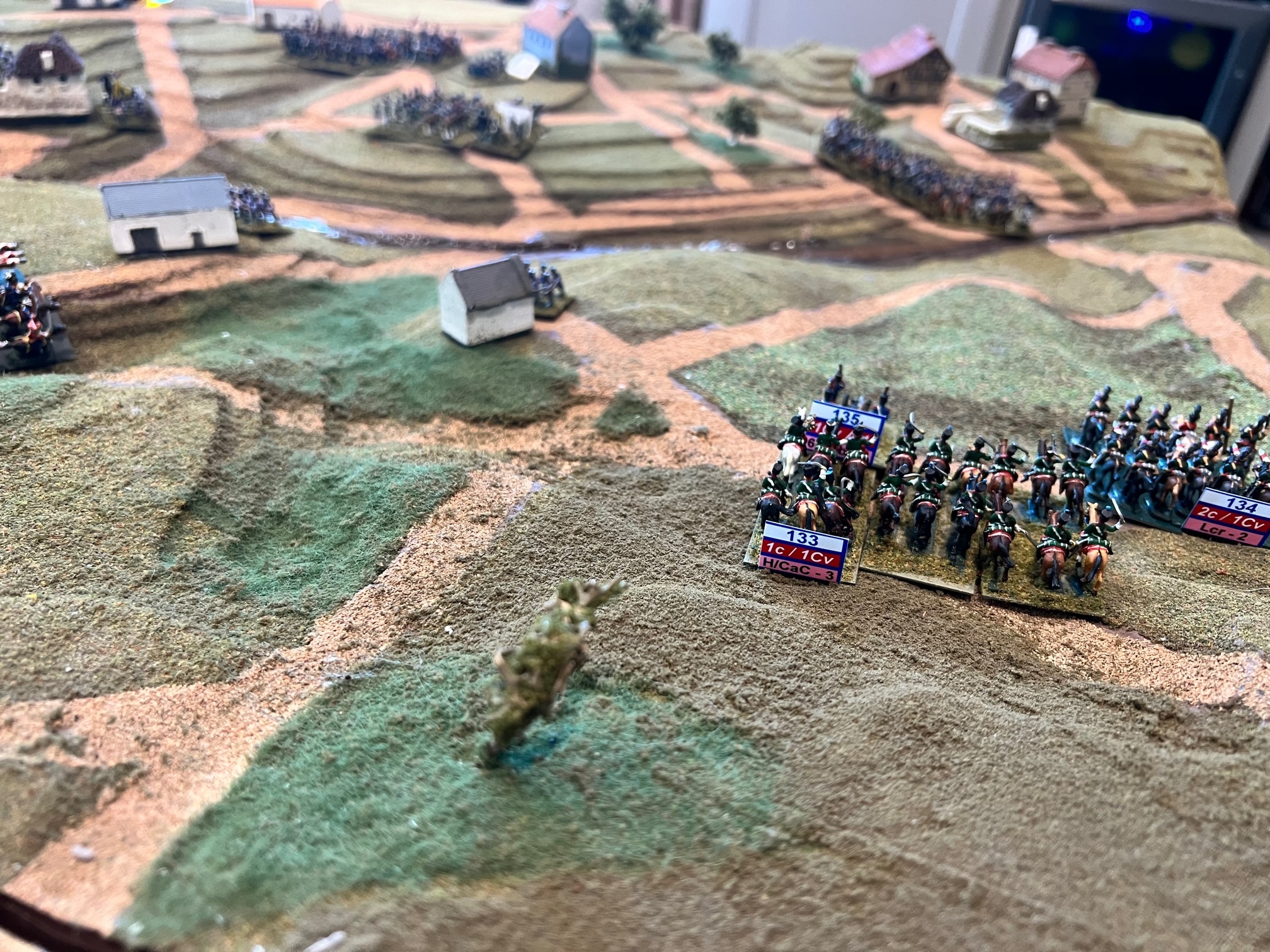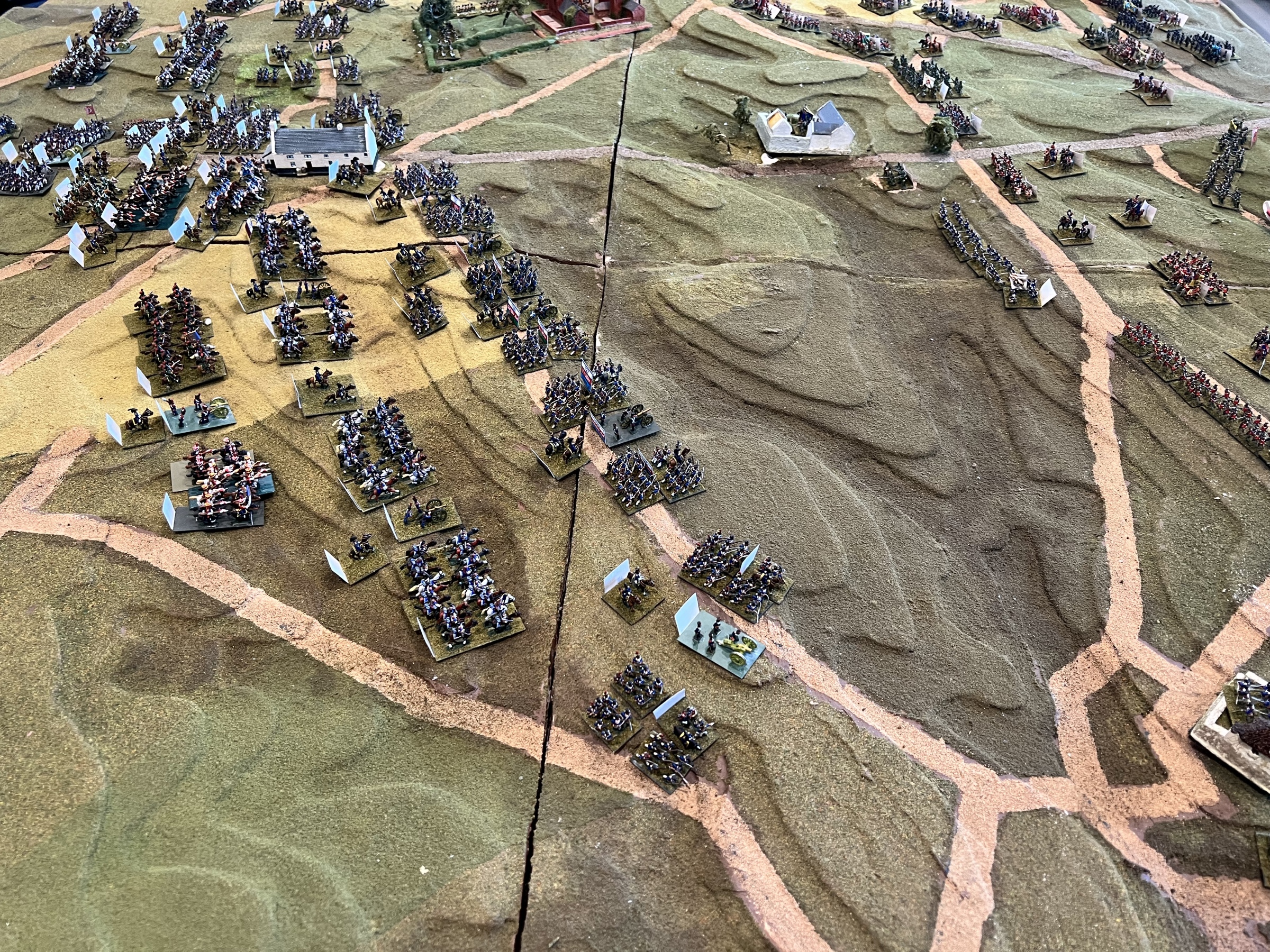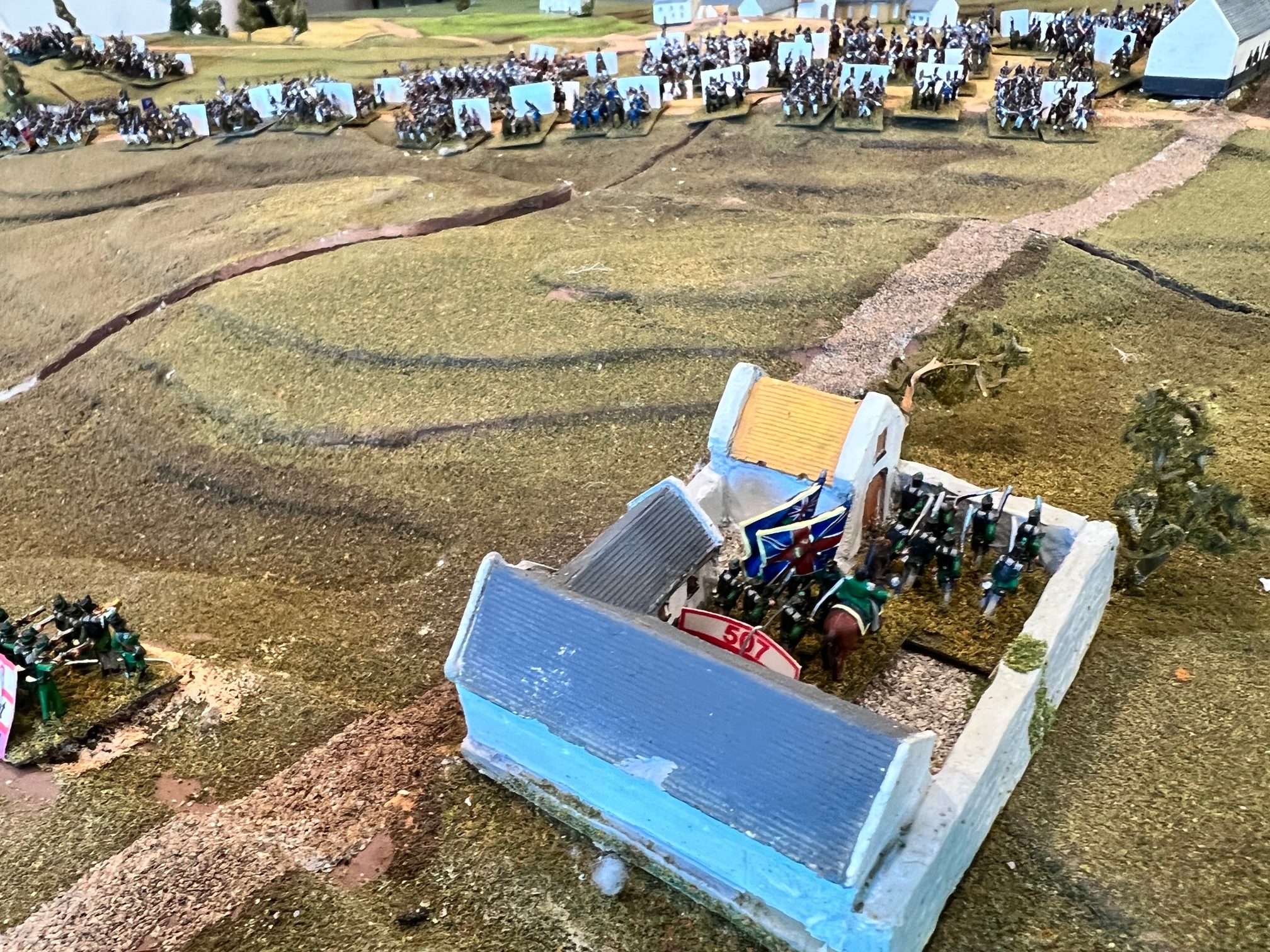Waterloo campaign up to 12:00 PM. Jerry is the British and Jim (left wing) and Richard (right wing). Awaiting Lee with his Prussians and Brian with the reserve to enter the arena. At this point, no advantage to either side. Carnage and Glory Rules (May 28, 2022)
