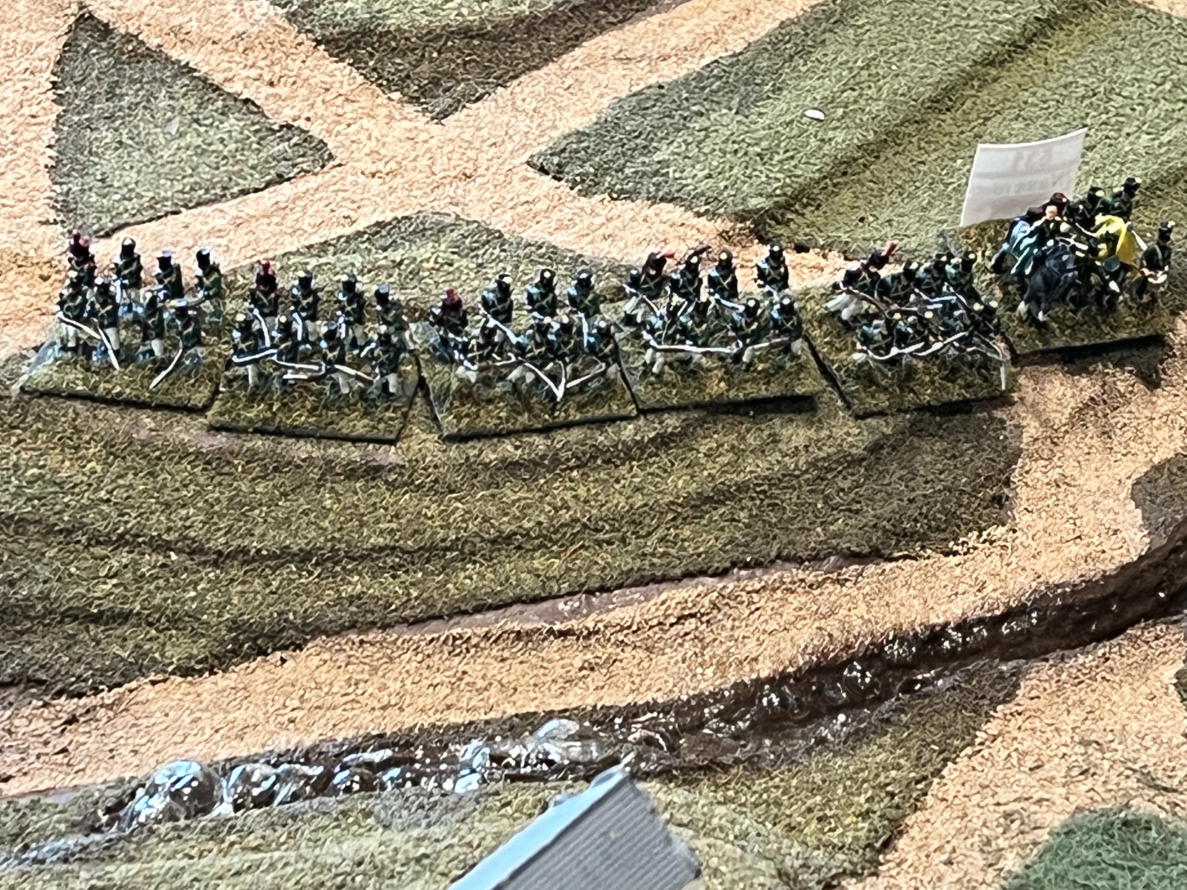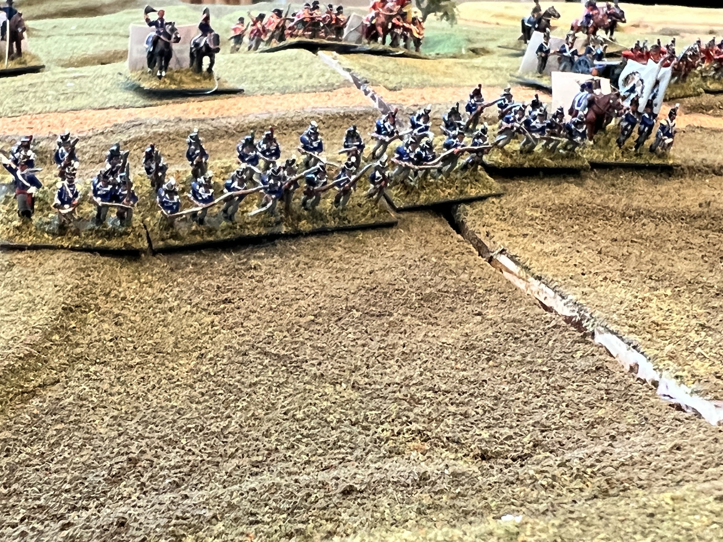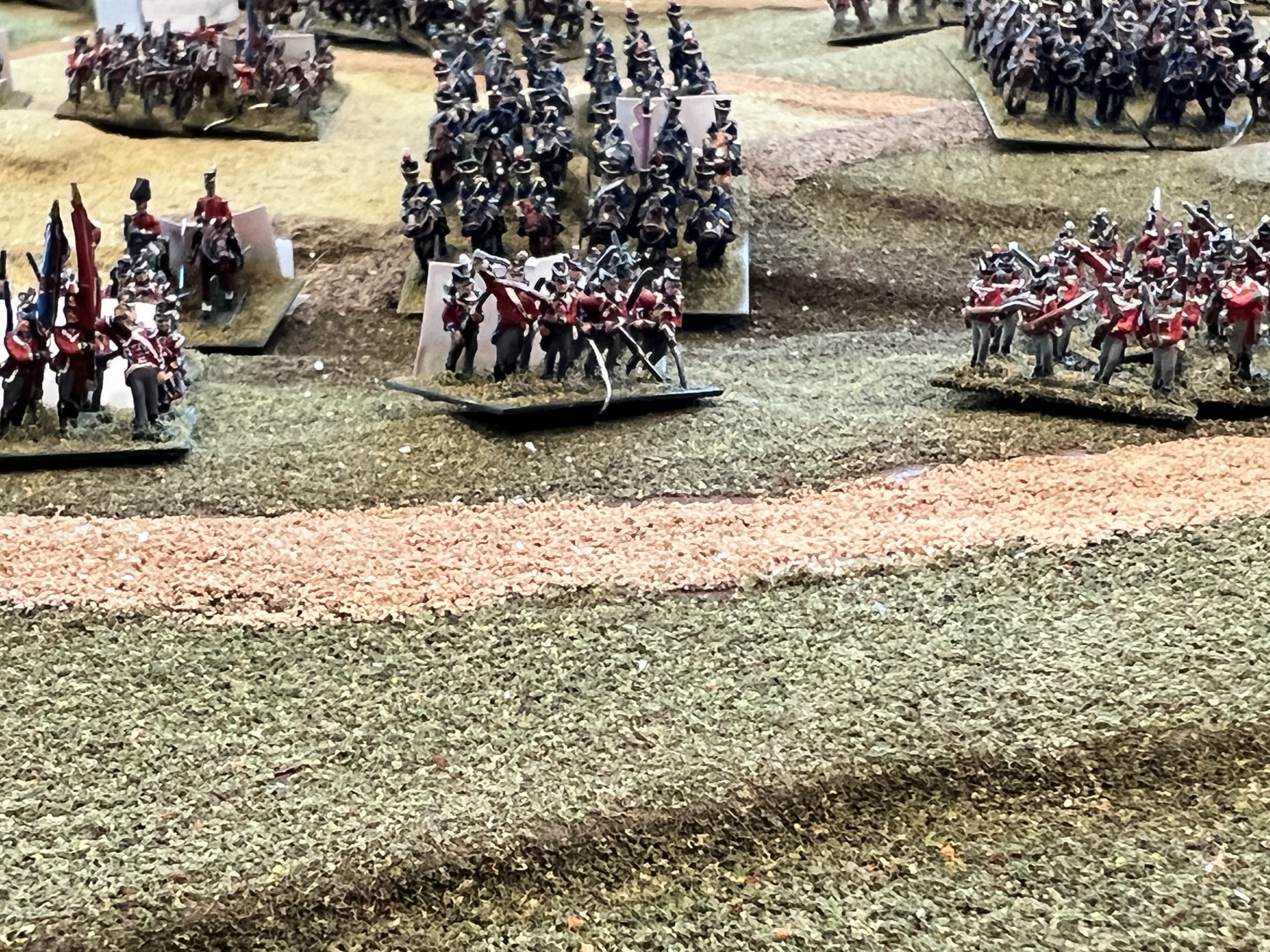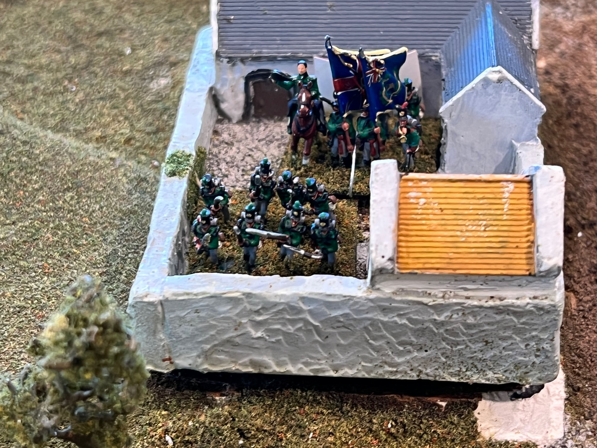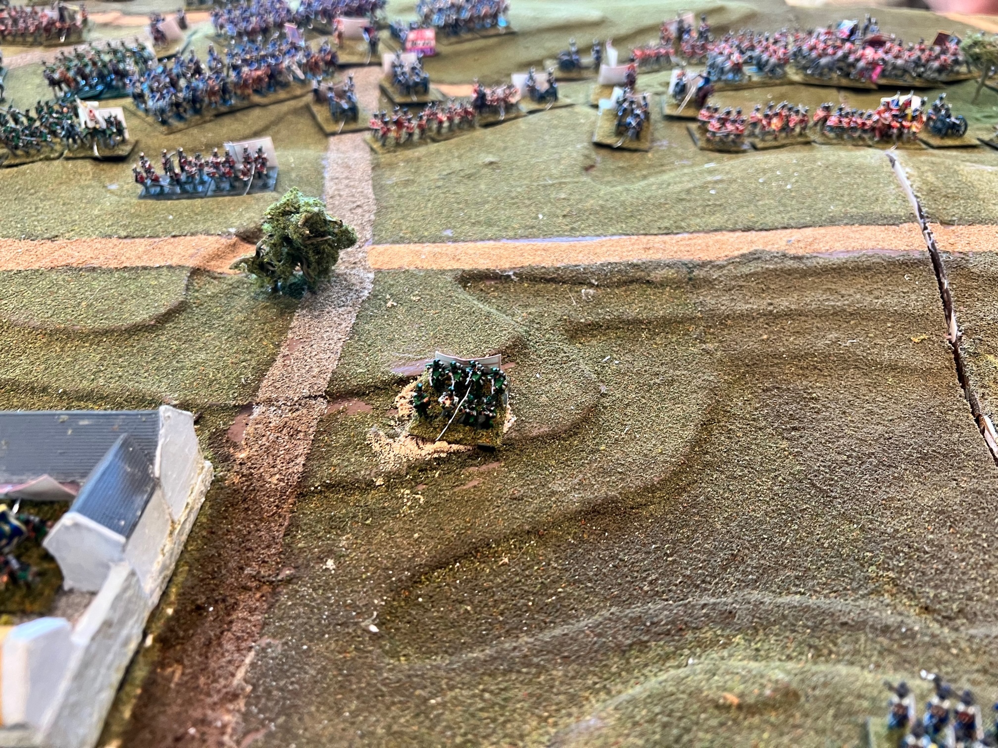 Waterloo campaign up to 12:00 PM. Jerry is the British and Jim (left wing) and Richard (right wing). Awaiting Lee with his Prussians and Brian with the reserve to enter the arena. At this point, no advantage to either side. Carnage and Glory Rules (May 28, 2022)
