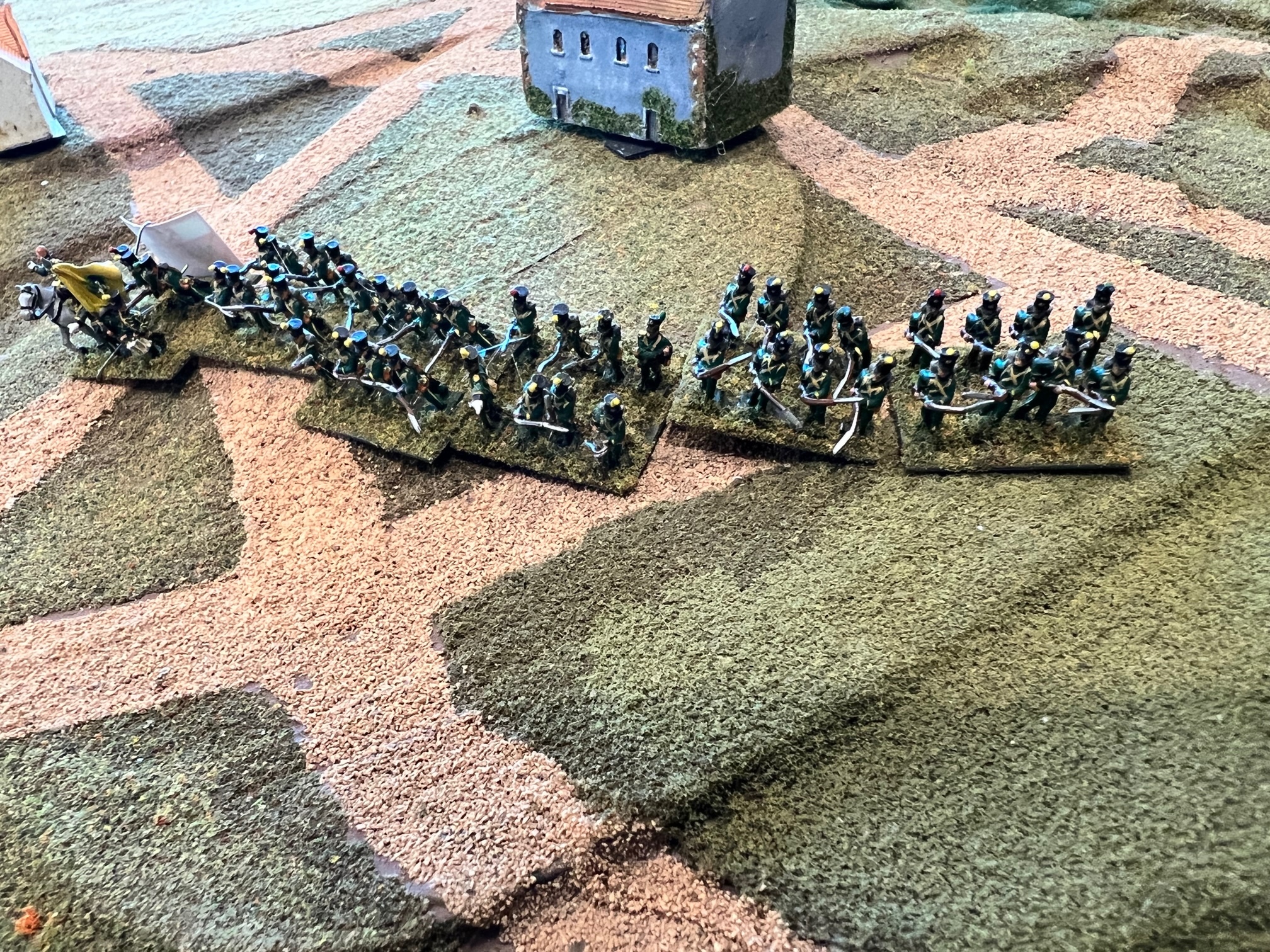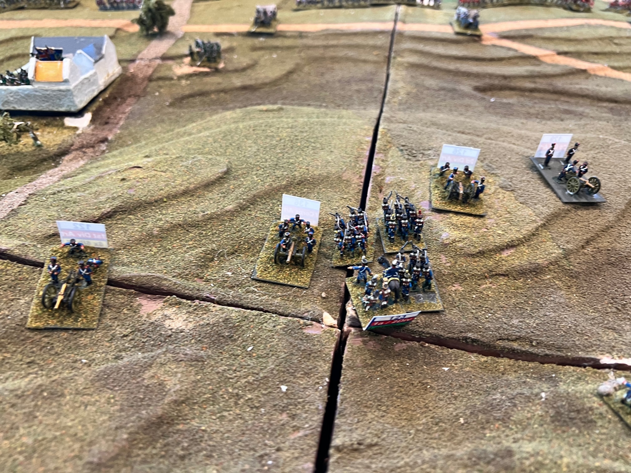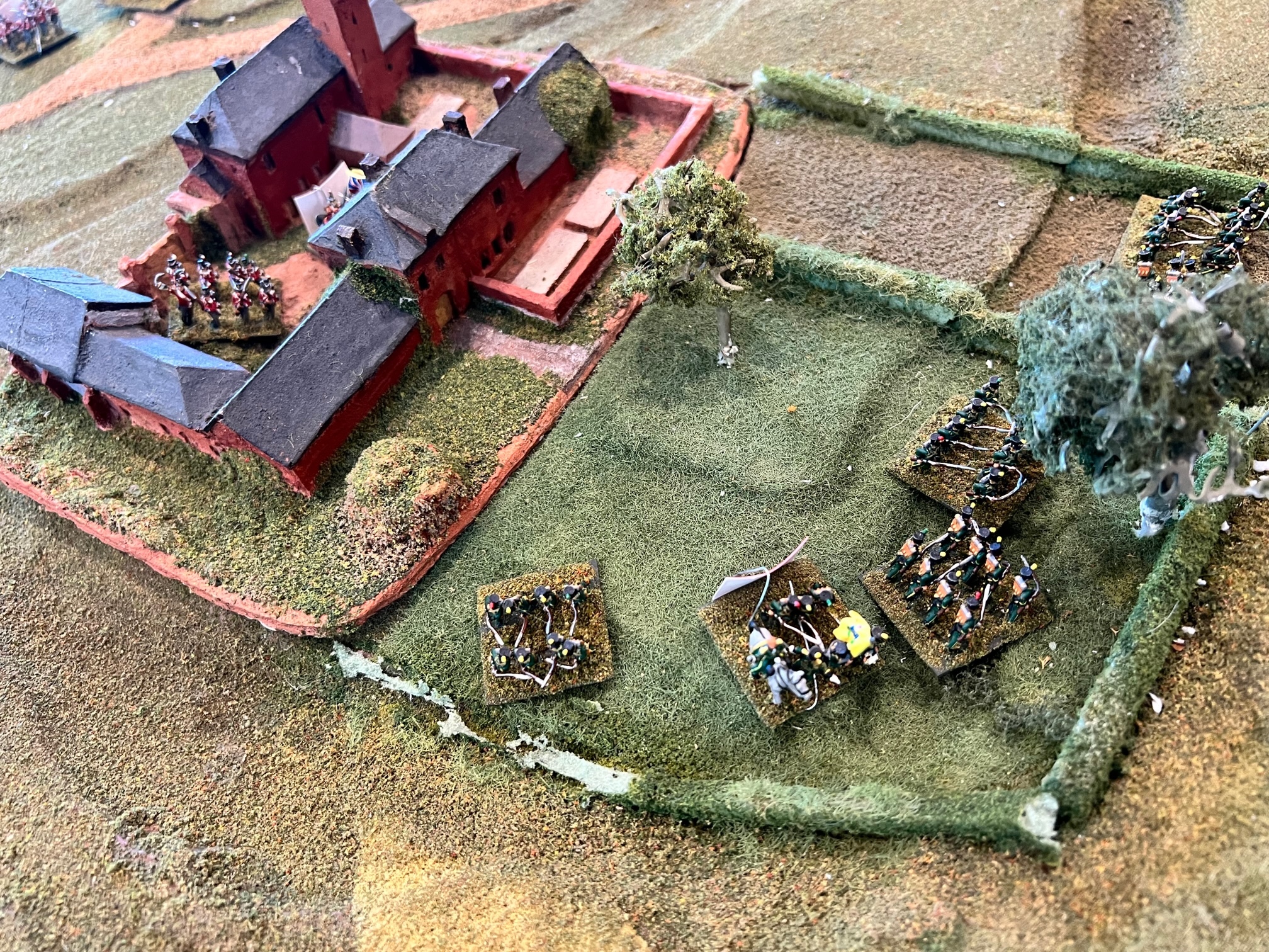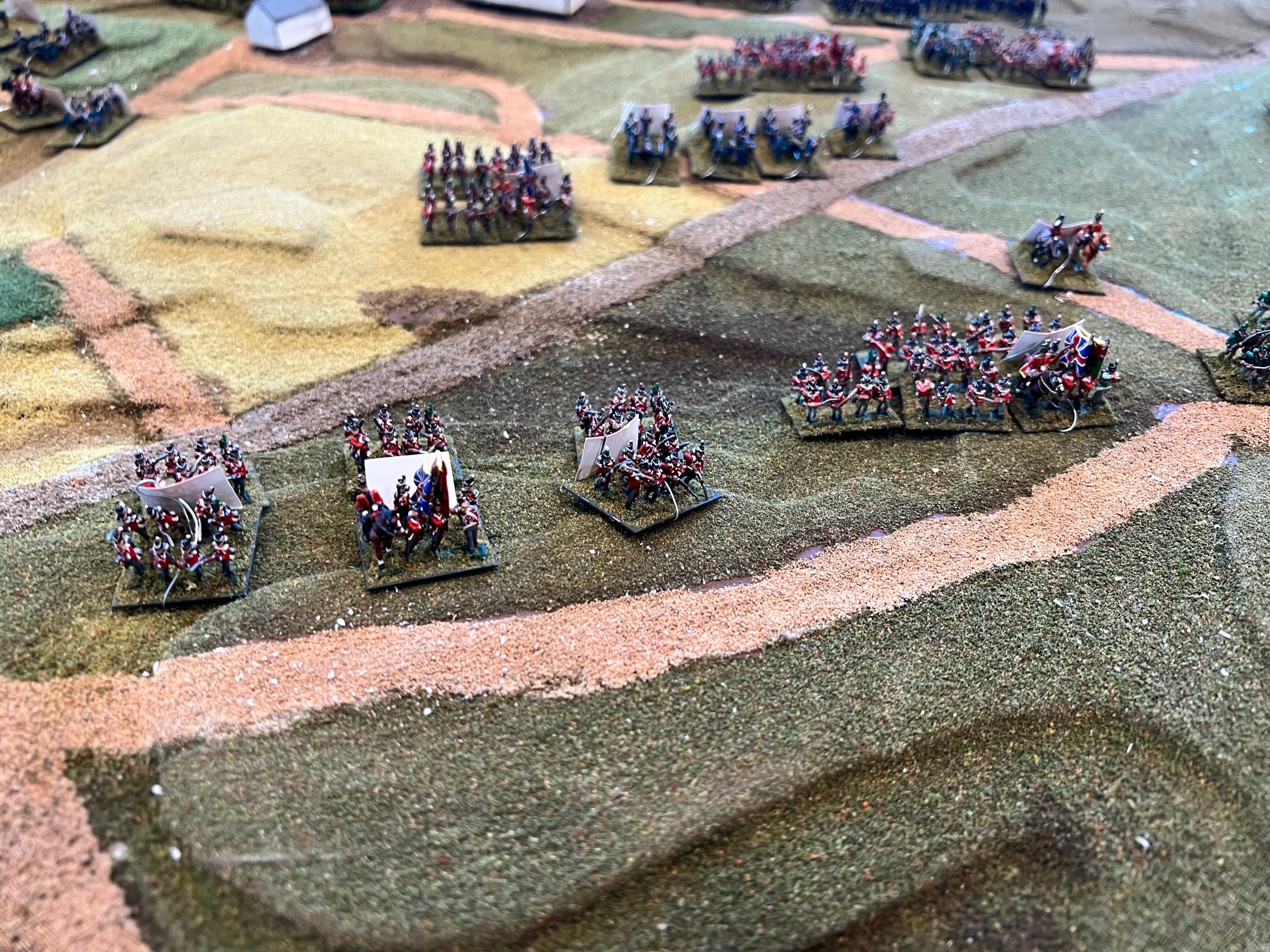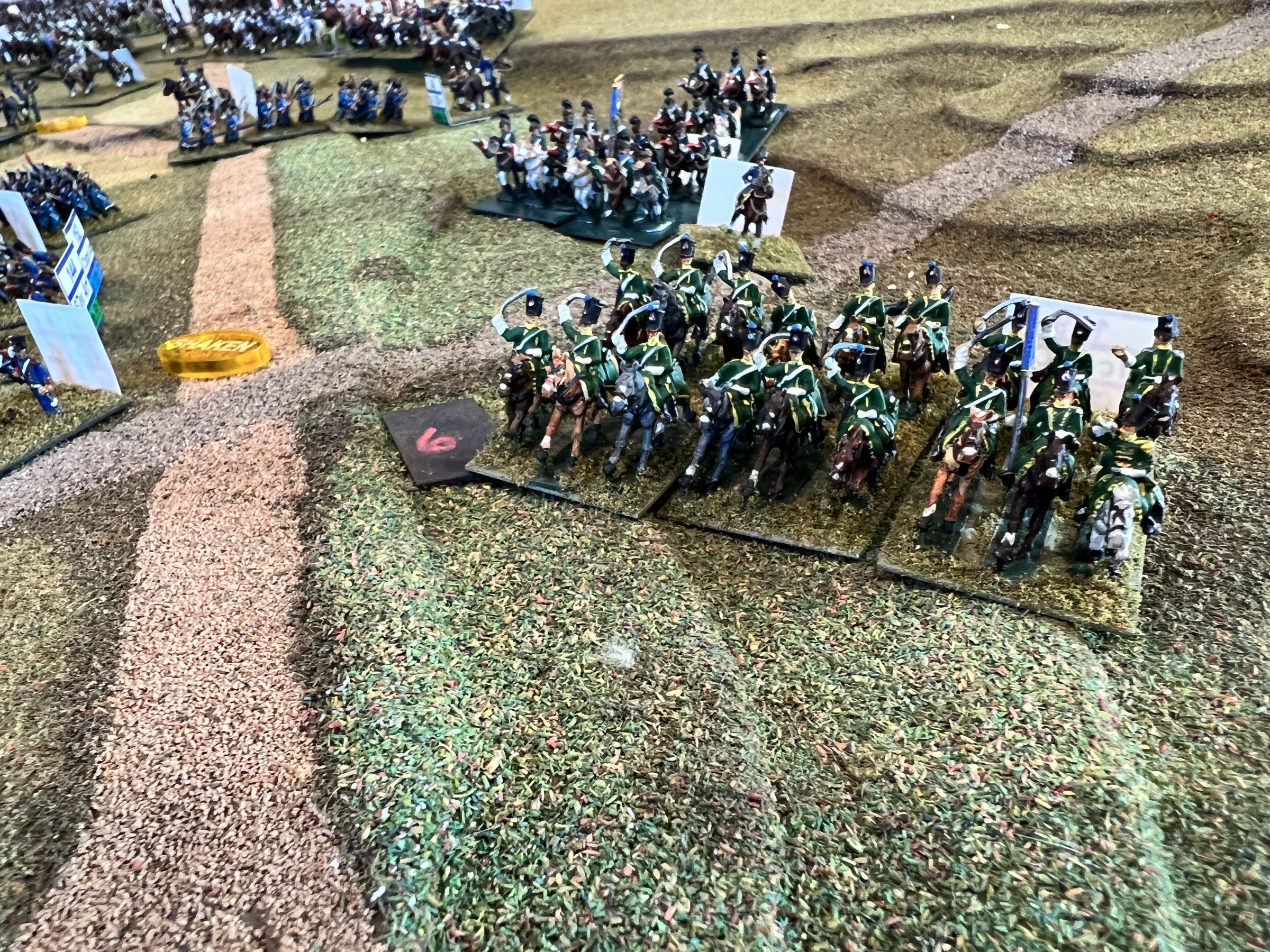 Waterloo campaign up to 12:00 PM. Jerry is the British and Jim (left wing) and Richard (right wing). Awaiting Lee with his Prussians and Brian with the reserve to enter the arena. At this point, no advantage to either side. Carnage and Glory Rules (May 28, 2022)
