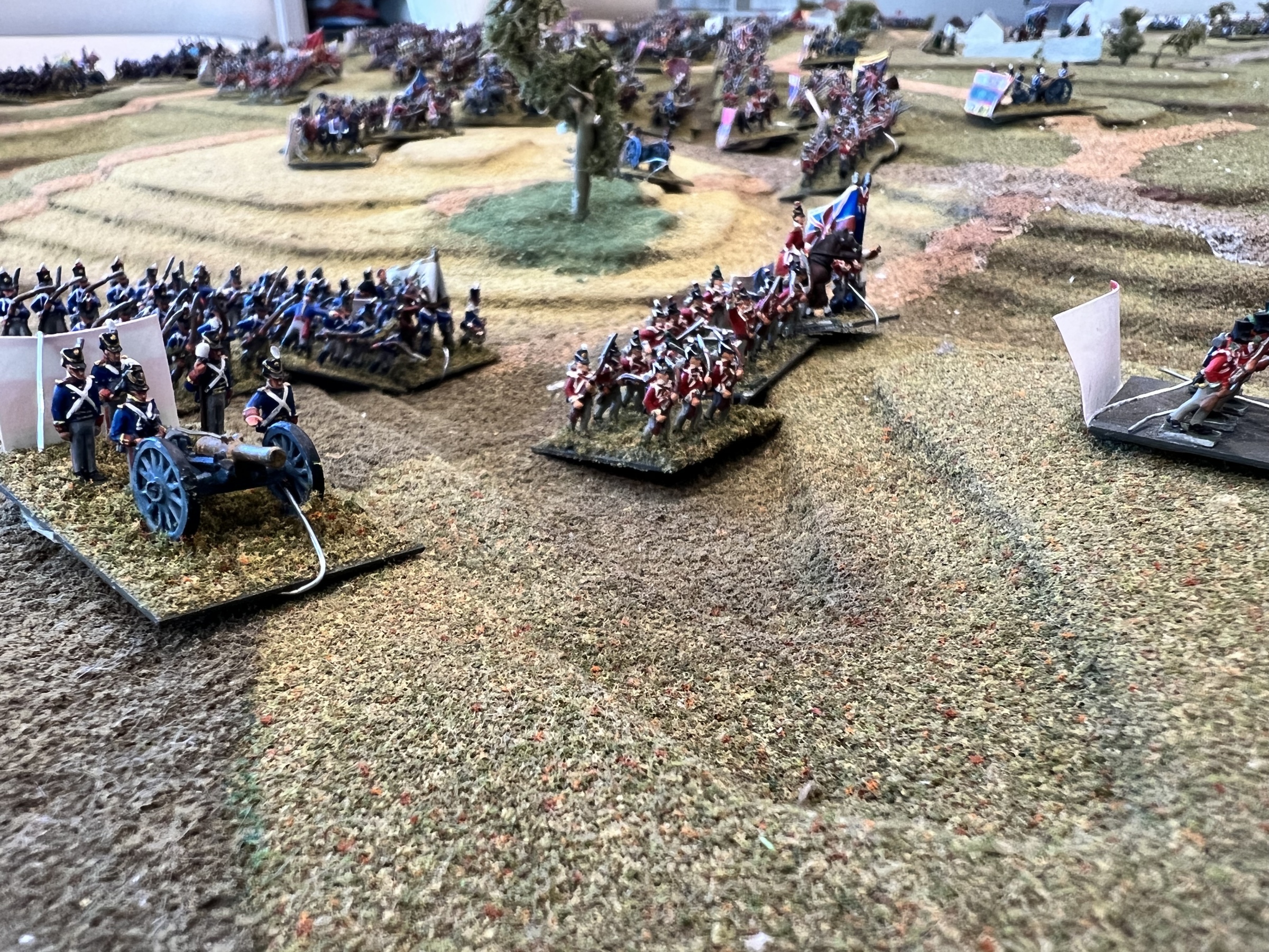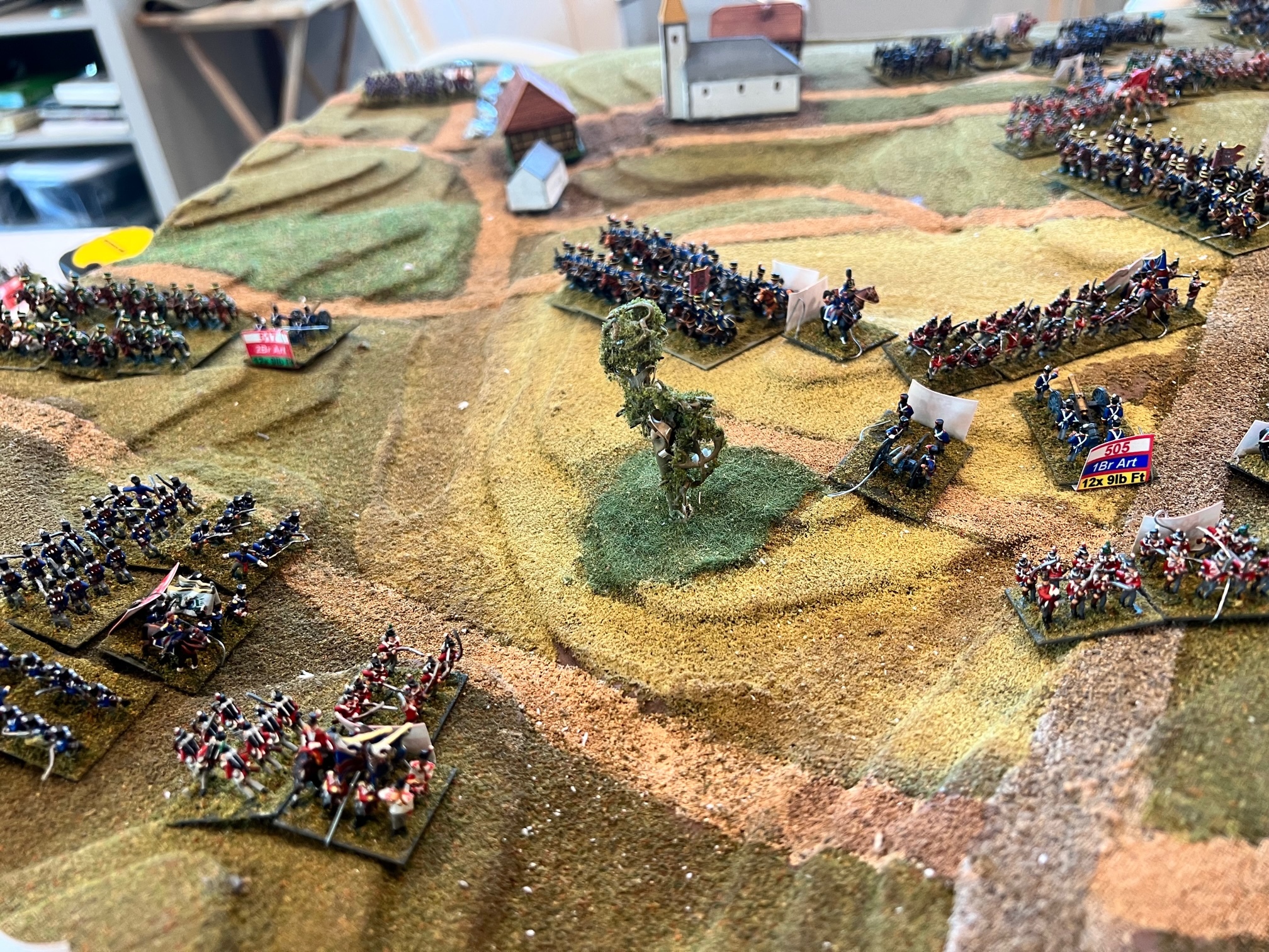 D’Erlon deploys his and the Guard Artillery along the rise running to his front, and a duel between his and Picton’s batteries along their line erupts. An hour of bombardment causes little loss on both sides, although both armies guns slow in pace as fatigue sets in.