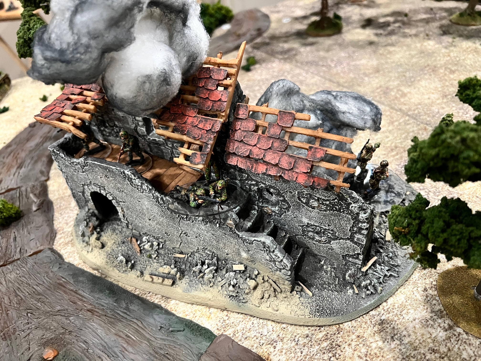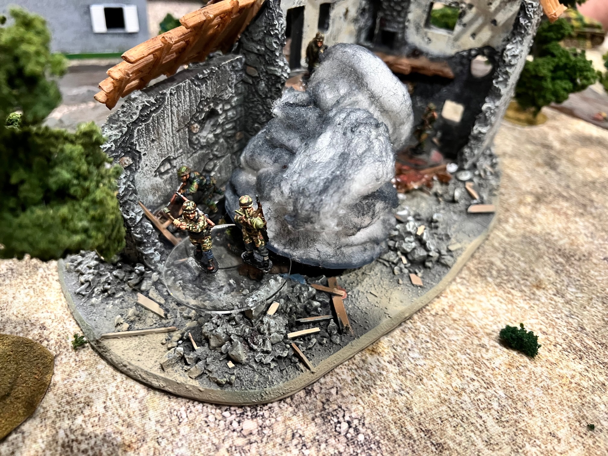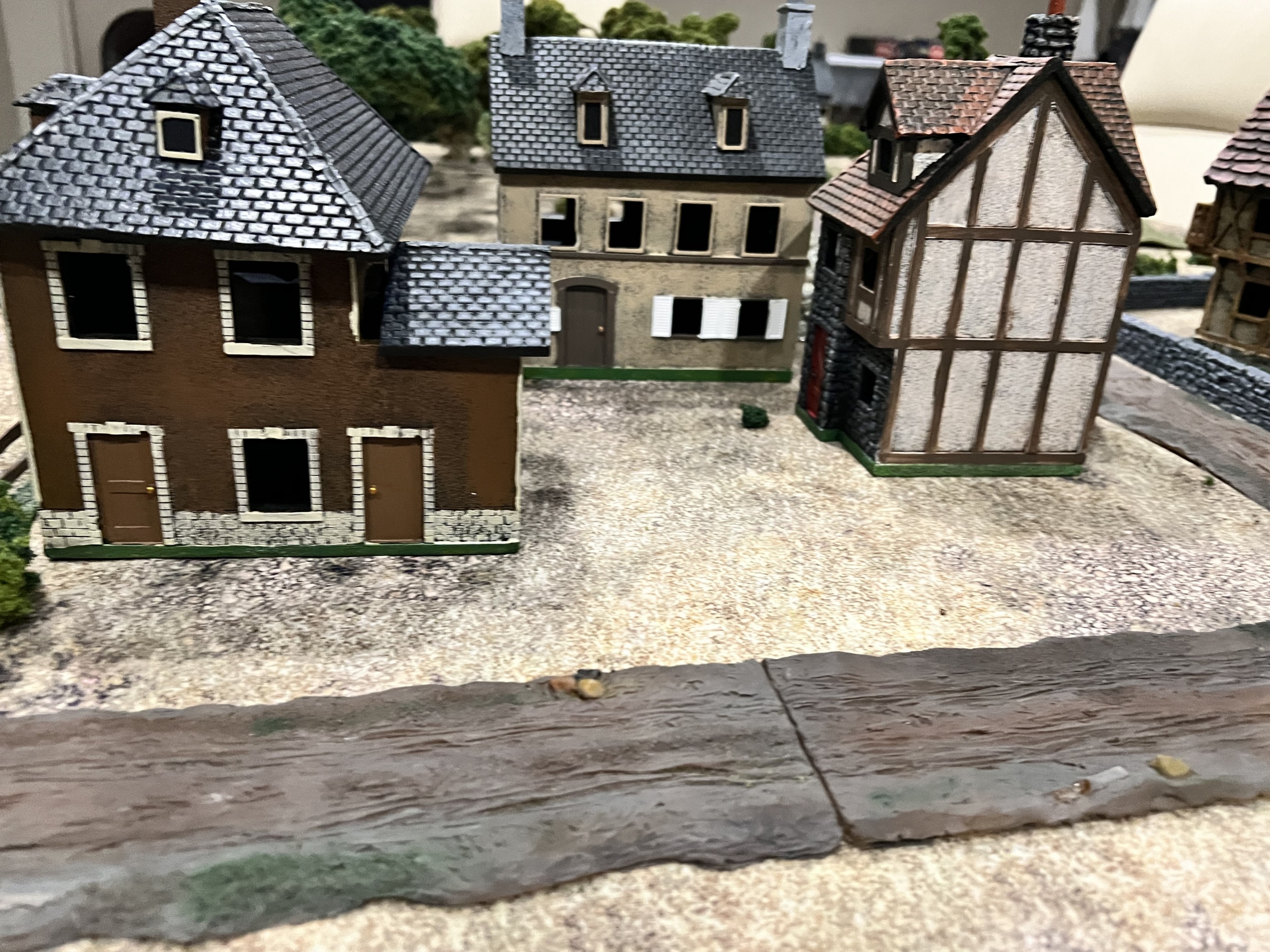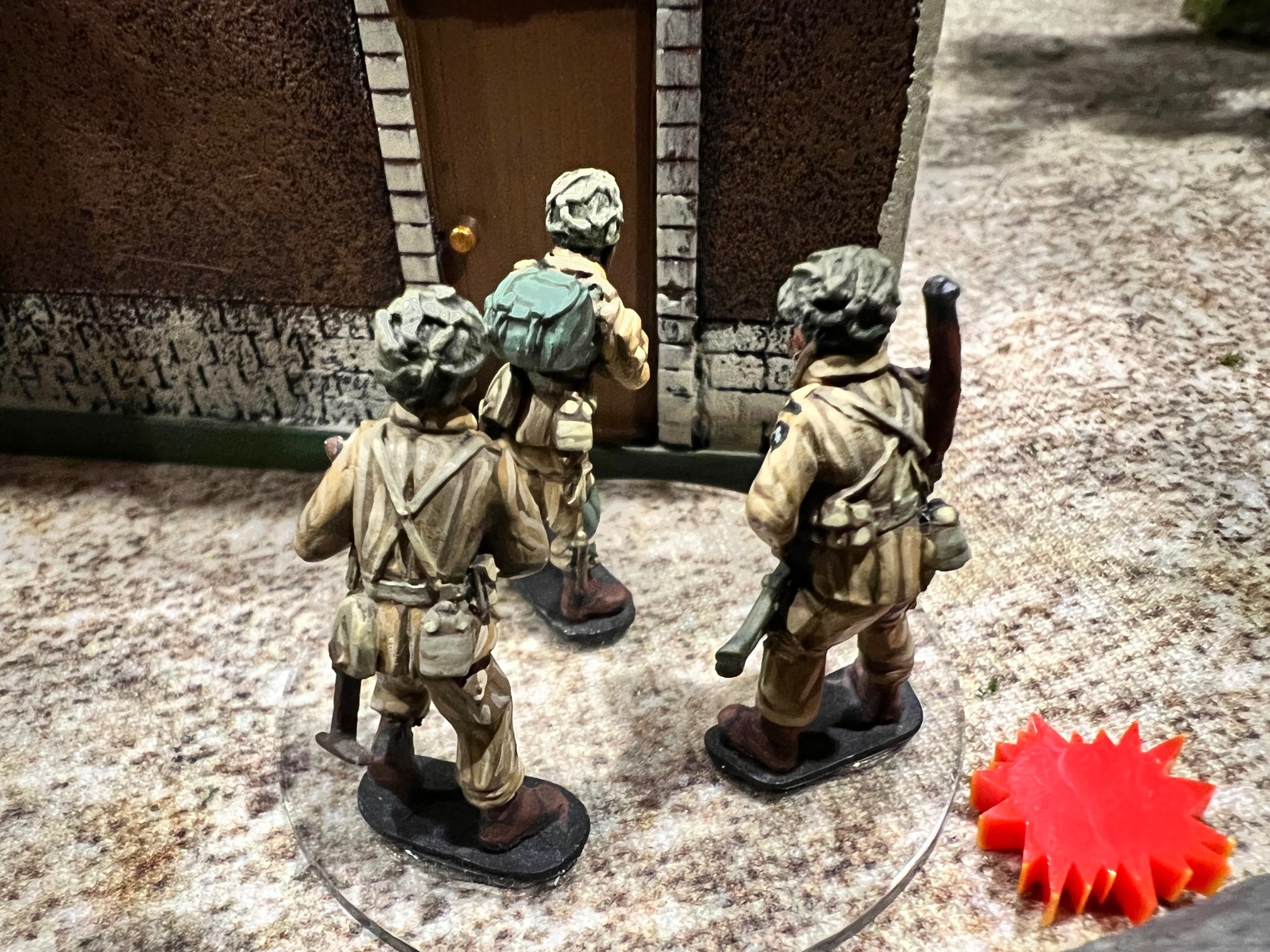 Back into the breach. Jim and Steve played the 1sr Airborne while Lee and Jerry were the Germans. The game basically came down to the Germans trying a long range firefight in the open with the Americans who were hold up in buildings. Buildings won.