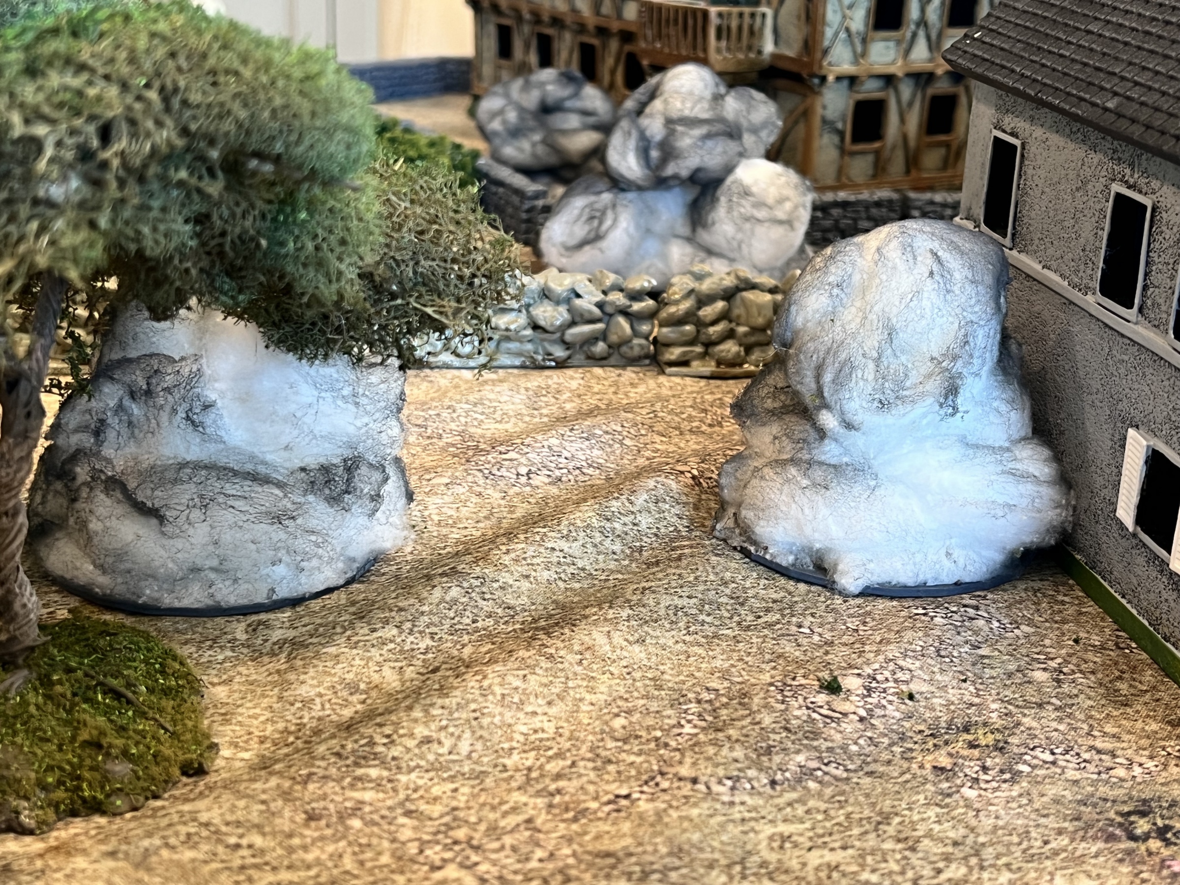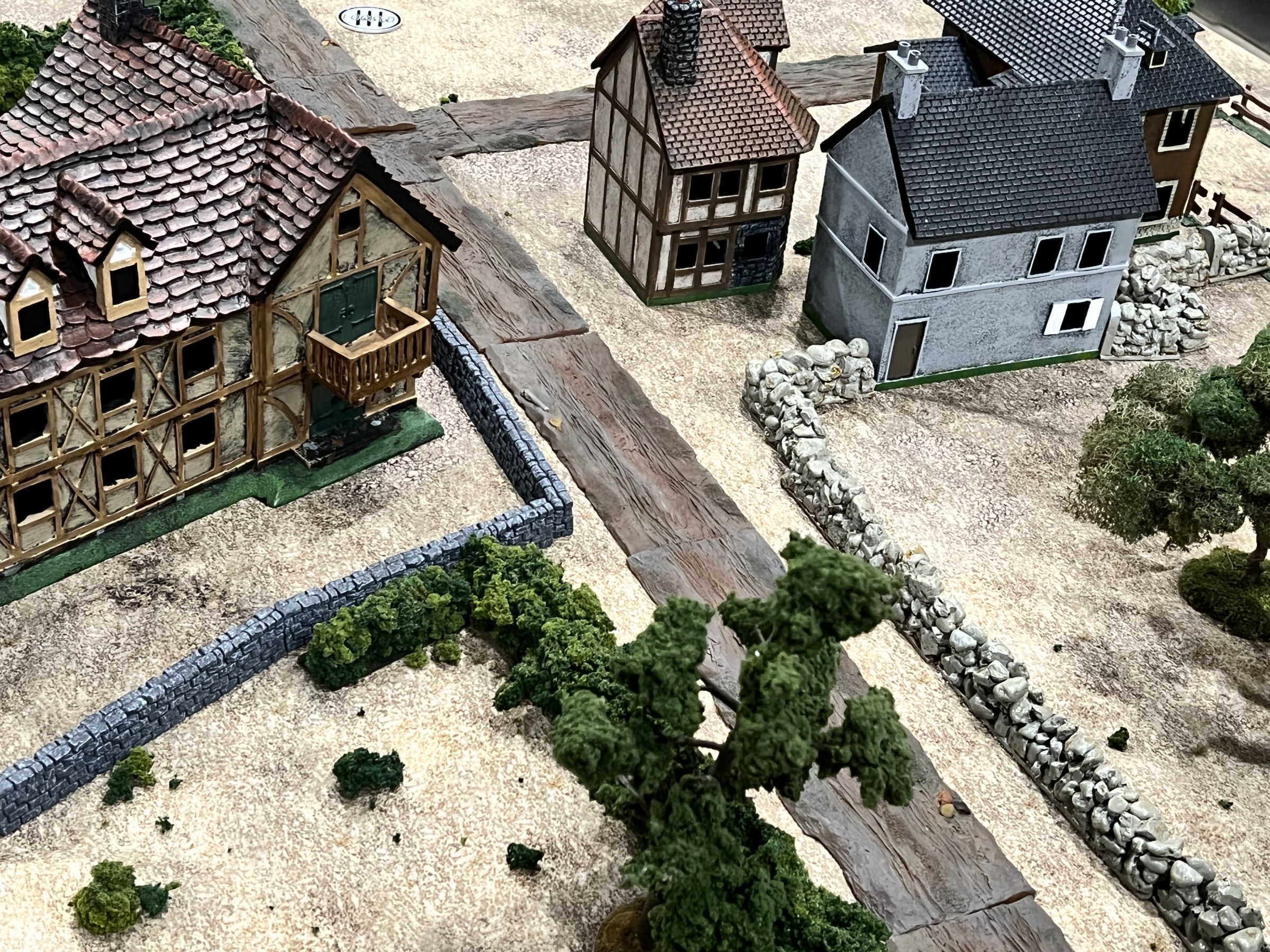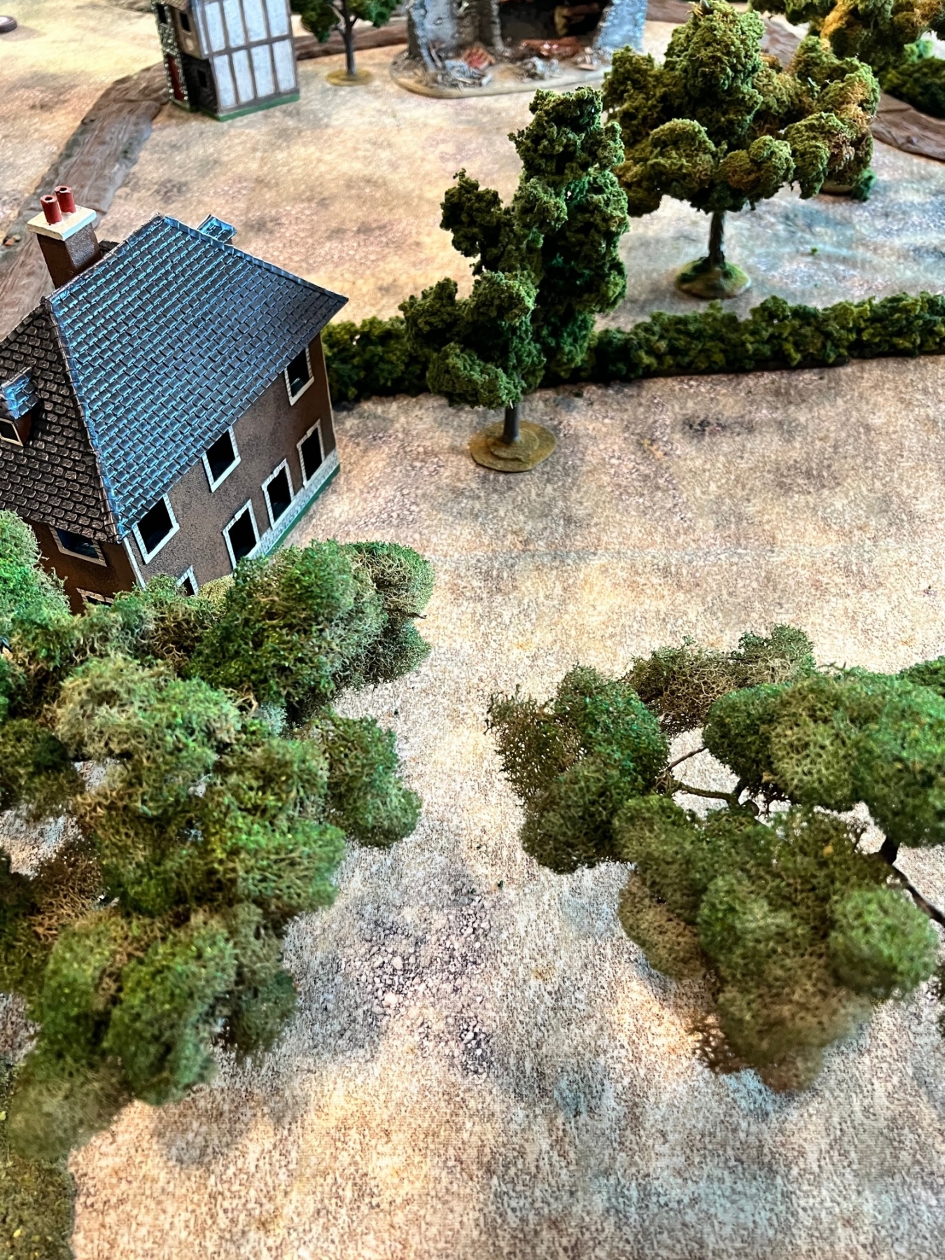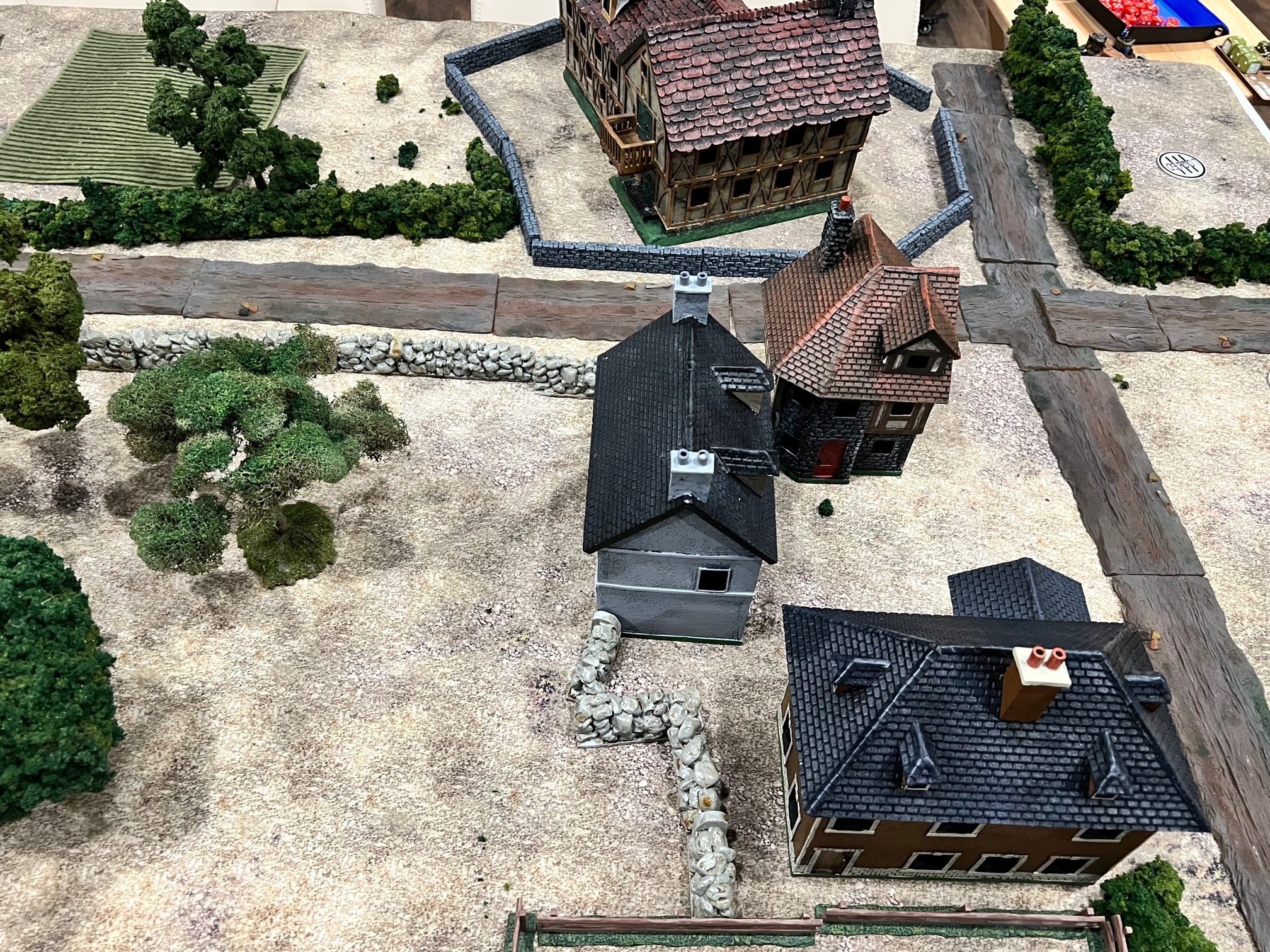 Back into the breach. Jim and Steve played the 1sr Airborne while Lee and Jerry were the Germans. The game basically came down to the Germans trying a long range firefight in the open with the Americans who were hold up in buildings. Buildings won.