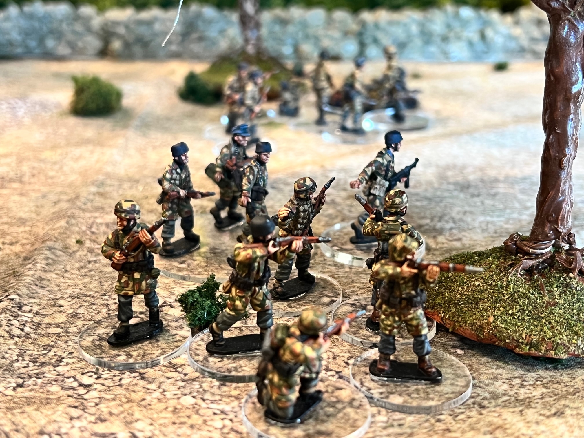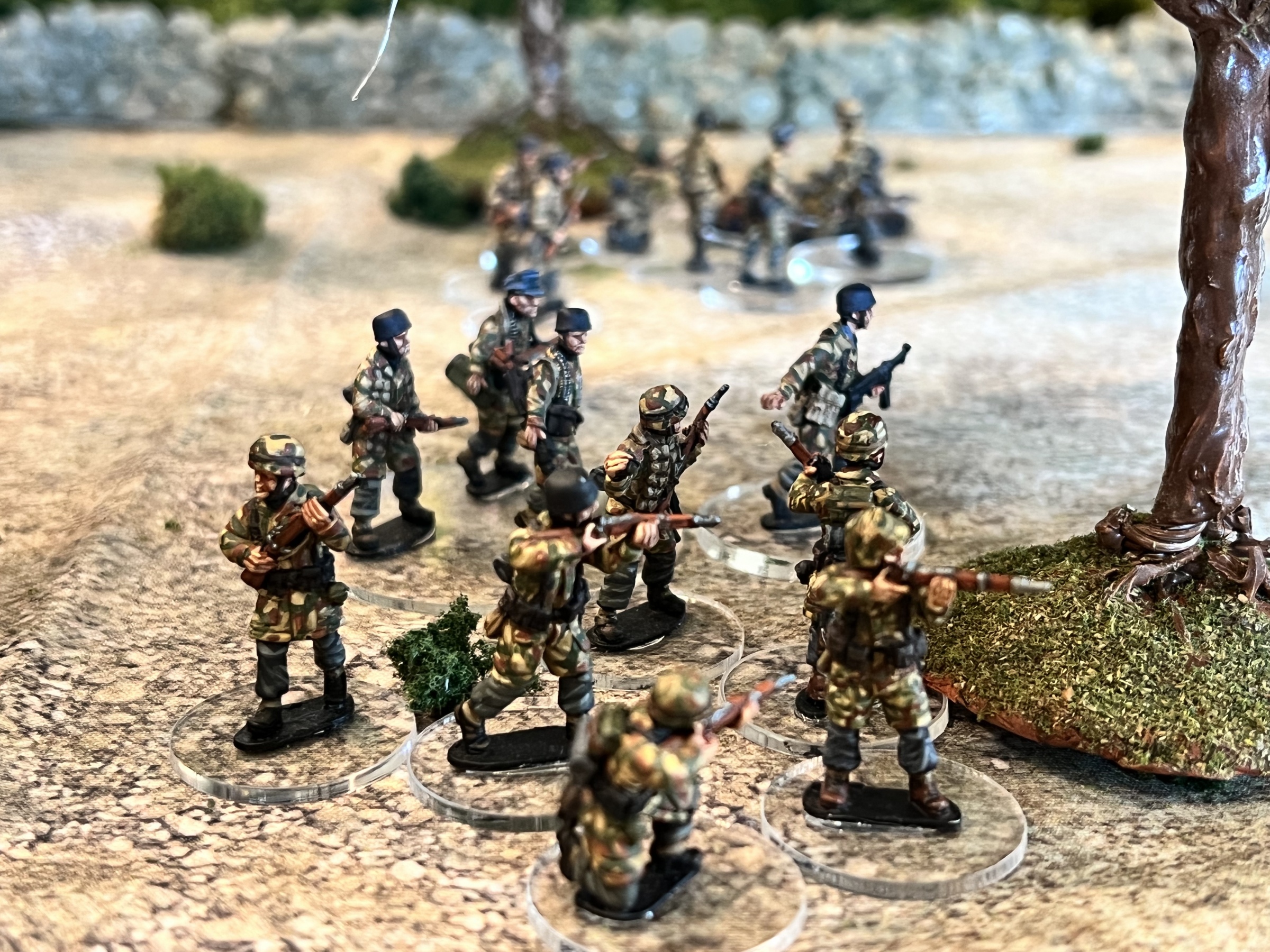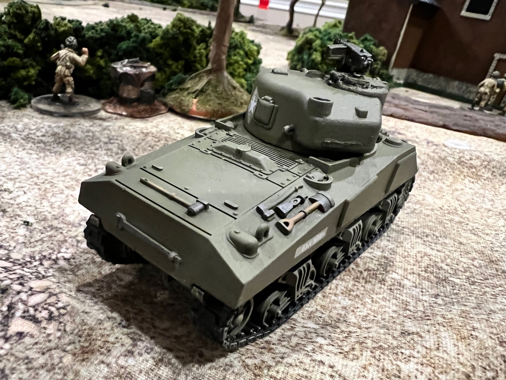 A quick game of Chain of Command. Wigs Graves, a local gamer from a long long time ago who now lives in a galaxy far far away.. Arizona, came to town. Wigs and Jim played the evil Nazis.. The righteous US paratroopers were played by Brian and Lee while an armour attachment of Shermans was played by Richard. After the initial contact, the Germans lost interest in the exchange due to catastrophic loses.