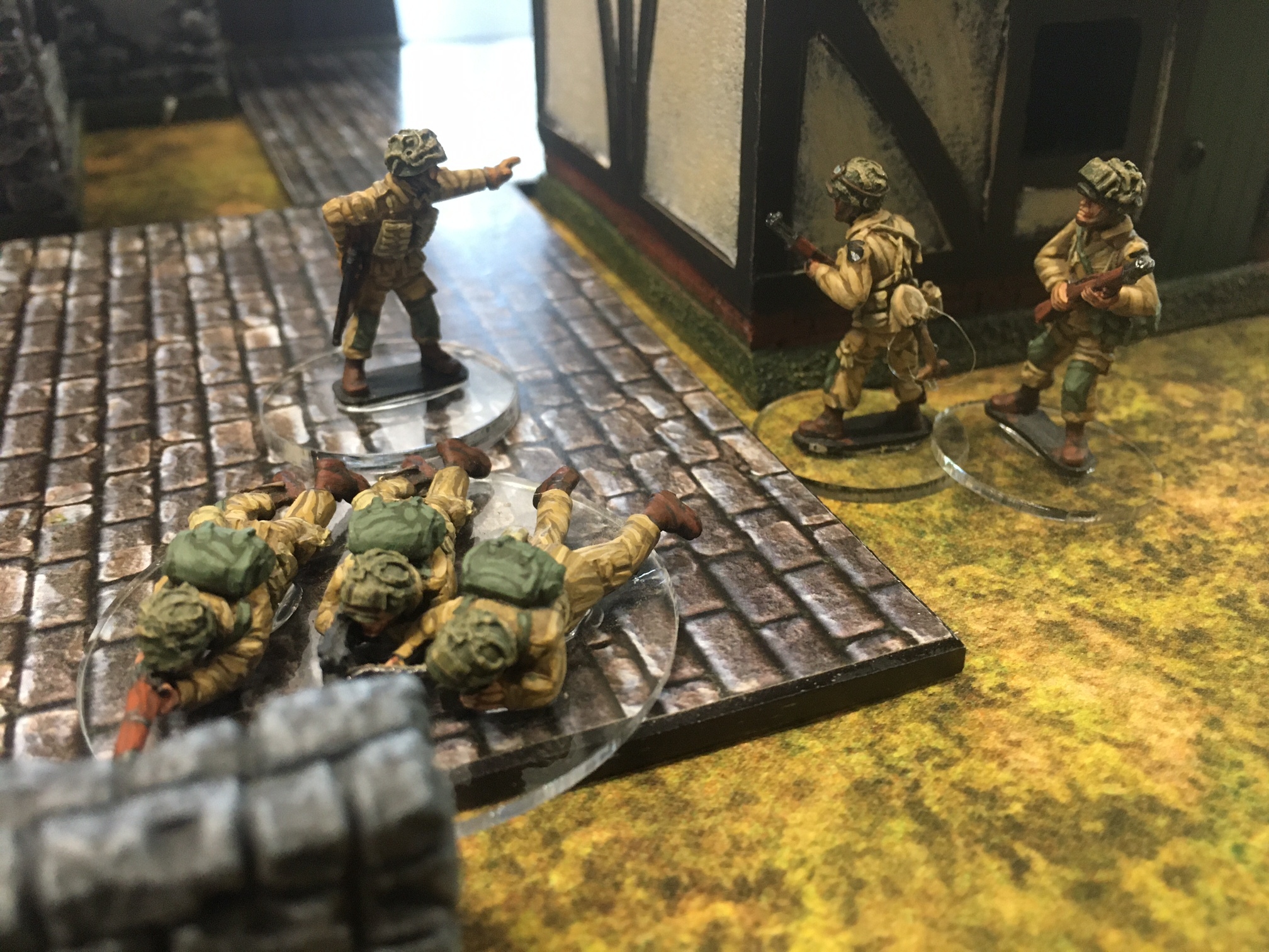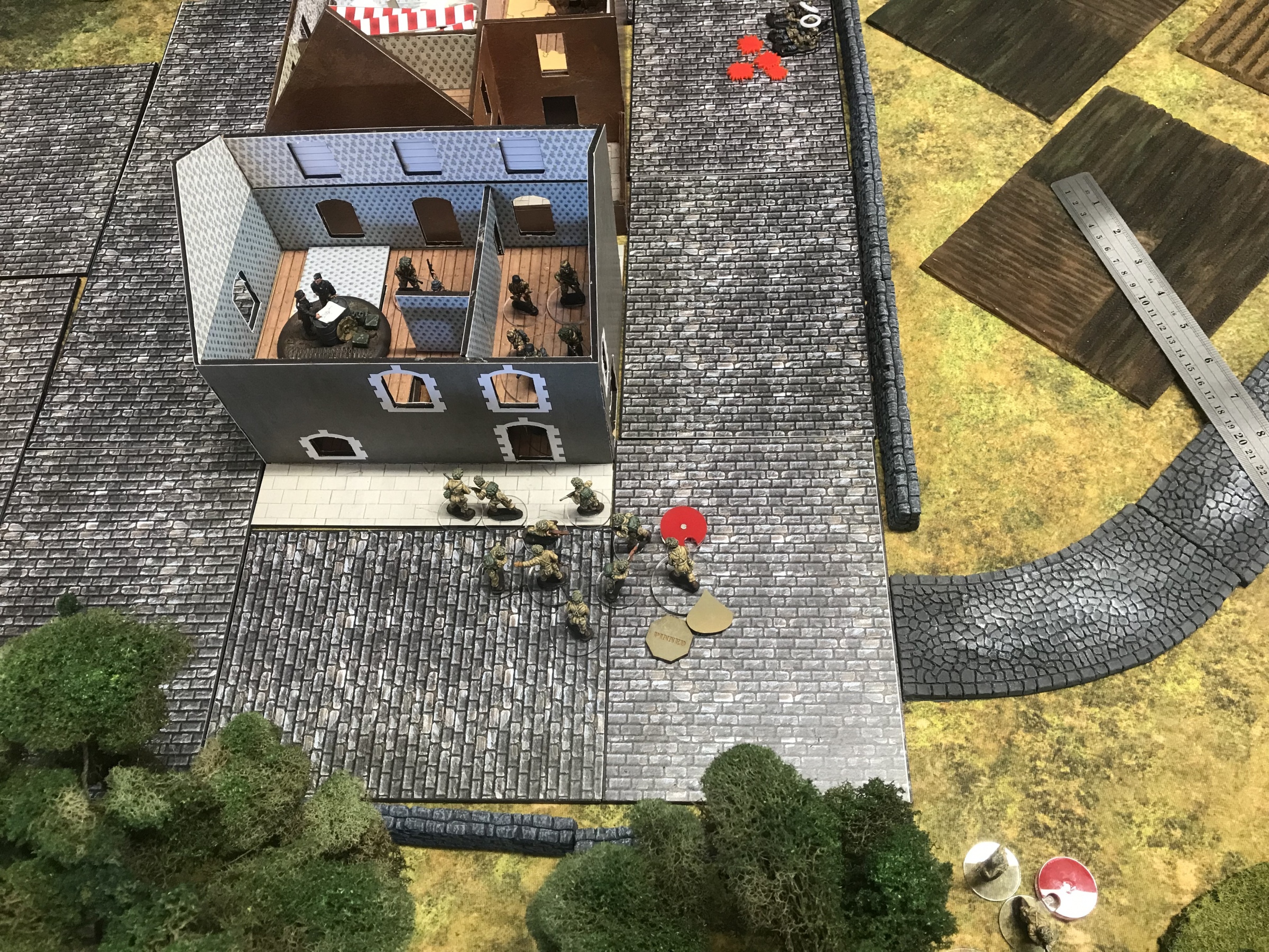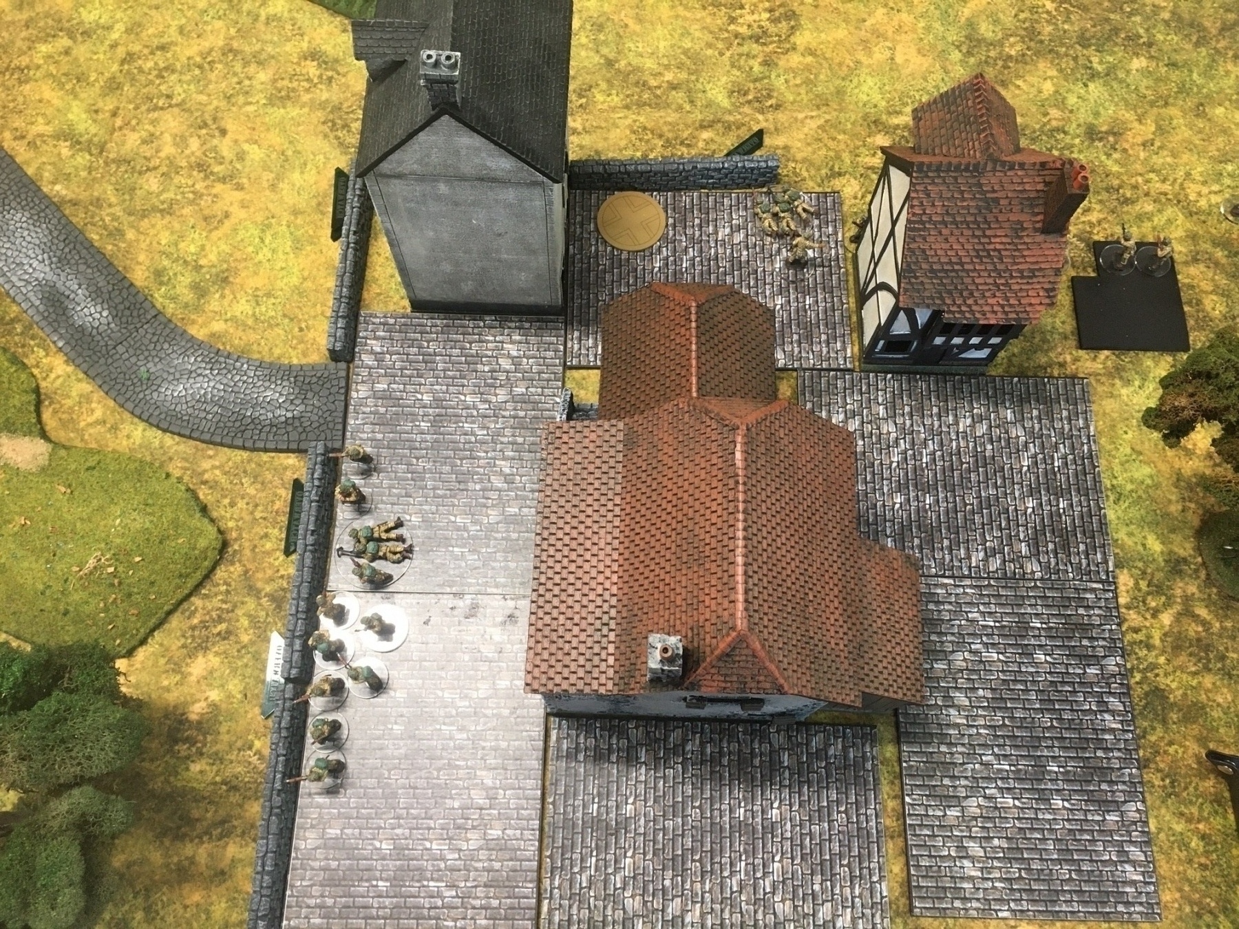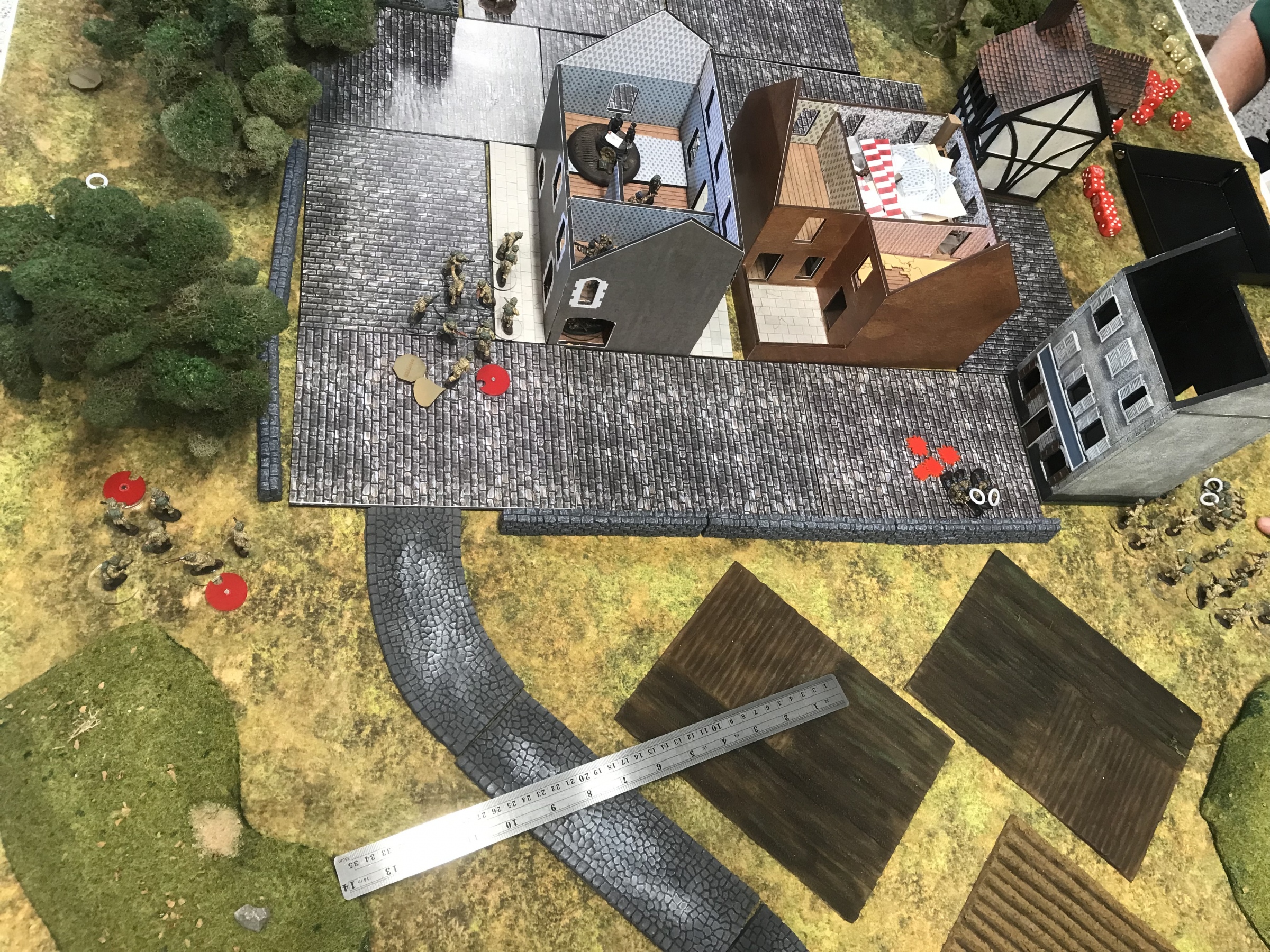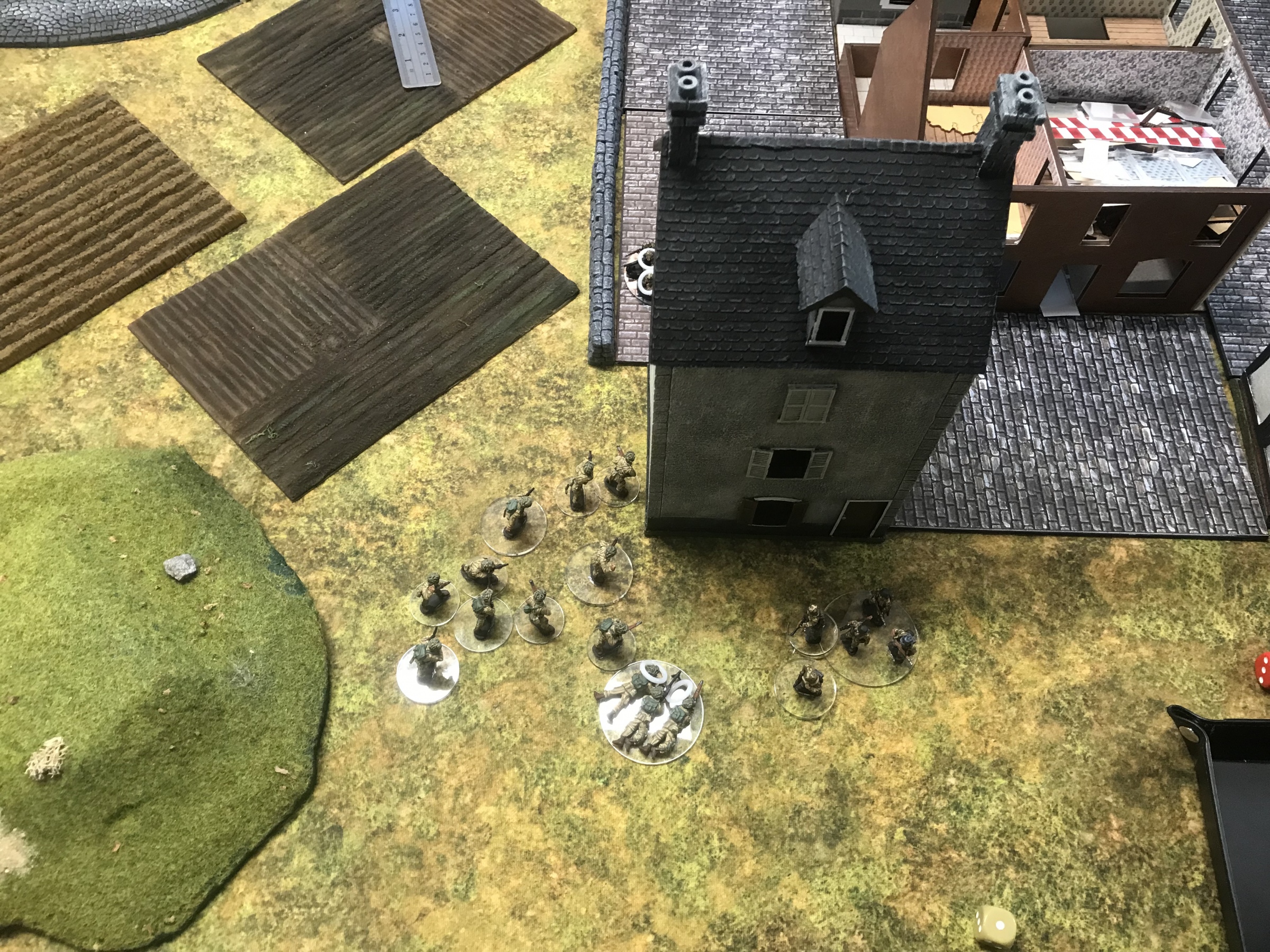 A meeting engagement of the American 101st Airborne (Richard and Lee) and German Waffen SS (Jim and Brian). The airborne occupied the towne and and an adjacent hill. The Americans repulsed an initial attacked on the towne and destroyed a PAK. The Germans then brought in a heavy mortar and pinned the Americans and preceded to kill off the Americans in the towne. The Americans surrendered and later were found in a mass grave. SS-Obersturmführer Dumeister was later convicted of war crimes after the war but got off on a legal technicality and migrated to Argentina to become a children’s war game author.