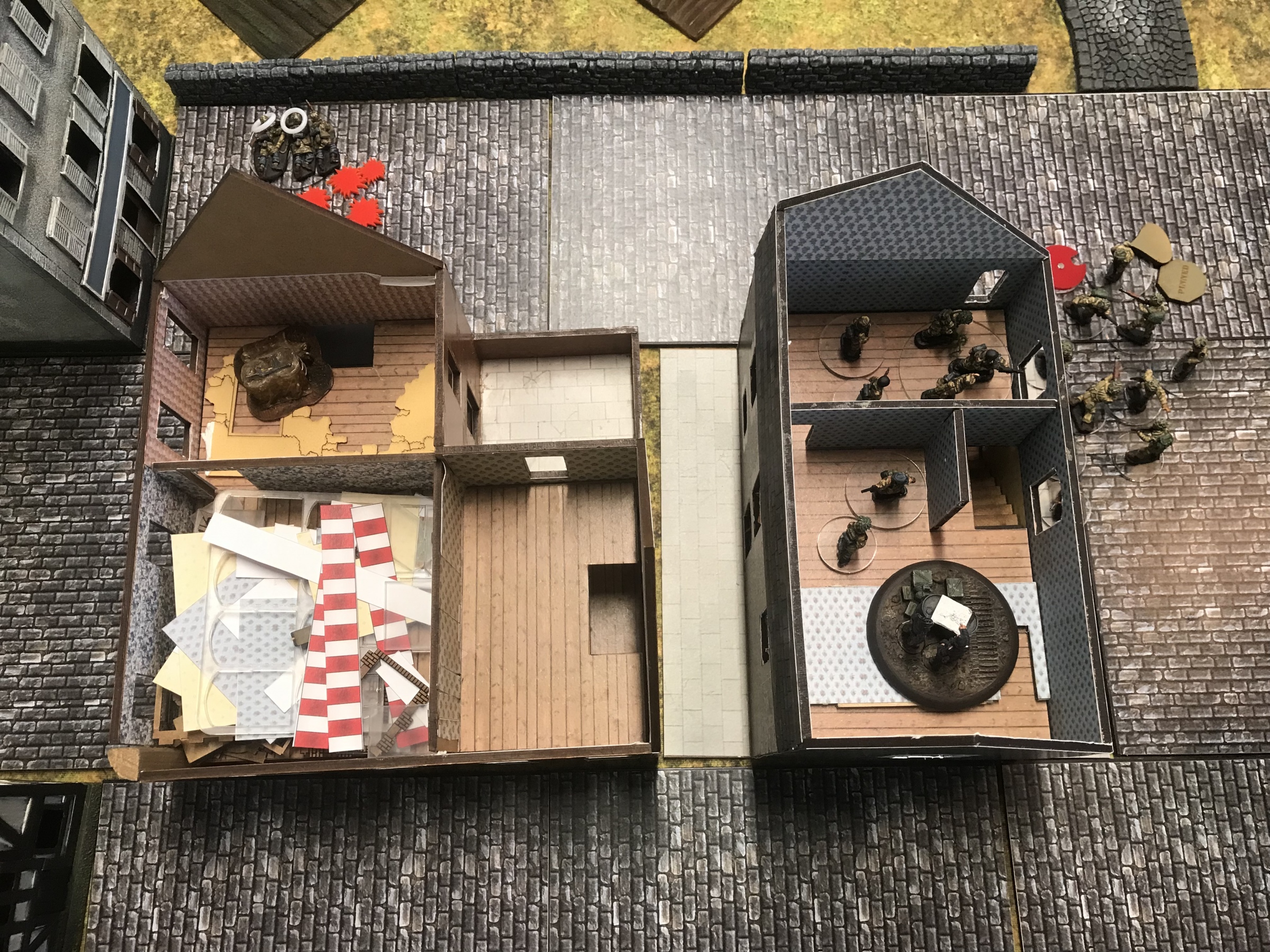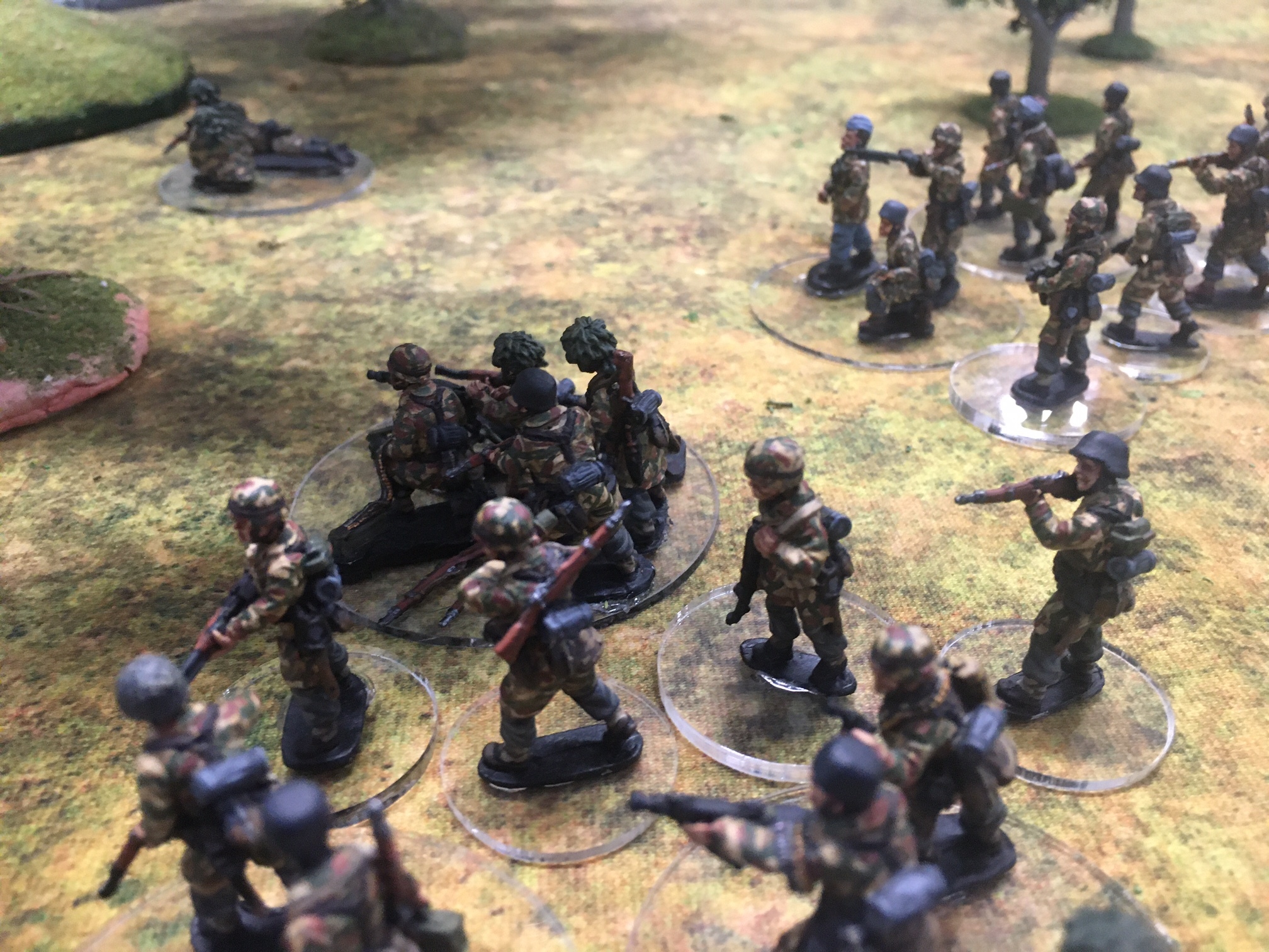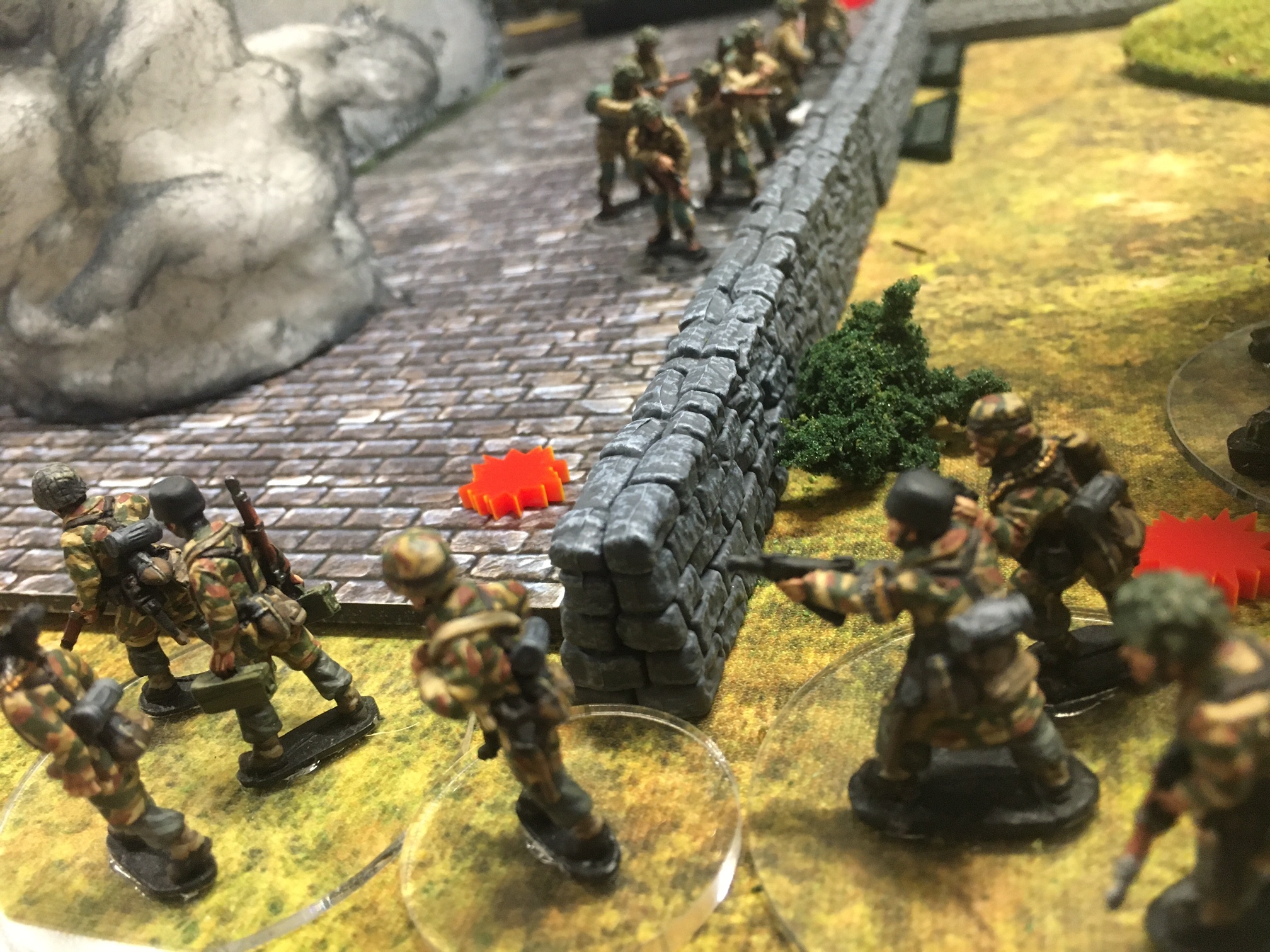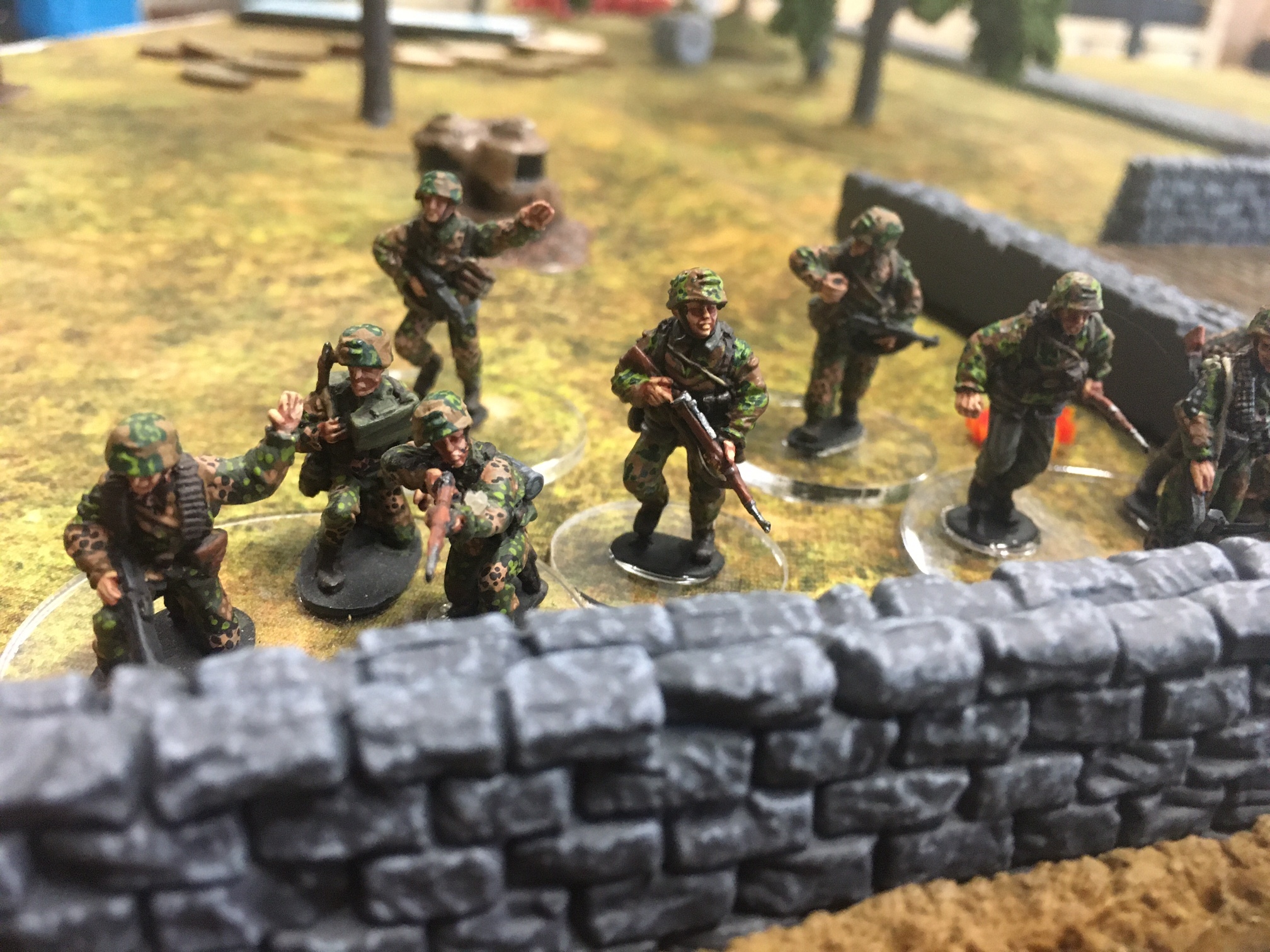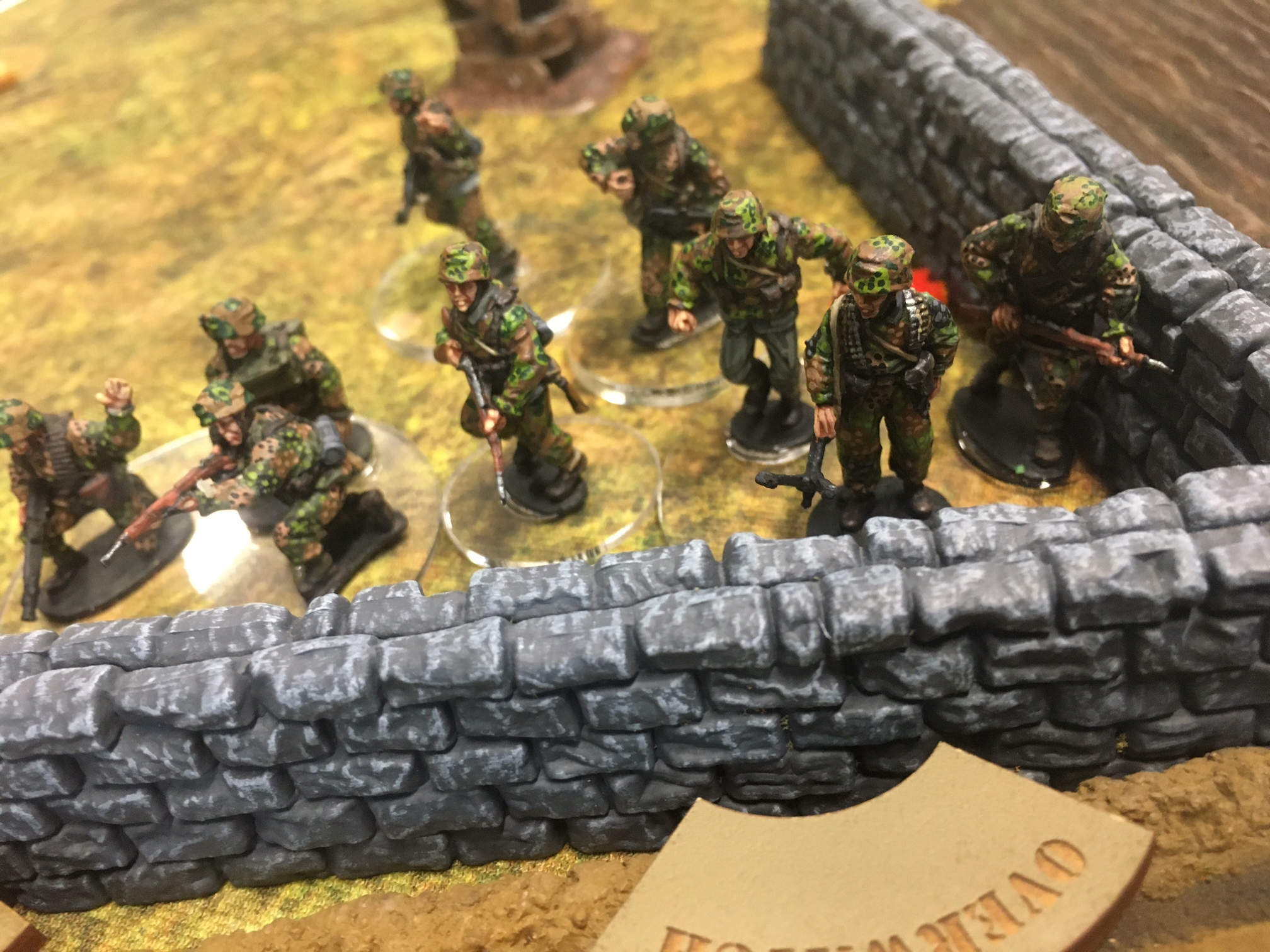 A meeting engagement of the American 101st Airborne (Richard and Lee) and German Waffen SS (Jim and Brian). The airborne occupied the towne and and an adjacent hill. The Americans repulsed an initial attacked on the towne and destroyed a PAK. The Germans then brought in a heavy mortar and pinned the Americans and preceded to kill off the Americans in the towne. The Americans surrendered and later were found in a mass grave. SS-Obersturmführer Dumeister was later convicted of war crimes after the war but got off on a legal technicality and migrated to Argentina to become a children’s war game author.