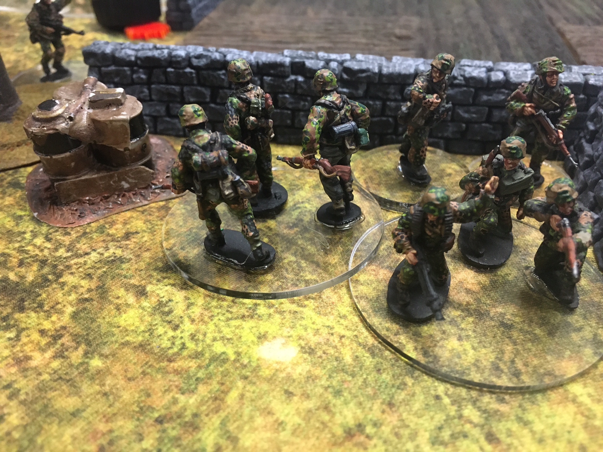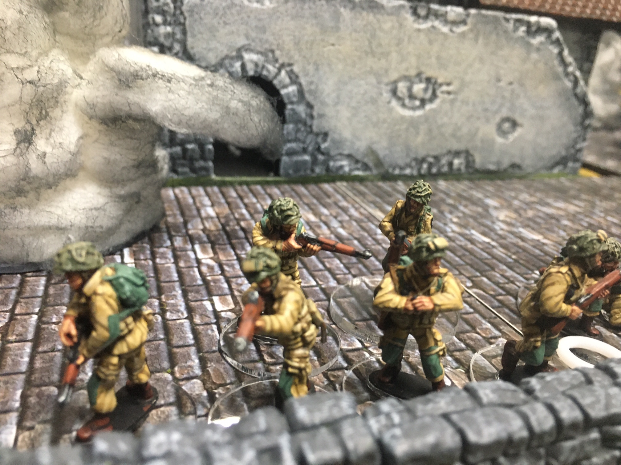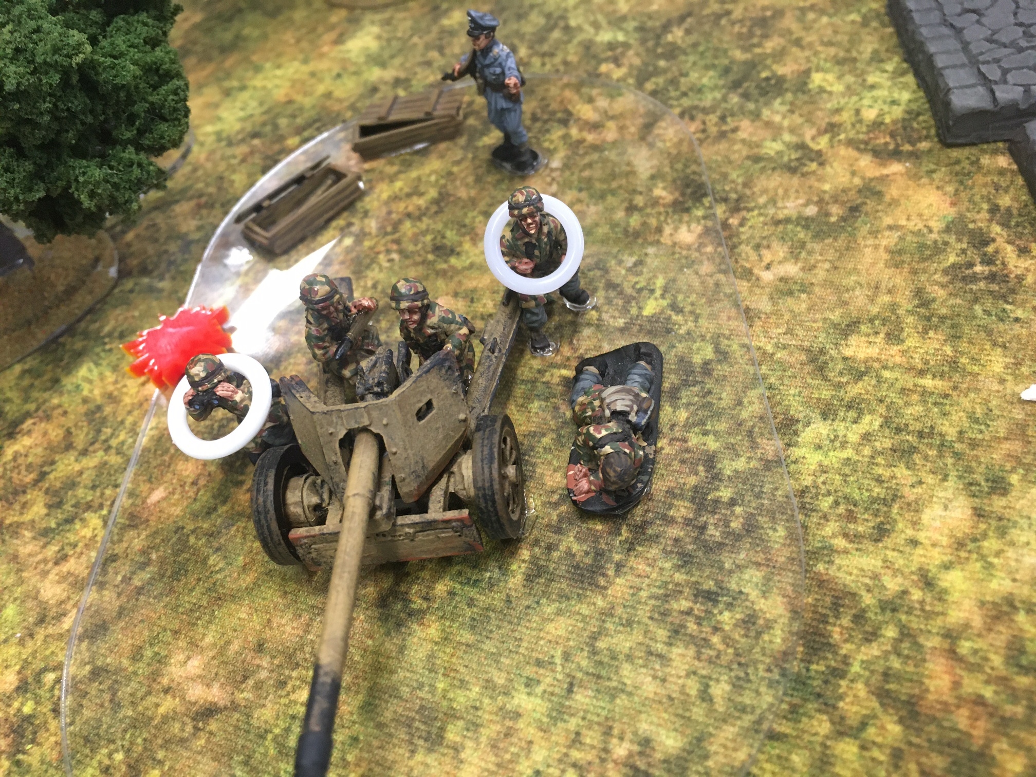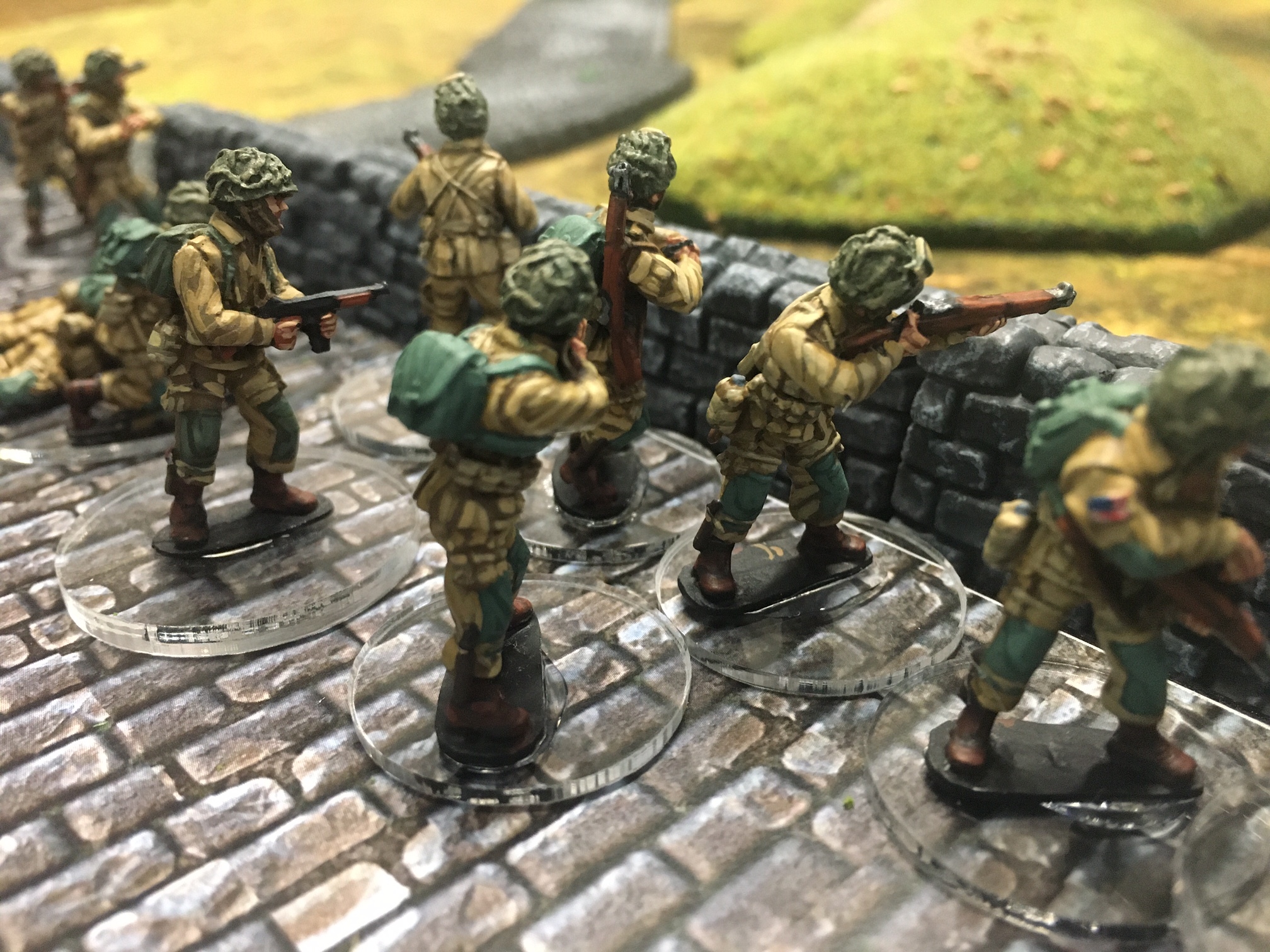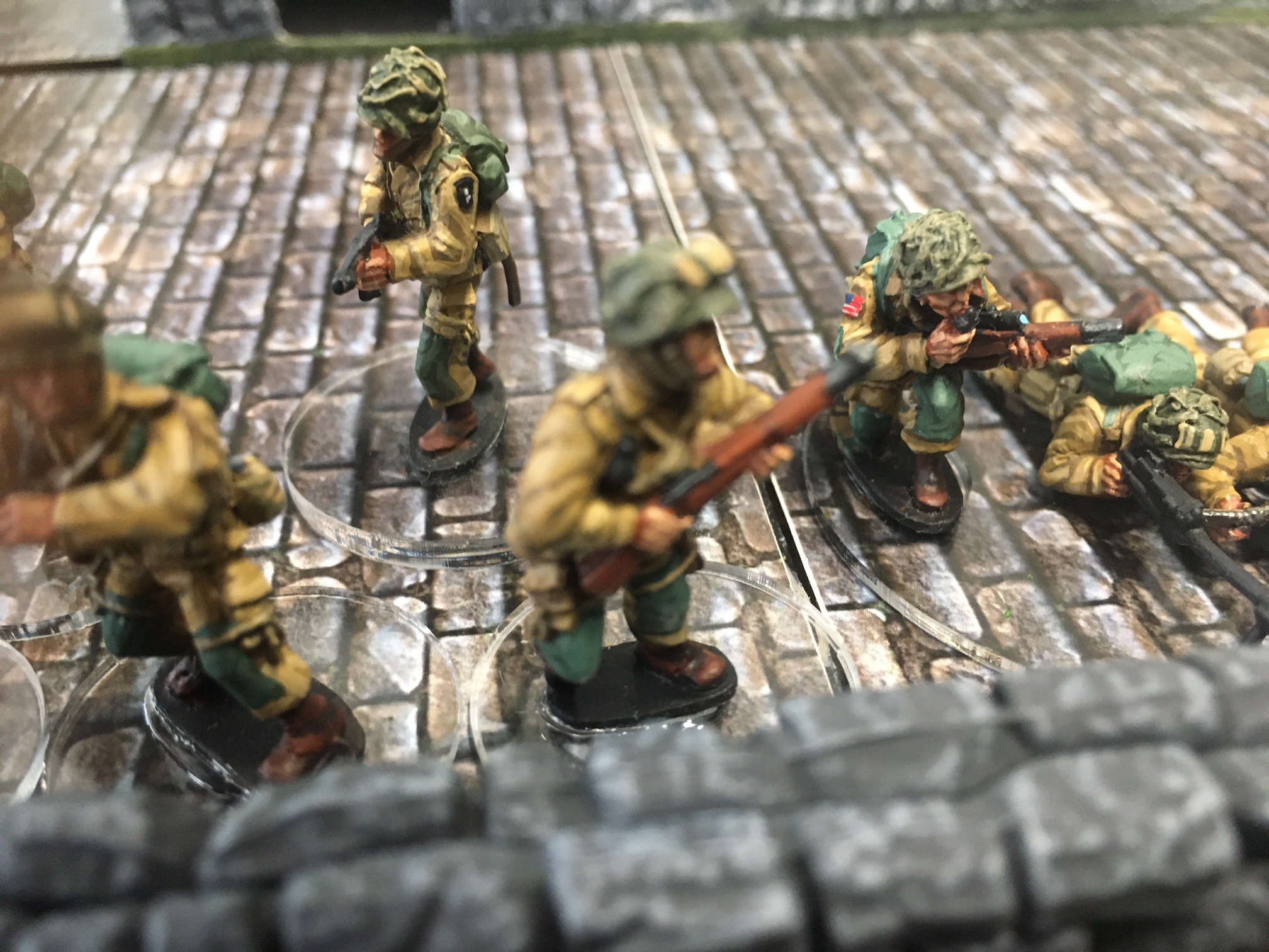 A meeting engagement of the American 101st Airborne (Richard and Lee) and German Waffen SS (Jim and Brian). The airborne occupied the towne and and an adjacent hill. The Americans repulsed an initial attacked on the towne and destroyed a PAK. The Germans then brought in a heavy mortar and pinned the Americans and preceded to kill off the Americans in the towne. The Americans surrendered and later were found in a mass grave. SS-Obersturmführer Dumeister was later convicted of war crimes after the war but got off on a legal technicality and migrated to Argentina to become a children’s war game author.