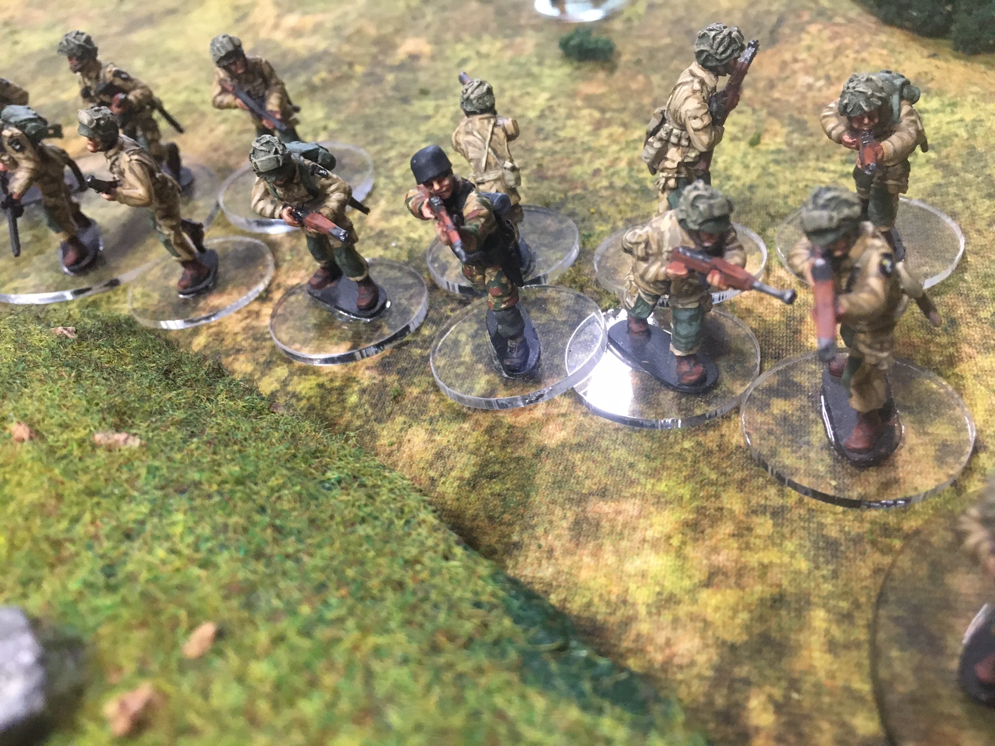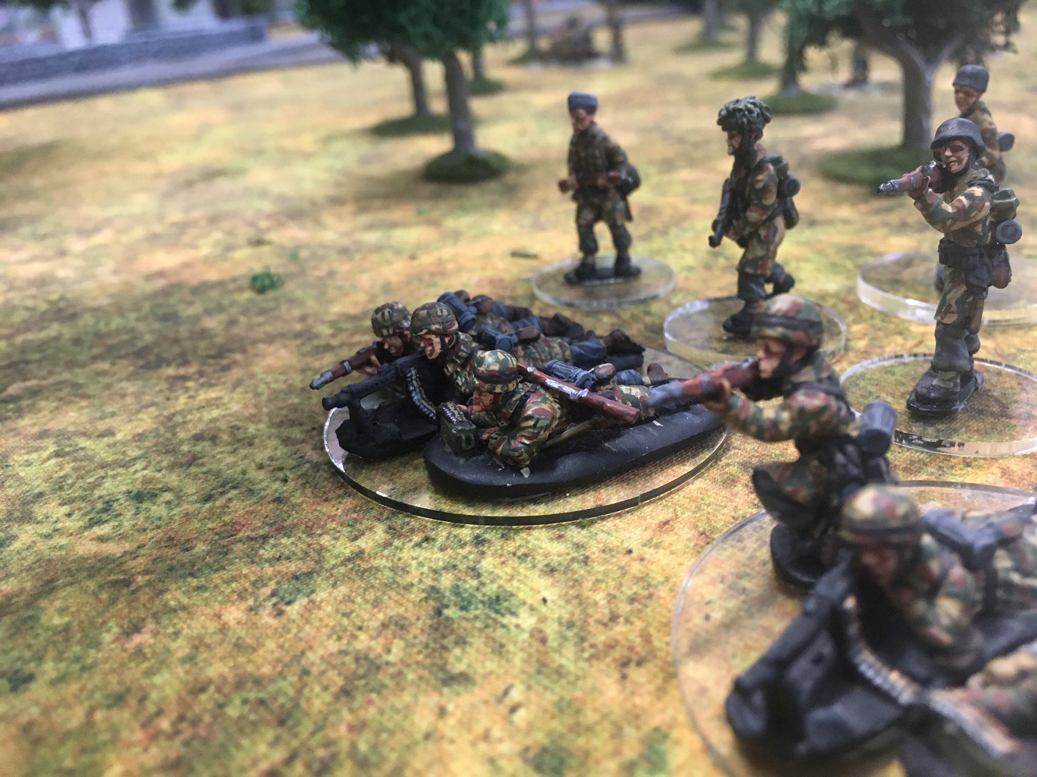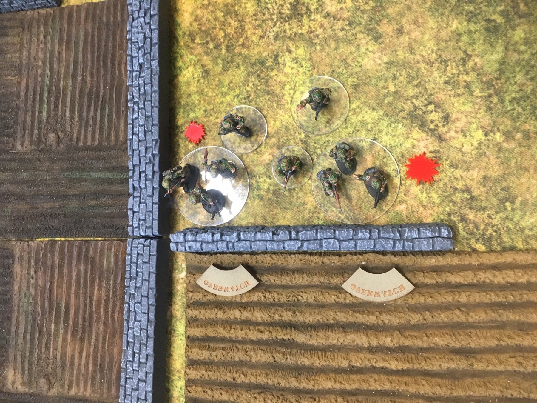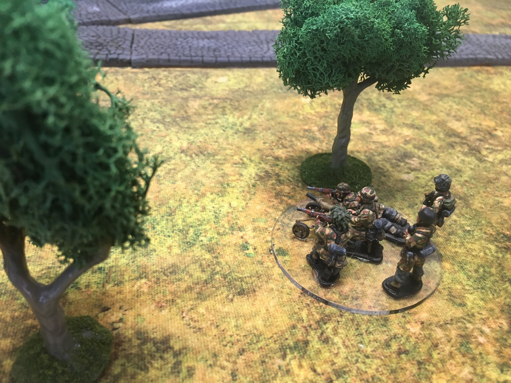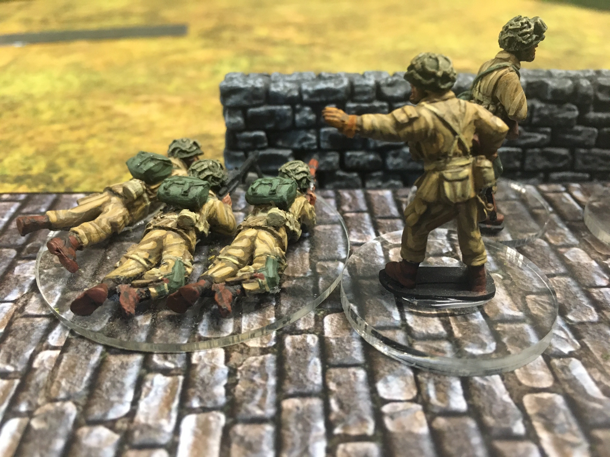A meeting engagement of the American 101st Airborne (Richard and Lee) and German Waffen SS (Jim and Brian). The airborne occupied the towne and and an adjacent hill. The Americans repulsed an initial attacked on the towne and destroyed a PAK. The Germans then brought in a heavy mortar and pinned the Americans and preceded to kill off the Americans in the towne. The Americans surrendered and later were found in a mass grave. SS-Obersturmführer Dumeister was later convicted of war crimes after the war but got off on a legal technicality and migrated to Argentina to become a children’s war game author.
