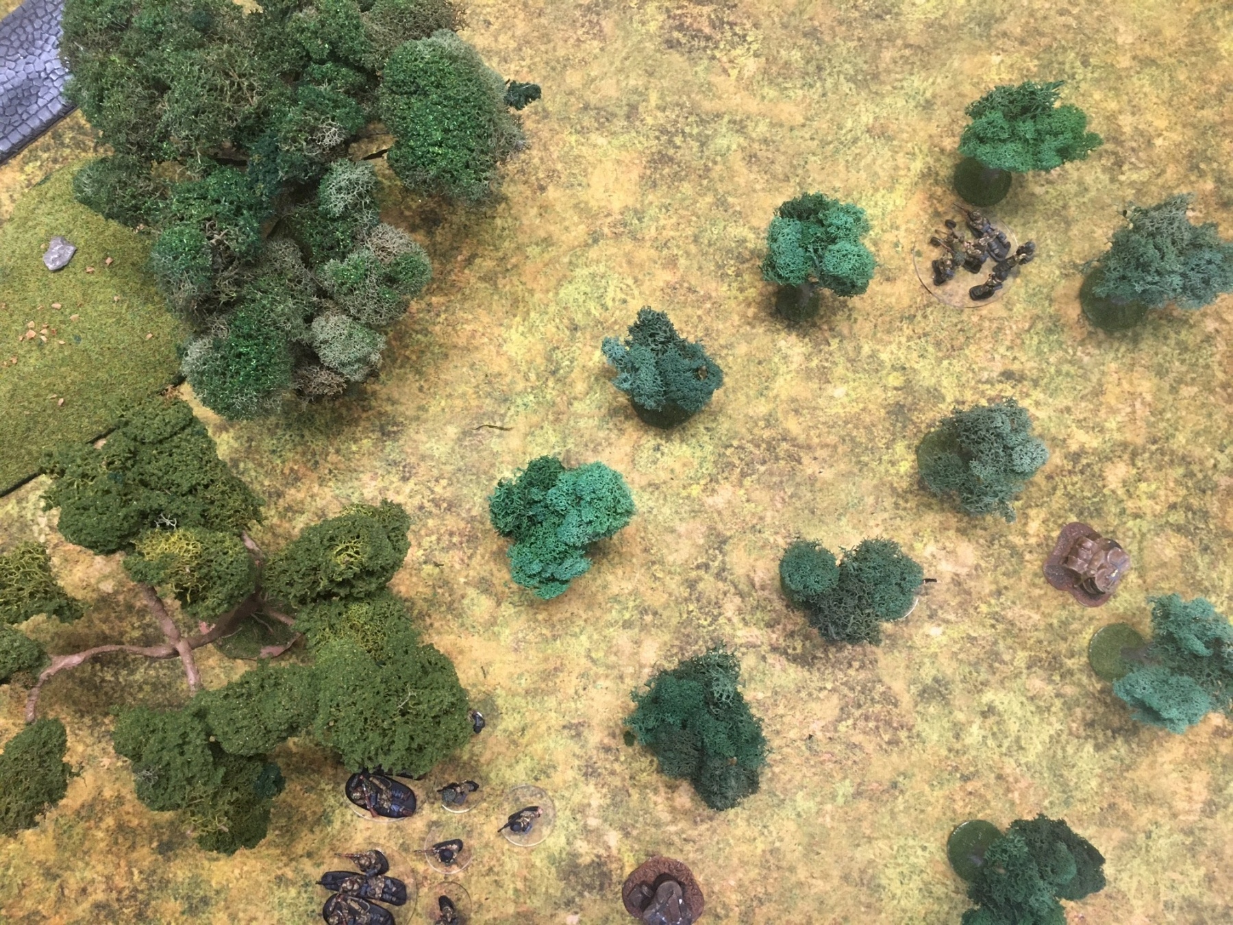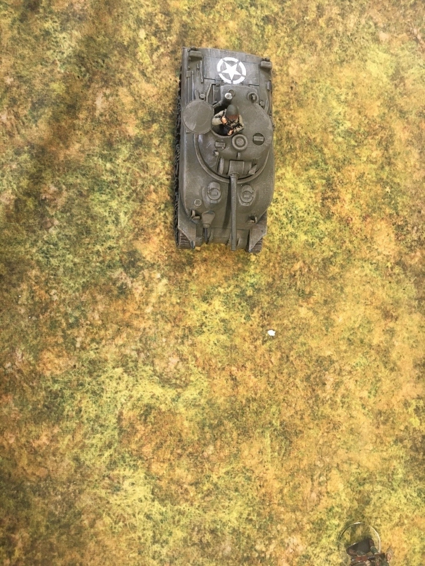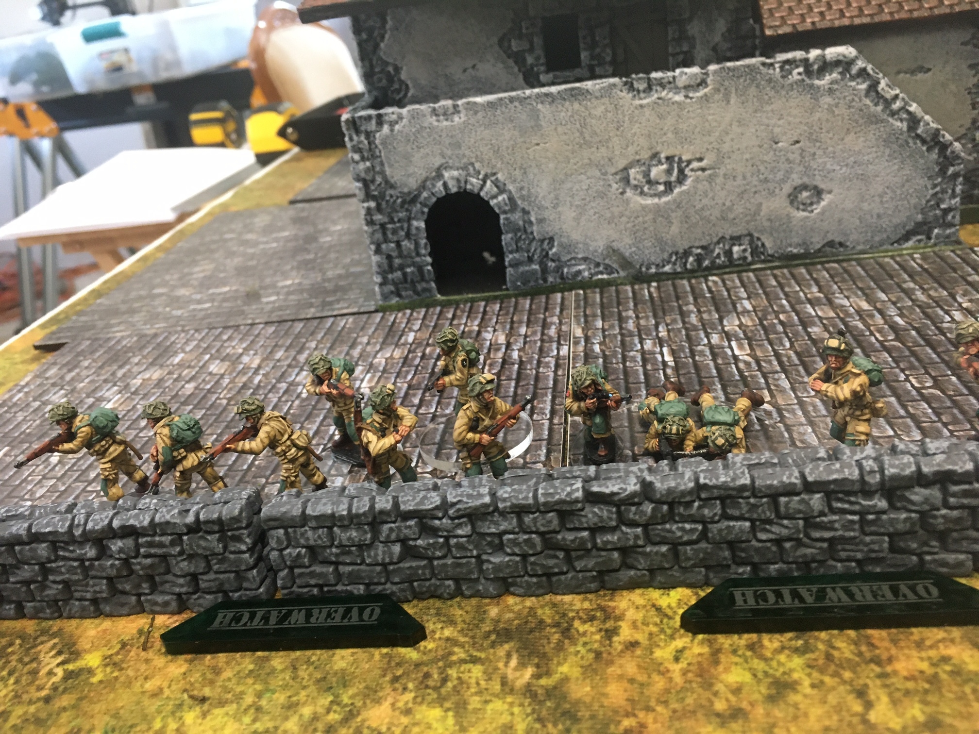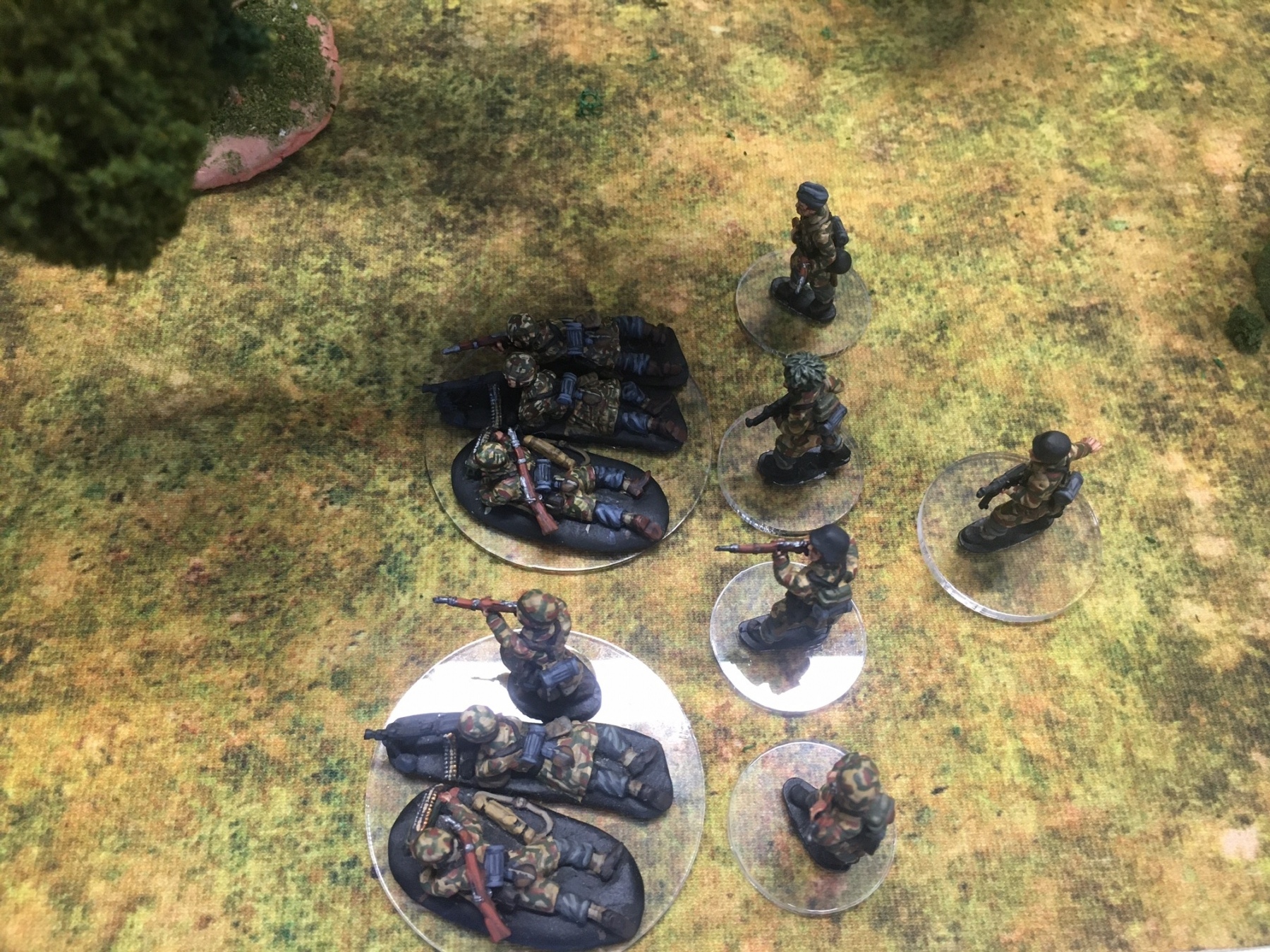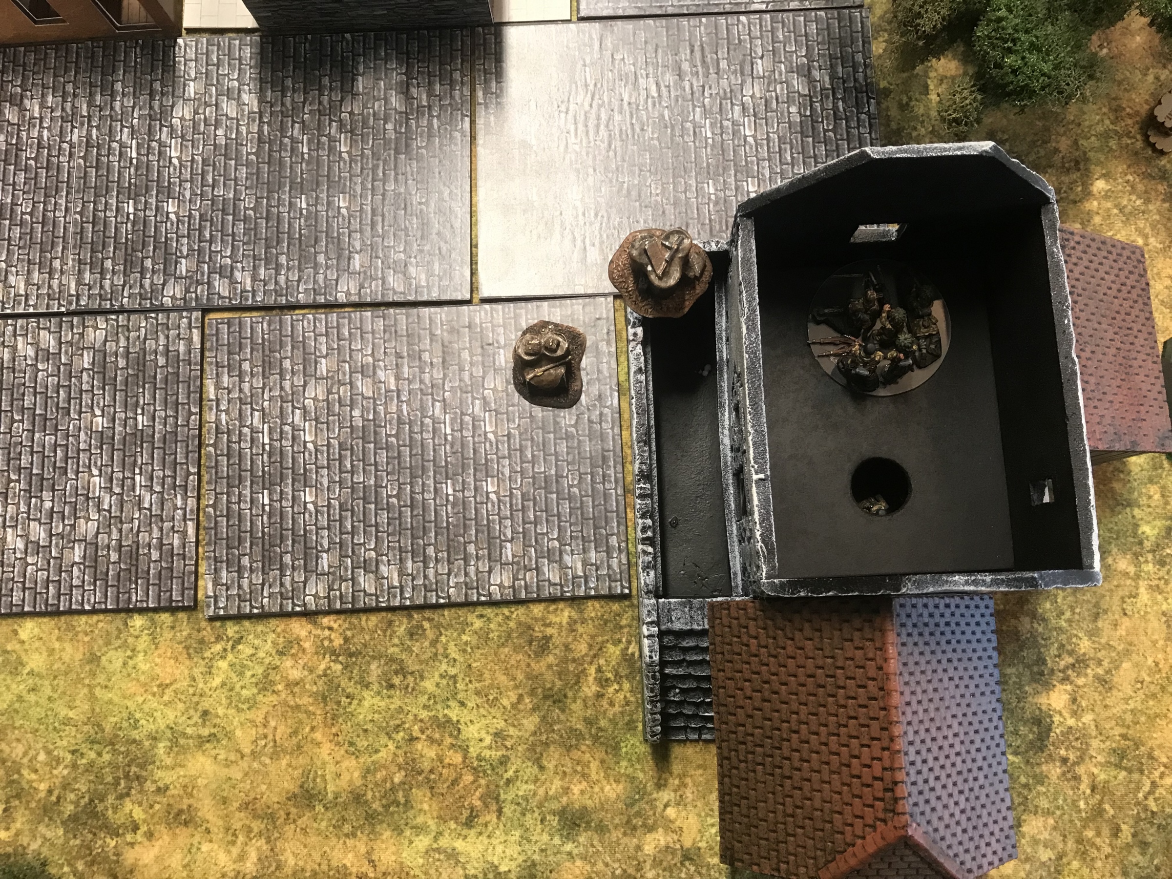 A meeting engagement of the American 101st Airborne (Richard and Lee) and German Waffen SS (Jim and Brian). The airborne occupied the towne and and an adjacent hill. The Americans repulsed an initial attacked on the towne and destroyed a PAK. The Germans then brought in a heavy mortar and pinned the Americans and preceded to kill off the Americans in the towne. The Americans surrendered and later were found in a mass grave. SS-Obersturmführer Dumeister was later convicted of war crimes after the war but got off on a legal technicality and migrated to Argentina to become a children’s war game author.